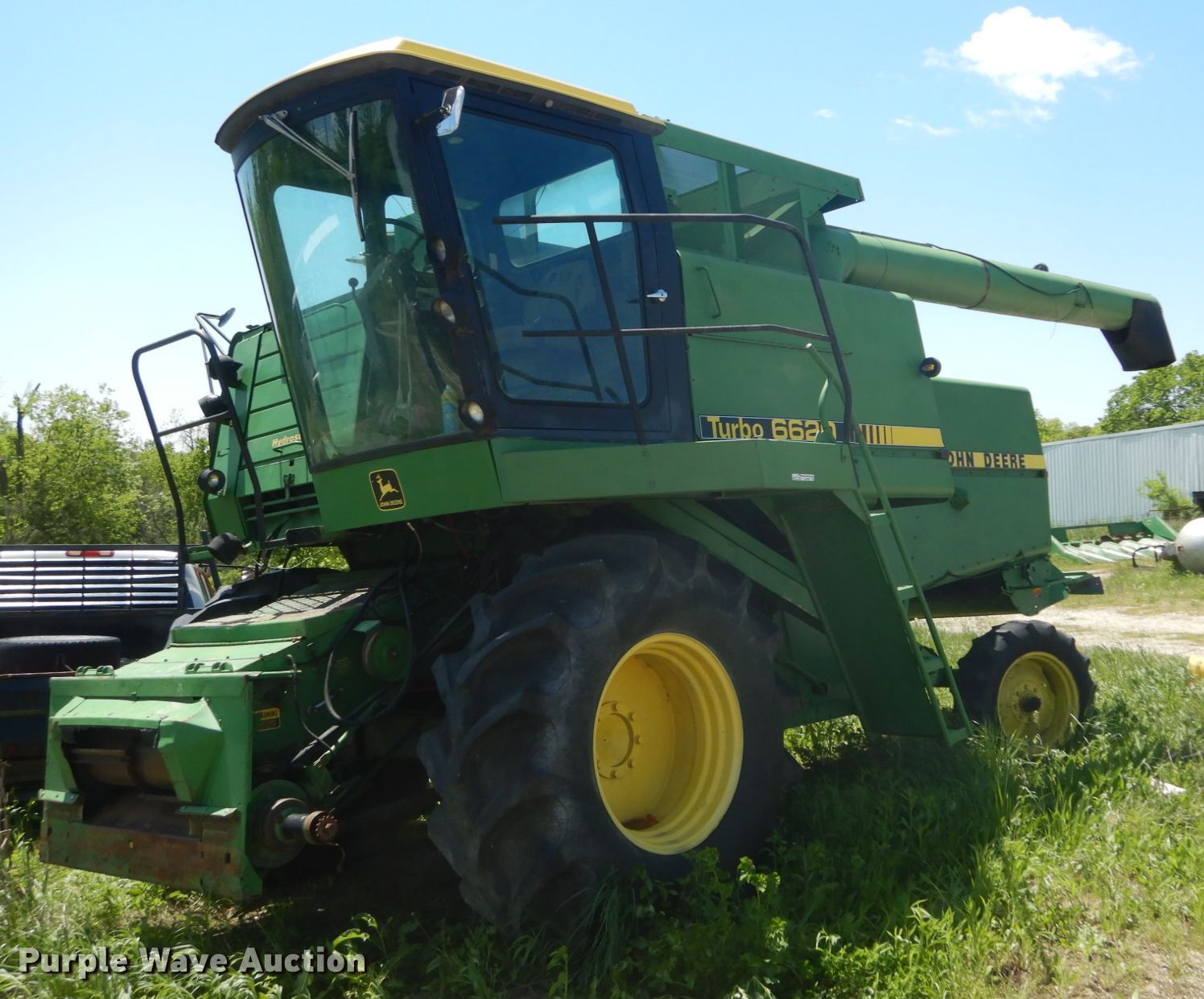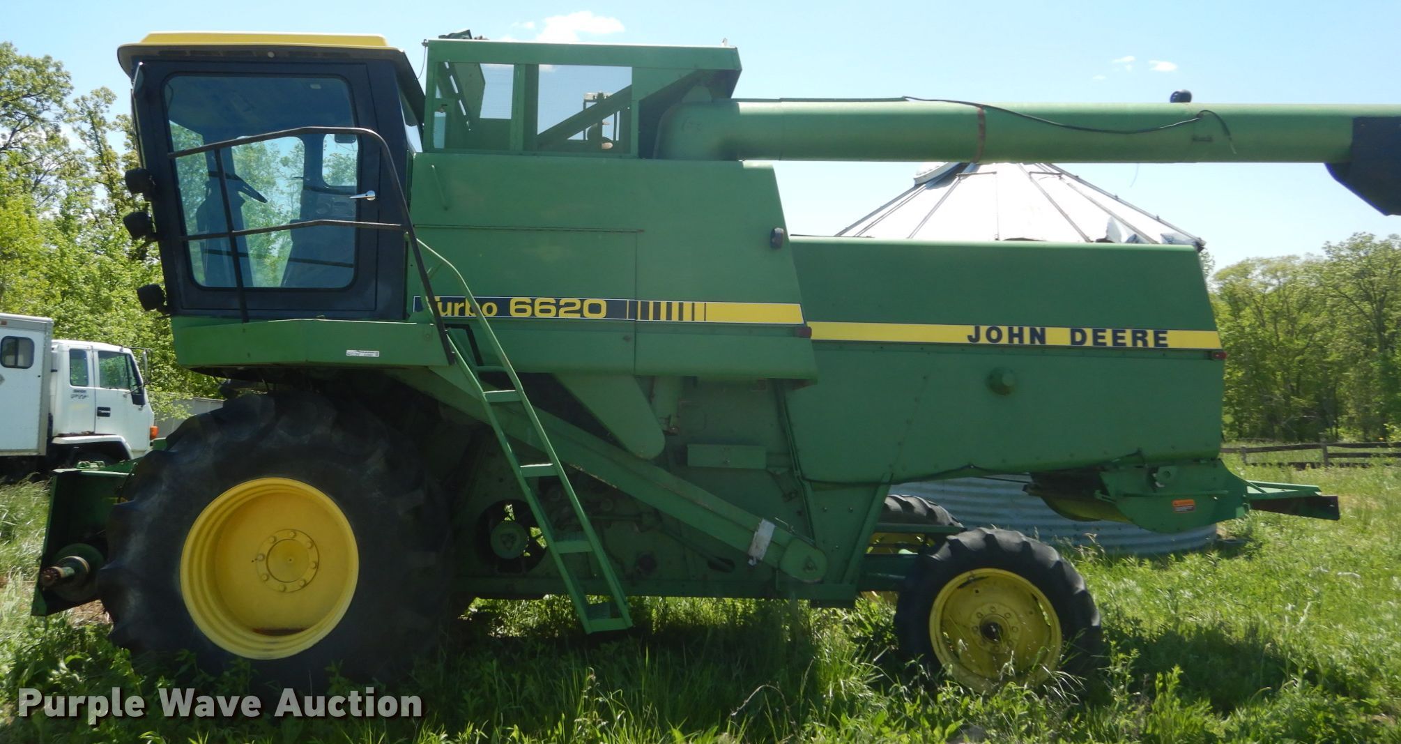 John Deere 6620 combine. 3,286 engine hours on meter, John Deere six cylinder diesel engine, Hydrostatic transmission 4F-4R gears, AC and heat, Straw chopper, 24.5-32 front tires, 11.2-24 rear tires, Dead battery, Unknown operating condition of AC, Unknown operating condition , Serial 358389. M Turpin Services LLC. Foristell, MO 63348