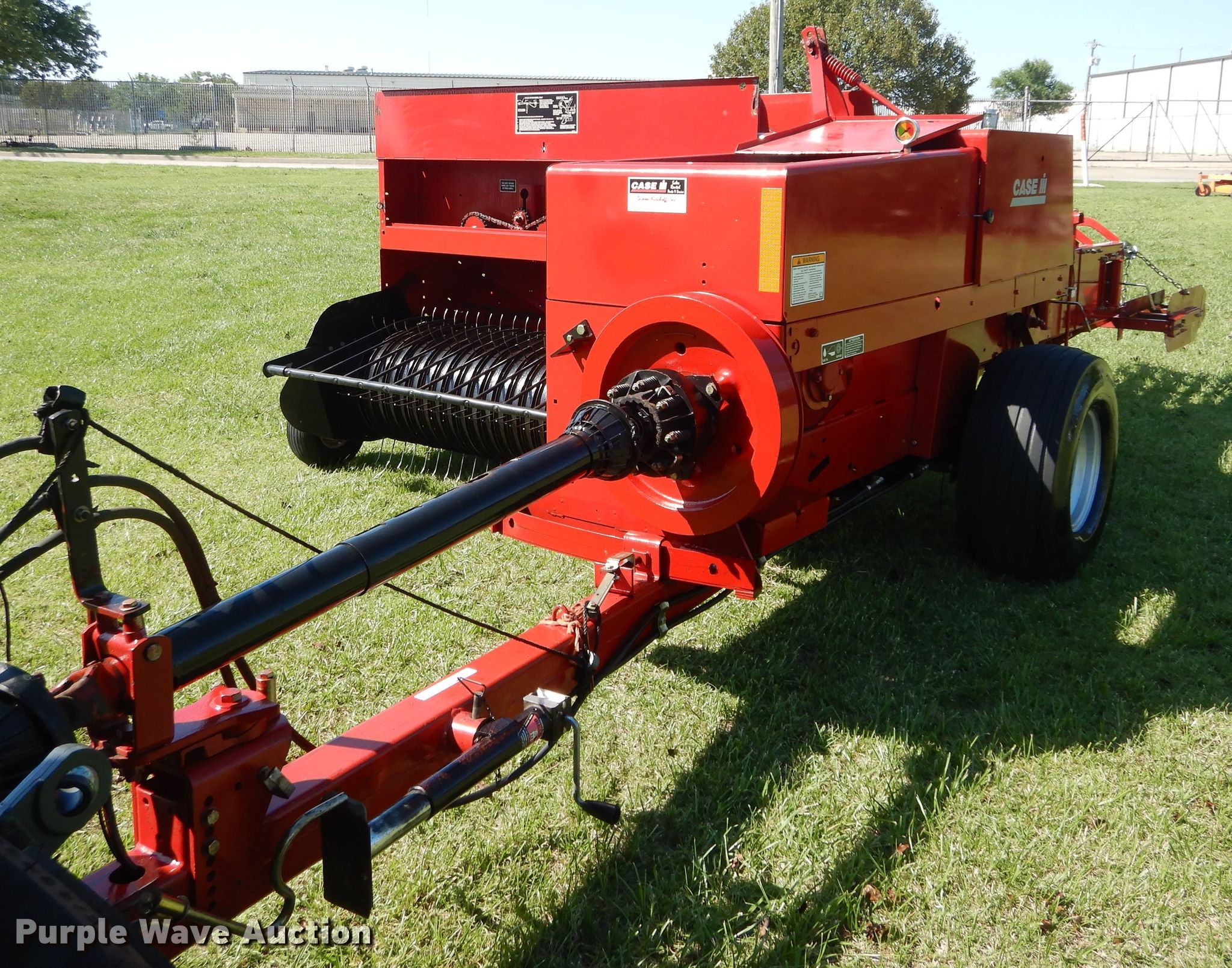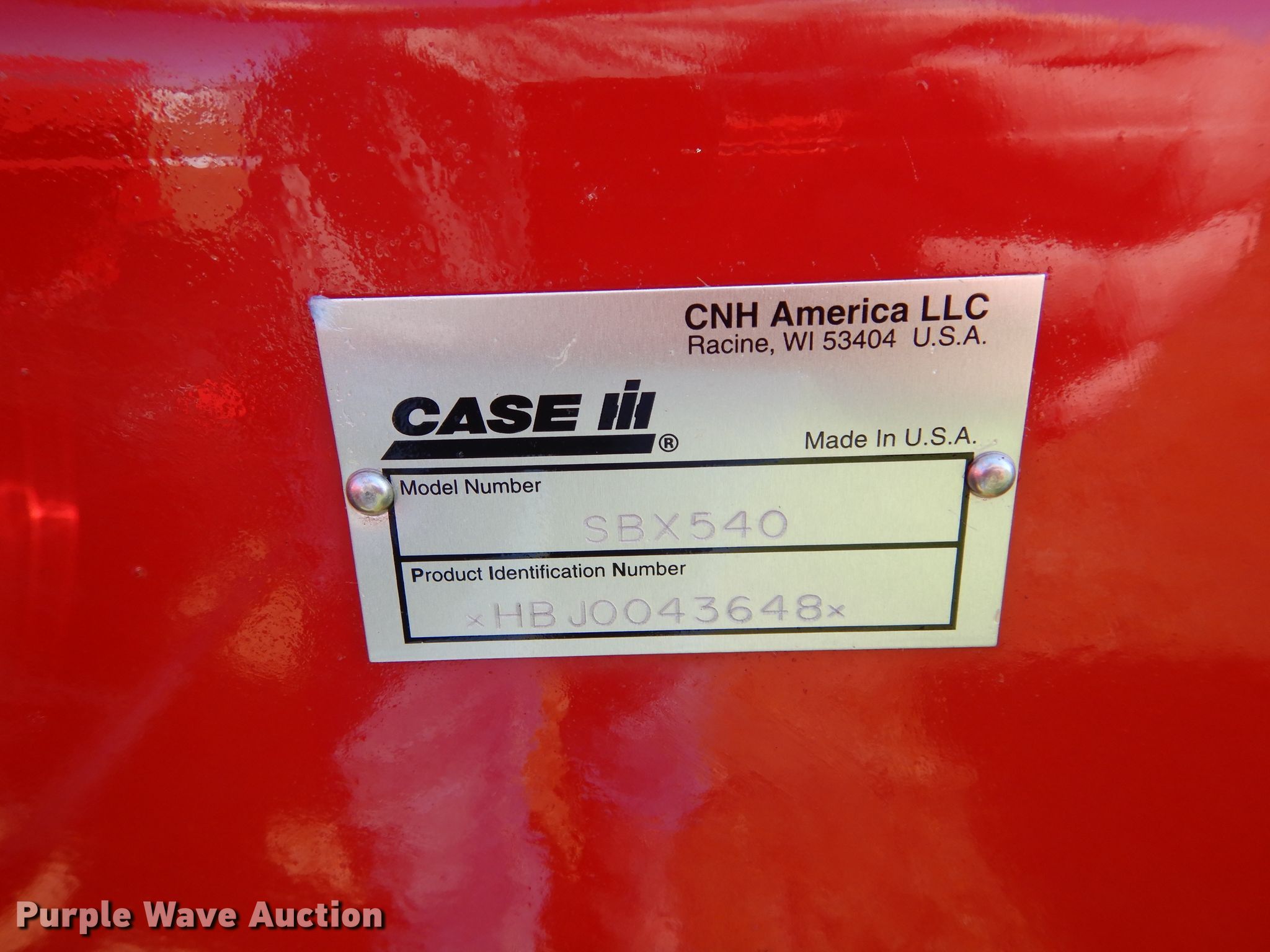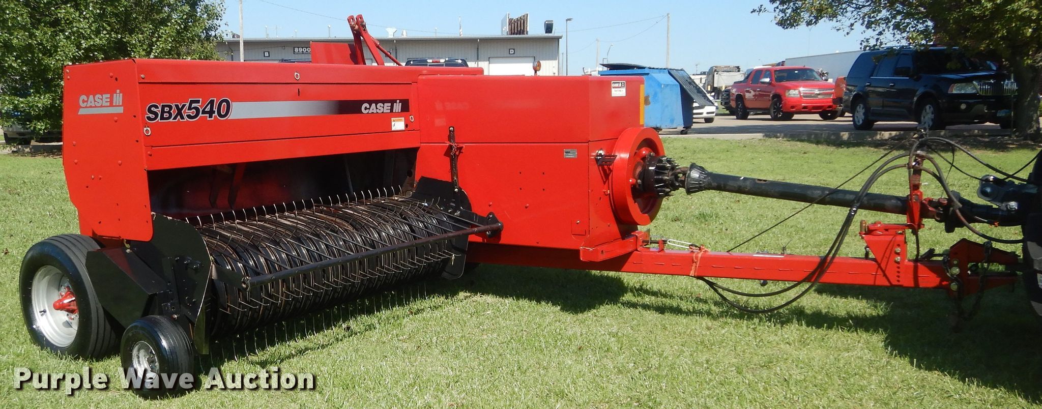 Purple Wave is selling a used Square Baler in Oklahoma. This item is a 2005 Case IH SBX540 small square baler with the following: Approx. 4,000 bale count, 14" x 18" bale capacity, 76"W pickup, Hydraulic pickup lift, Knotter, Quarter turn bale chute, Hydraulic bale density, 540 PTO, Hydraulic tongue swing, 31x13.50-15 tires, Moisture indicator not included, Serial HBJ0043648