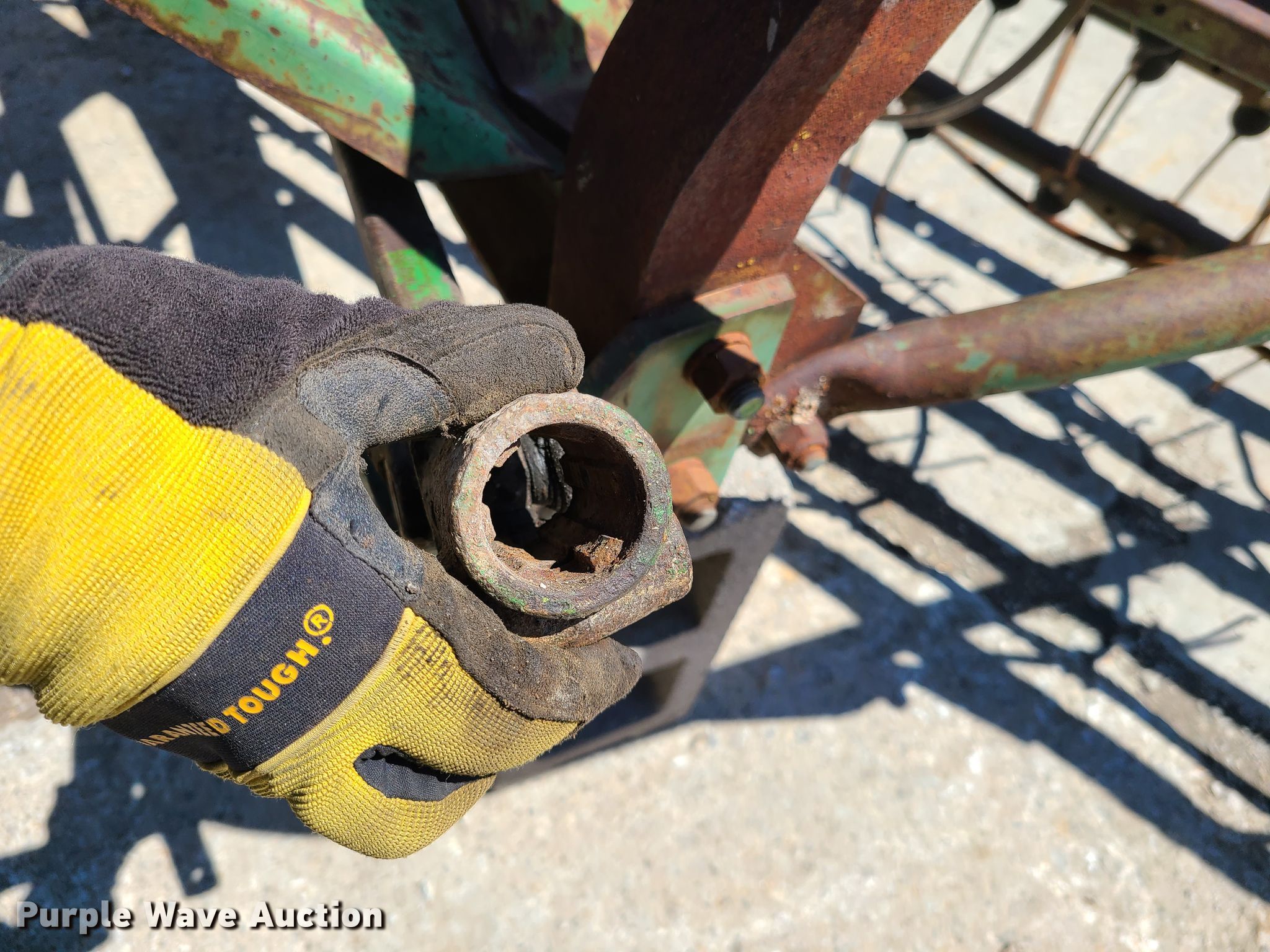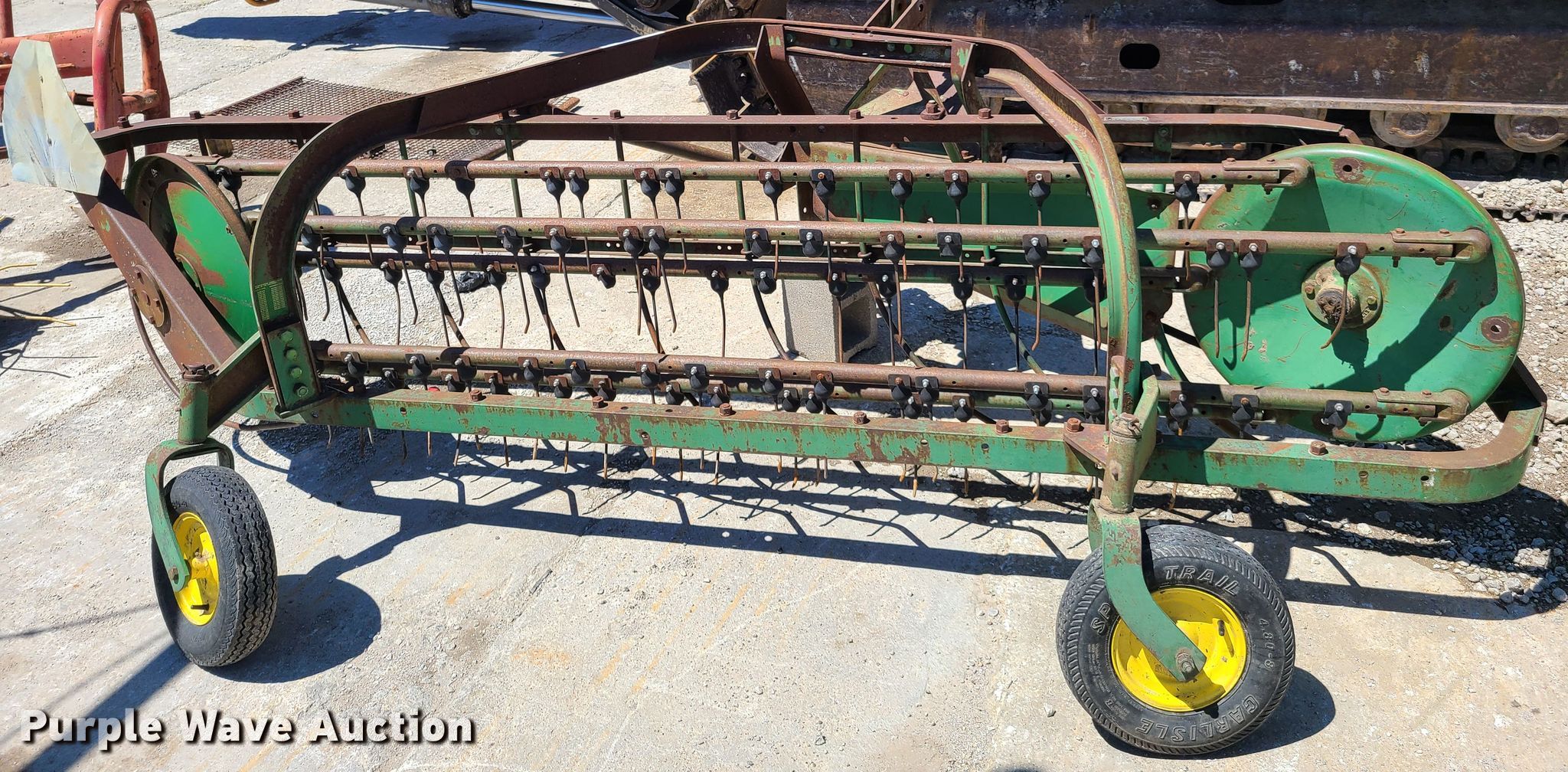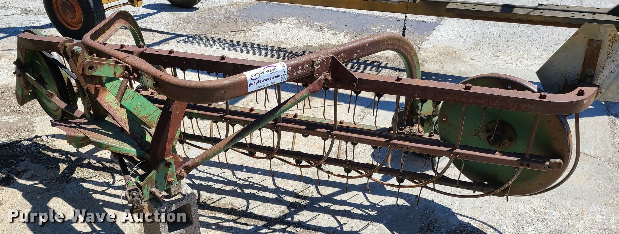 Purple Wave is selling a used Hay Rake in Missouri. This item is a John Deere hay rake with the following: 540 PTO, Three point hitch, 4.80-8 tires, Serial 065753E