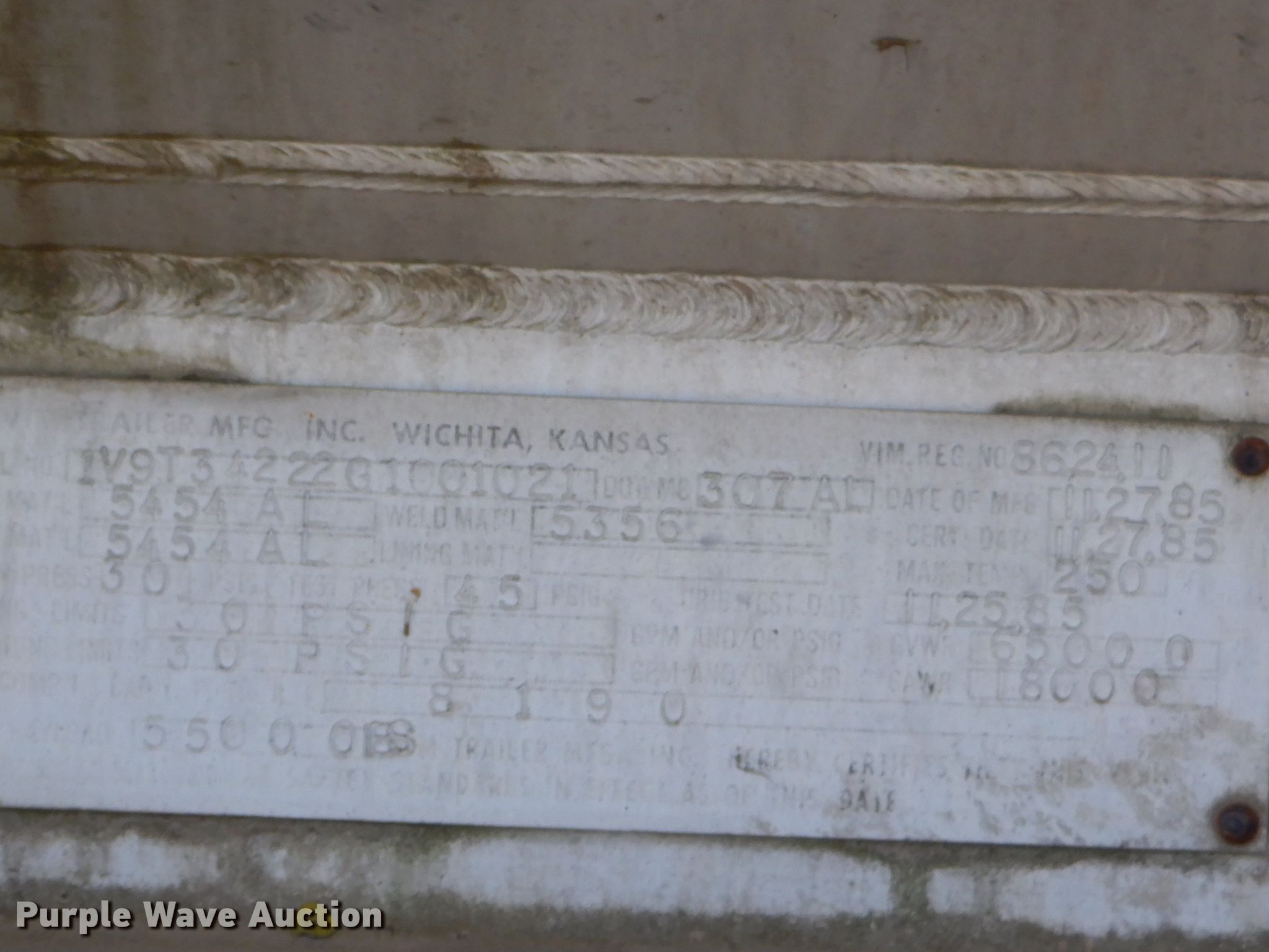 Purple Wave is selling a used Tank Trailer in Kansas. This item is a 1986 VIM tank trailer with the following: 41'L x 8'W stainless steel tank, (2) 3.5" diameter outlet valves, Dual leg landing gear, Spring suspension, Air brakes, Tandem axle, Steel wheels, 11R22.5 tires, GVWR 65,000 lbs, Unit# 4-263