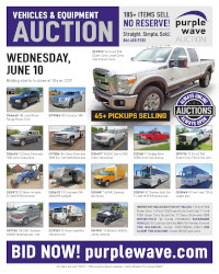 Payments must be made by 4 p.m. CDT on the second business day following the auction. Failure to make payment or payment arrangements by the deadline will result in a $30 late payment fee. Purple Wave reserves the right to charge the credit card on file the total purchase price and a $30 late payment fee will be added for invoices not paid within our terms. Payment should be made to Purple Wave, Inc.