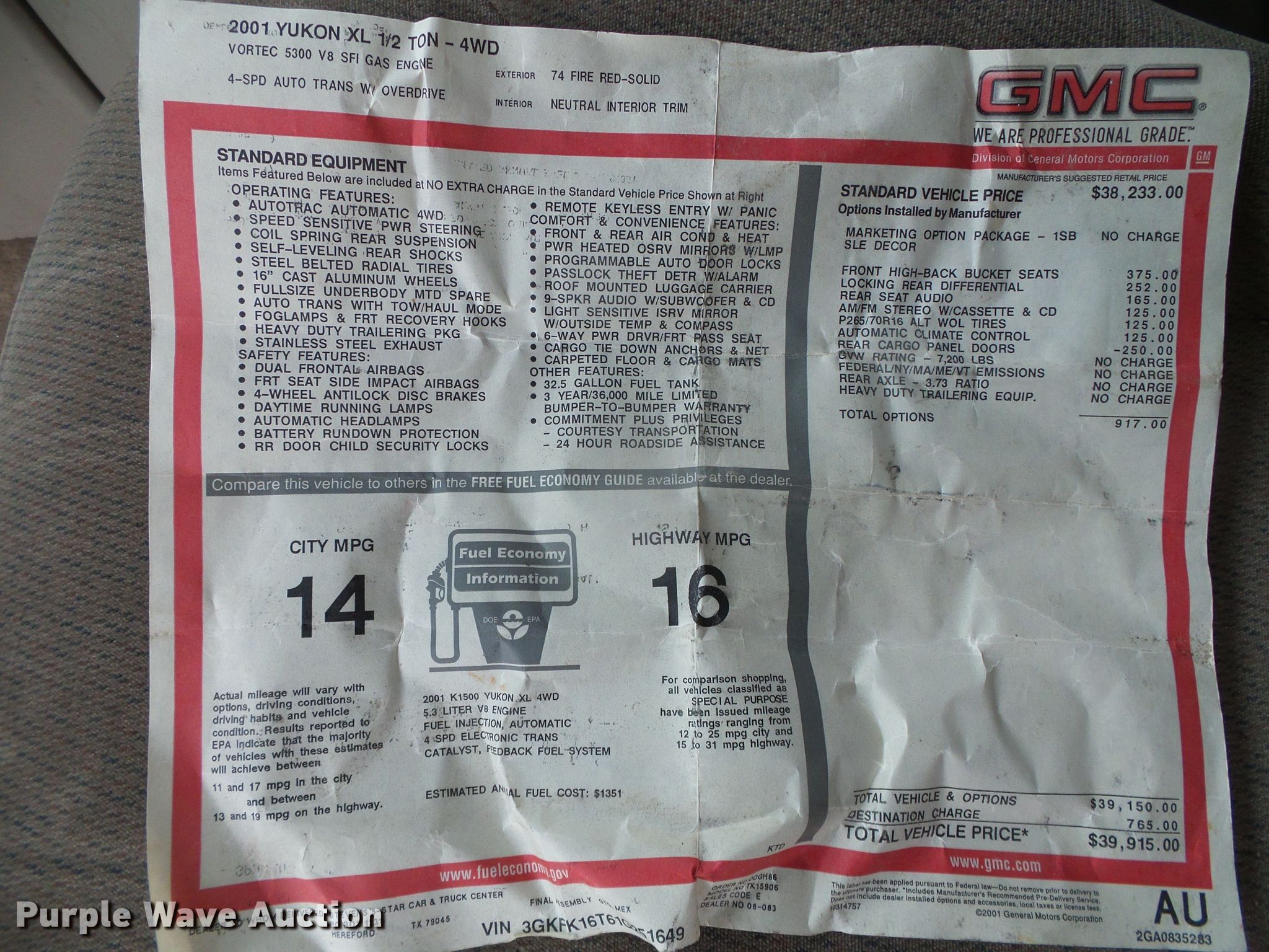 2001 GMC Yukon XL SUV. 278,978 miles on odometer. Engine Displacement: 5.3L V8 OHV 16V, Cylinders: 8, Fuel type: Gas. Transmission Automatic, Four wheel drive. Interior AC, Heat, Seat: Power driver, Power passenger, Power windows, Power locks, Cruise control. Tires Size: LT235/85R16. Kansas title. Title distribution may be delayed up to 14 days from verification of funds. 3GKFK16T61G251649. Jetmore, KS 67854