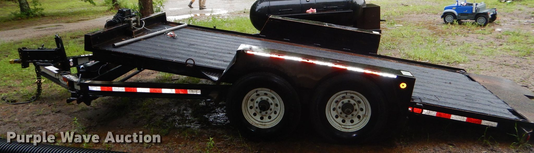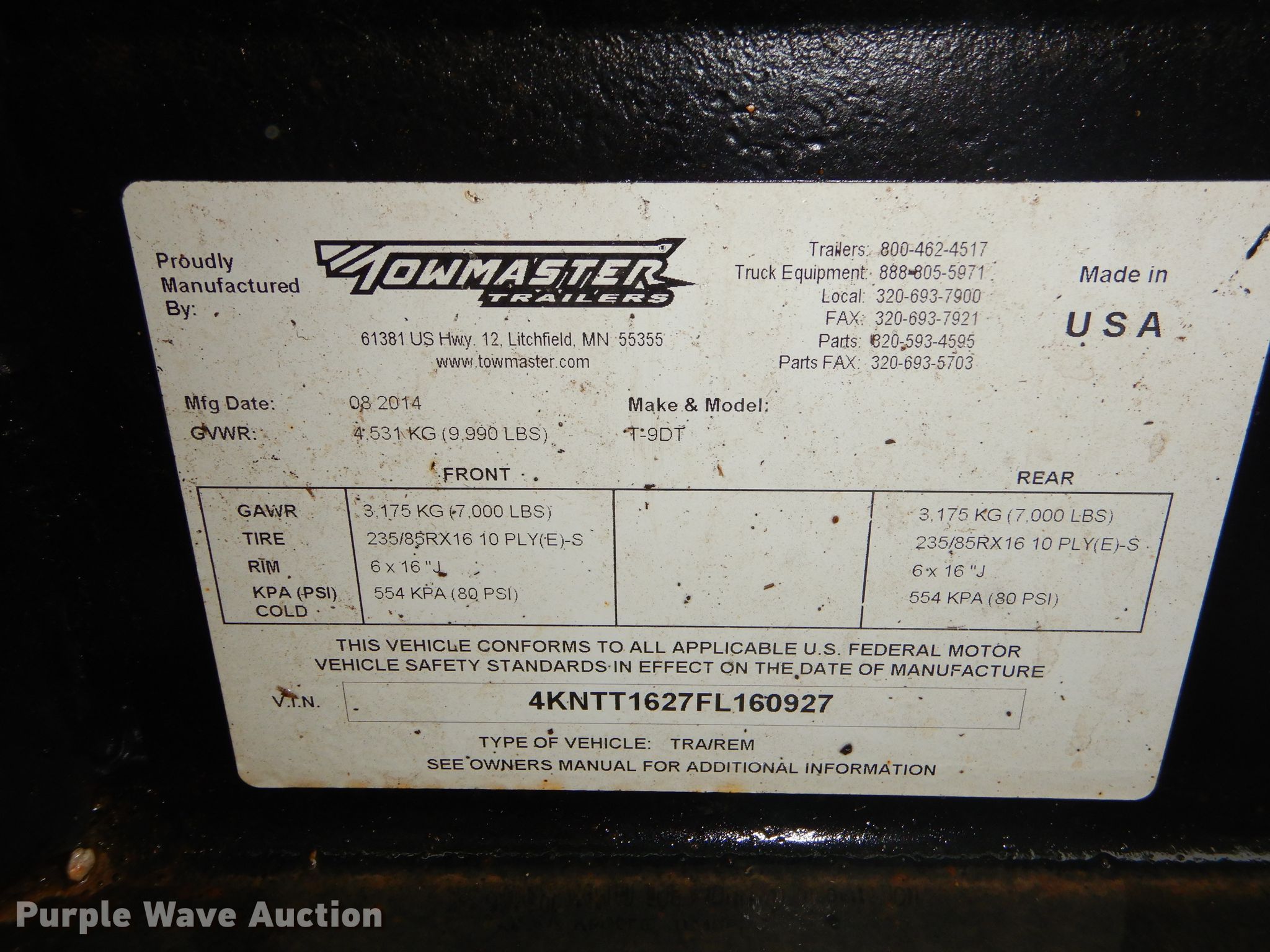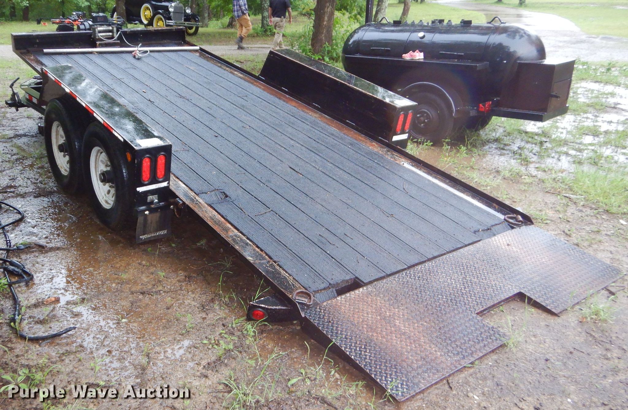 Purple Wave is selling a used Car or Utility Trailer in Oklahoma. This item is a 2015 Towmaster T-9DT tilt deck utility trailer with the following: 280"L x 101"W overall, 190"L x 82"W deck, 2'L ramp, Steel deck, Warn VR10 winch, 10,000 lbs capacity, 2 5/16" ball hitch, Single leg landing gear, Electric brakes, Tandem axle, Steel wheels, 235/85R16 tires, GVWR 9,990 lbs, GAWR 7,000 lbs