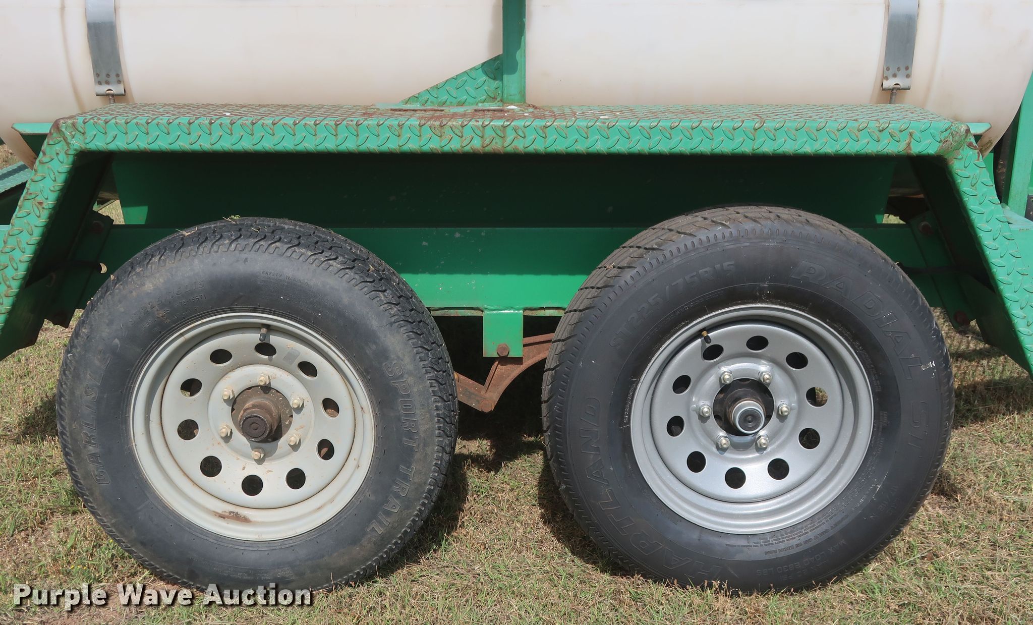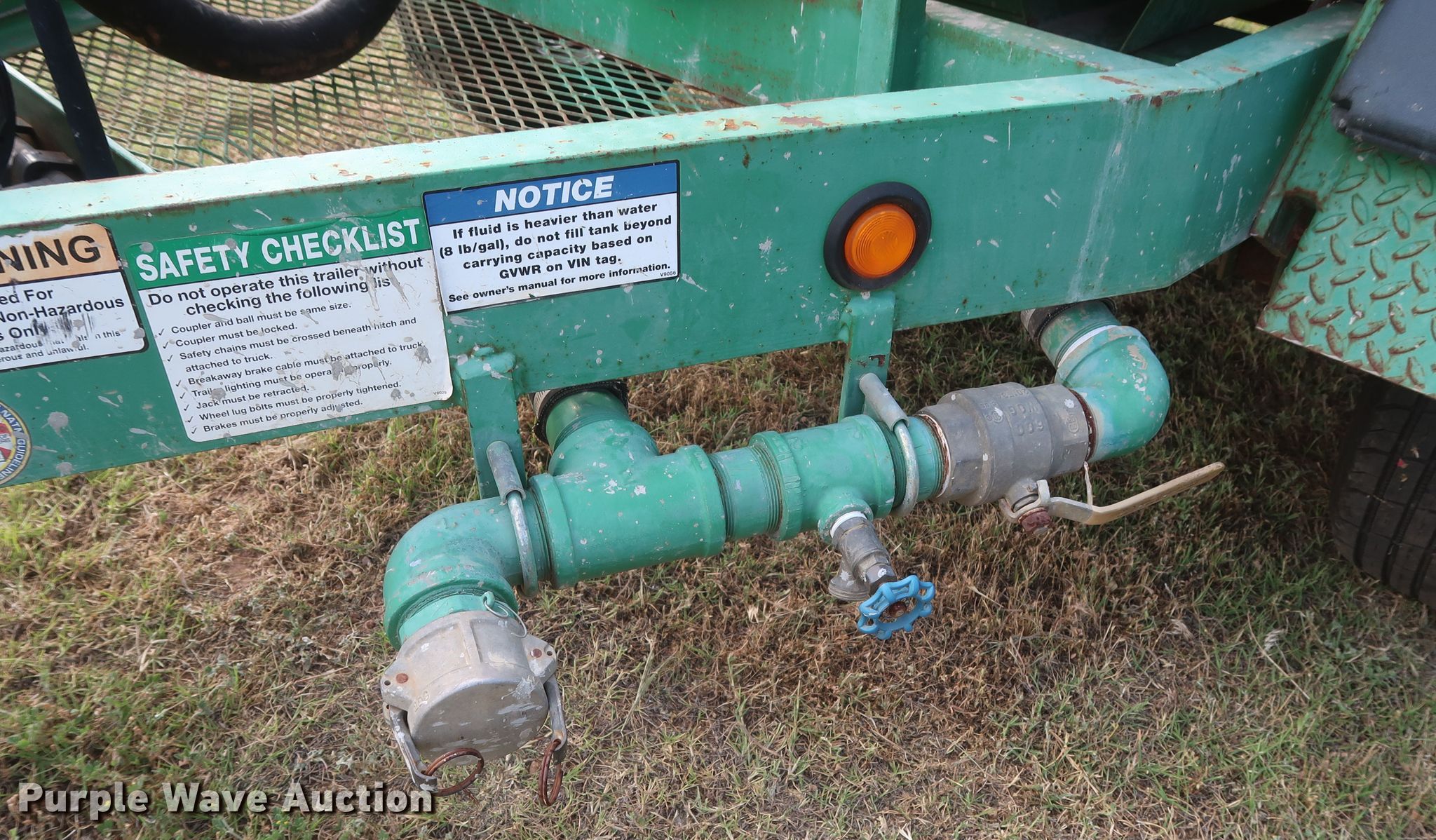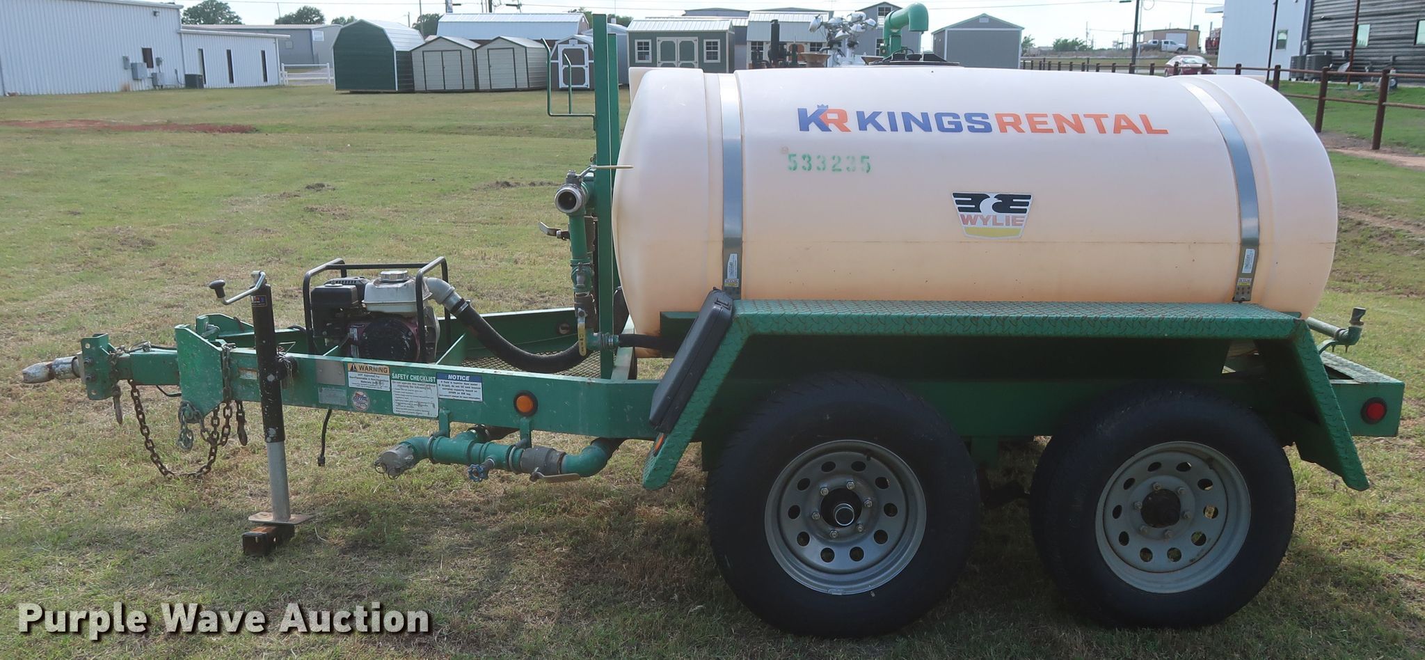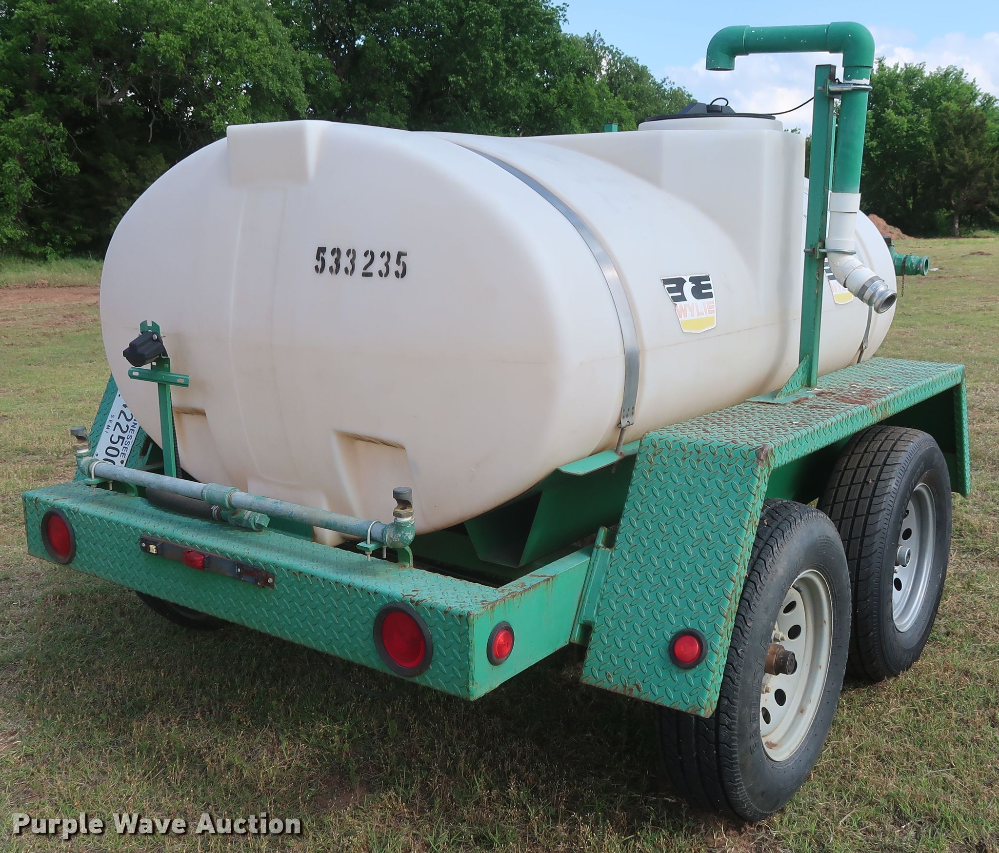 Purple Wave is selling a used Tank Trailer in Oklahoma. This item is a 2013 Wylie EXP500S tank trailer with the following: 13'L x 80"W overall, 500 gallon tank capacity, Koshin SEH-50X pump, 2" diameter outlet, Front, side, and rear discharge, Single leg landing gear, Spring suspension, Steel wheels, ST225/75R15 tires, GVWR 6,000 lbs, GAWR 3,500 lbs