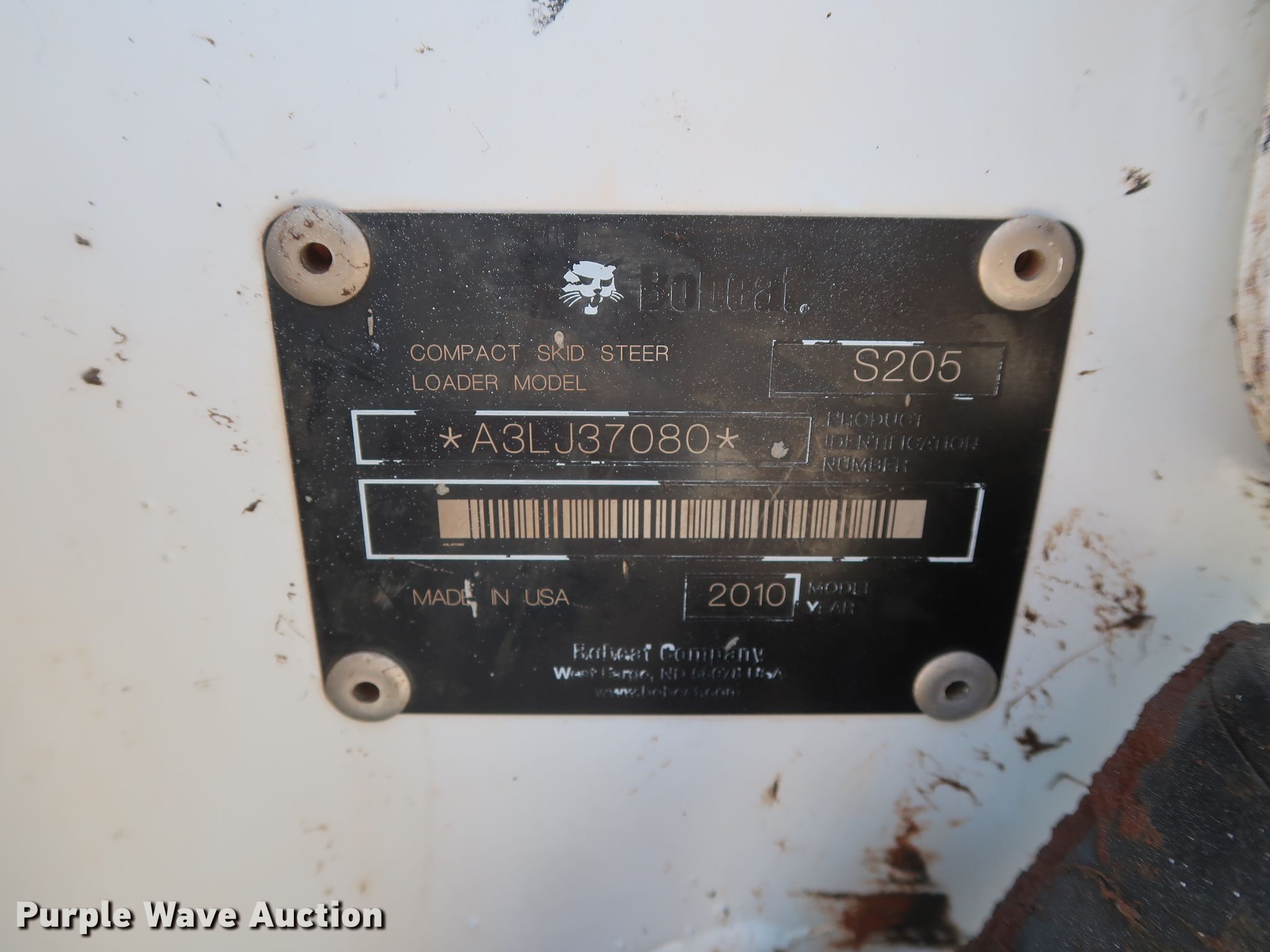 Purple Wave is selling a used Skid Steer Loader in Oklahoma. This item is a 2010 Bobcat S205 skid steer loader with the following: 4,939 hours on meter, Serial: A3LJ37080