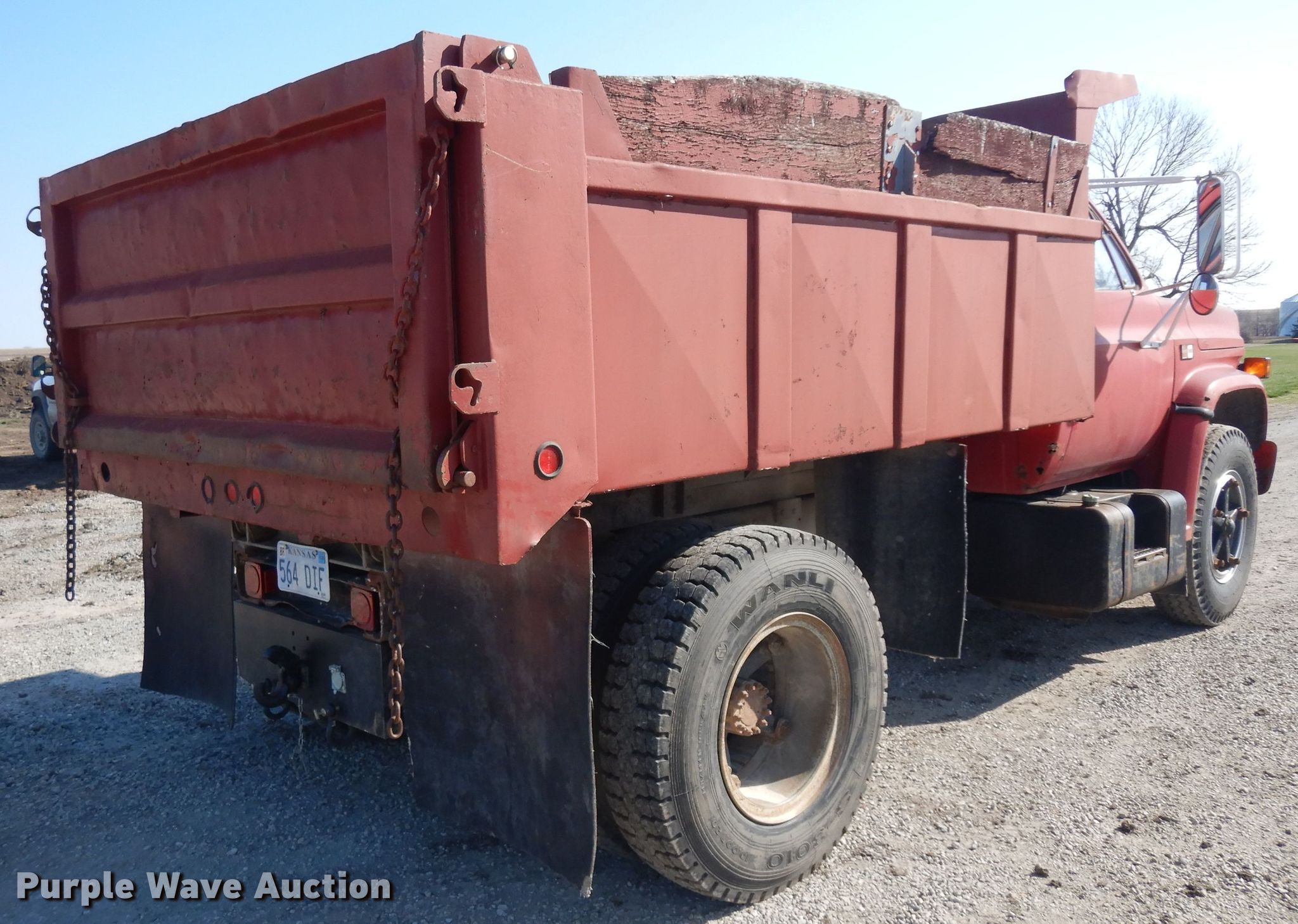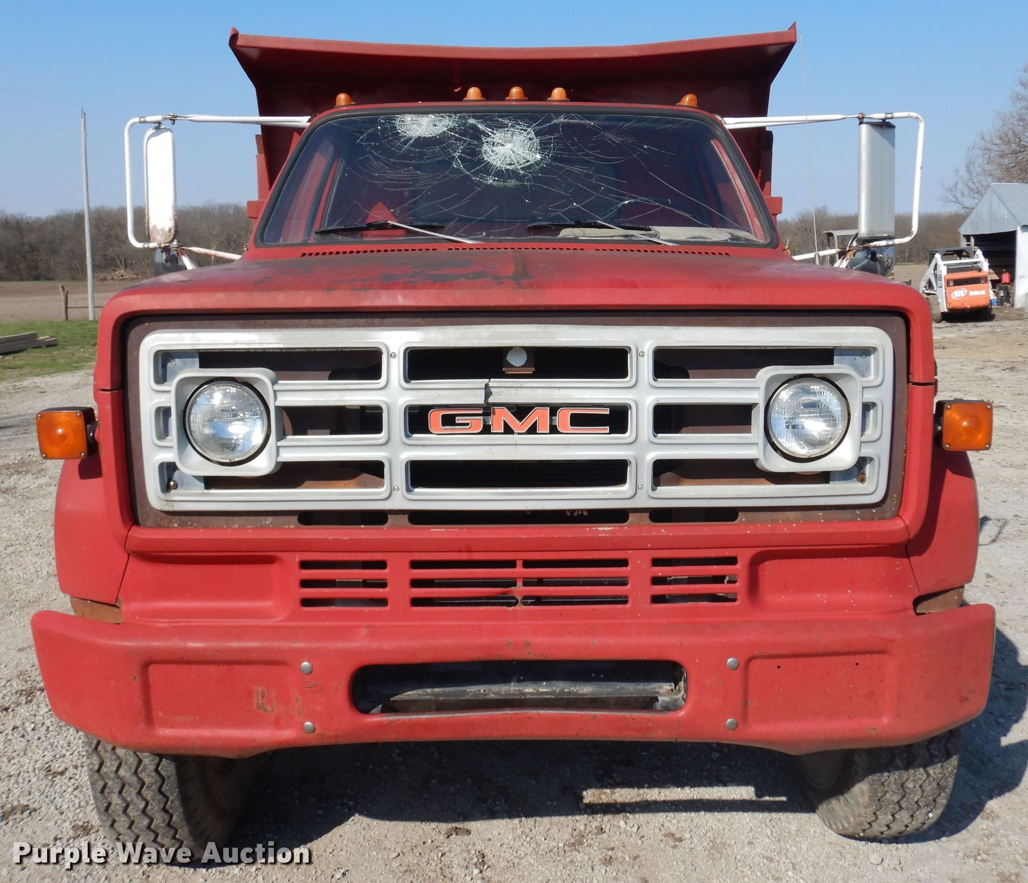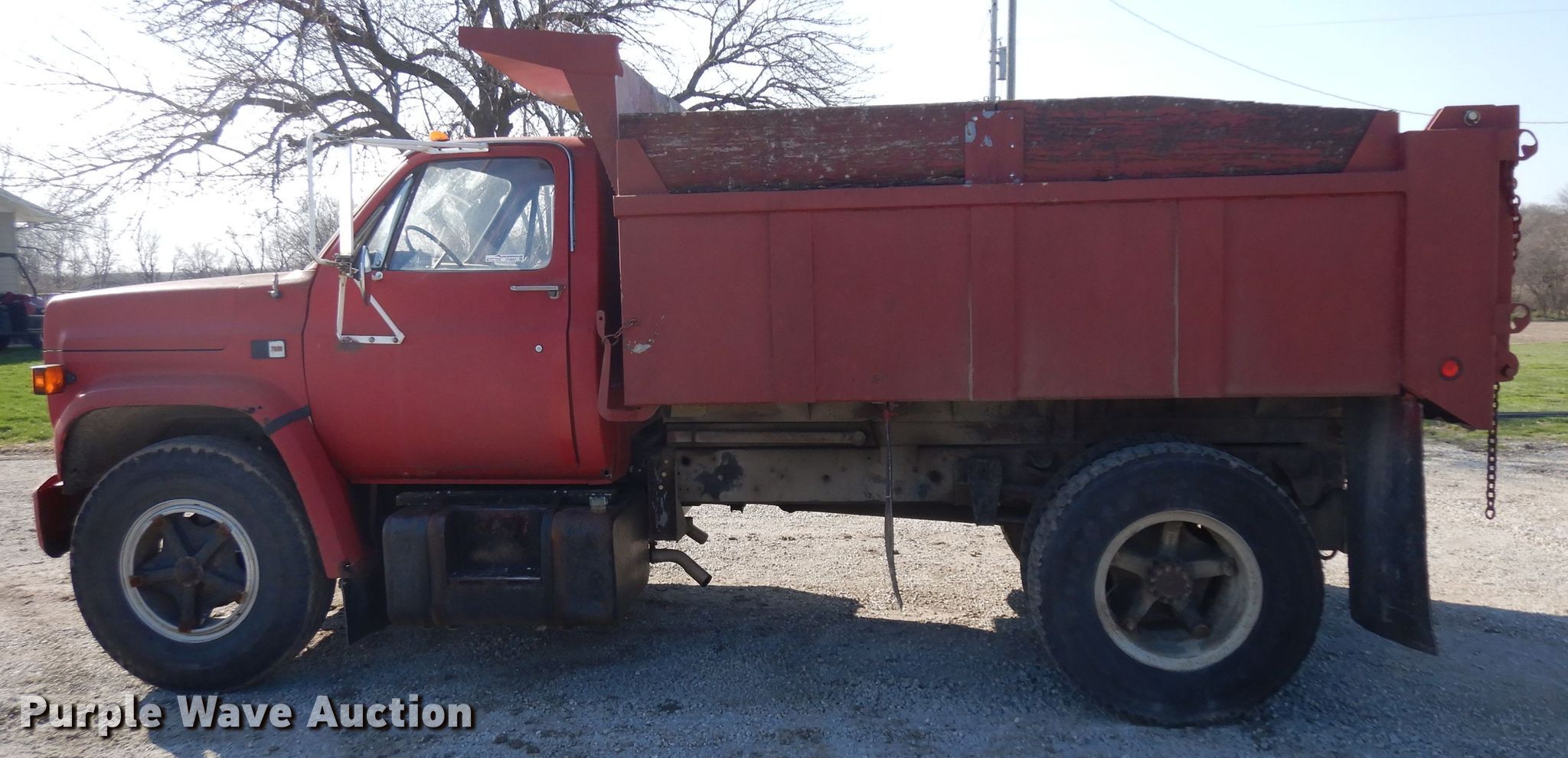 Purple Wave is selling a used Construction Dump Truck in Kansas. This item is a 1987 GMC 7000 dump truck with the following: 122,543 miles on odometer, 6.0L V8 gas engine, Five speed manual transmission, Single axle, Heat, PTO, 10'L x 96"W steel dump bed, 29" side height, 12" side board height, Single ram hoist, Manual operated end gate, Spring suspension, Hydraulic brakes, 10.00R20 tires, GVWR 26,000 lbs, FAWR 7,000 lbs, RAWR 19,000 lbs, Windshield cracked