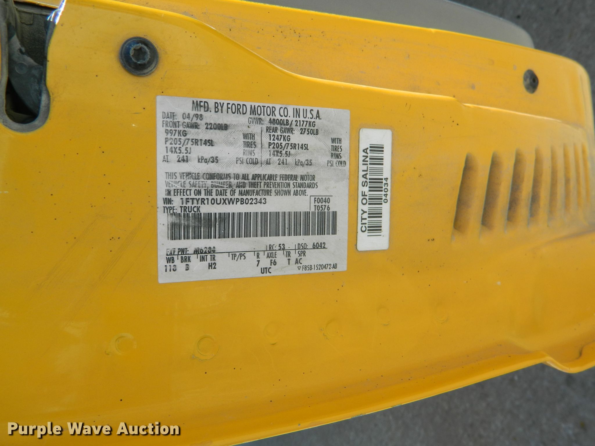 1998 Ford Ranger pickup truck. 89,620 miles on odometer. Engine Displacement: 3.0L V6 OHV 12V, Cylinders: 6, Fuel type: Gas. Transmission Automatic. Interior Heat. Tires Size: 205/75R14. Kansas title. 1FTYR10UXWPB02343. City of Salina. 412 E Ash St. Salina, KS 67401