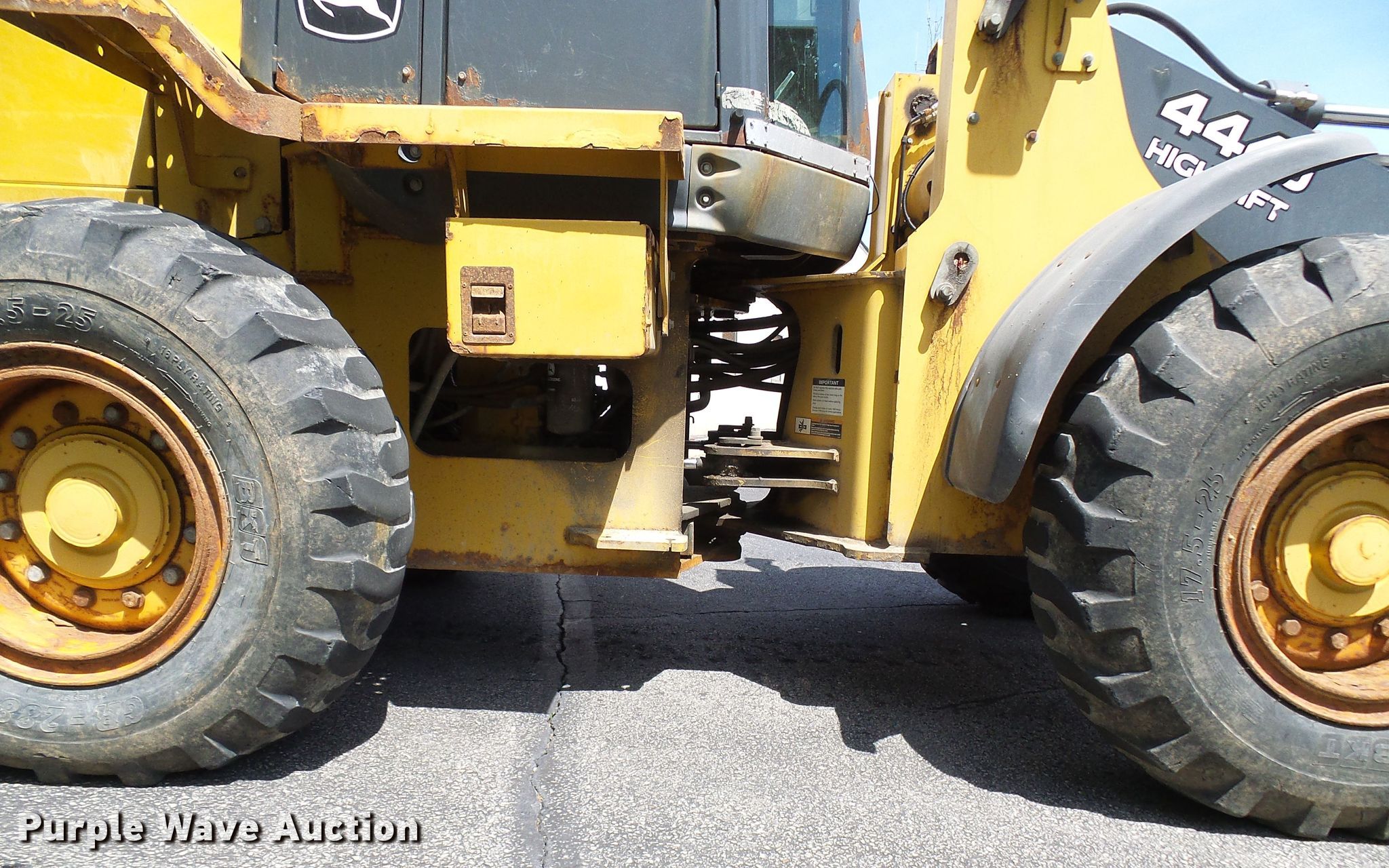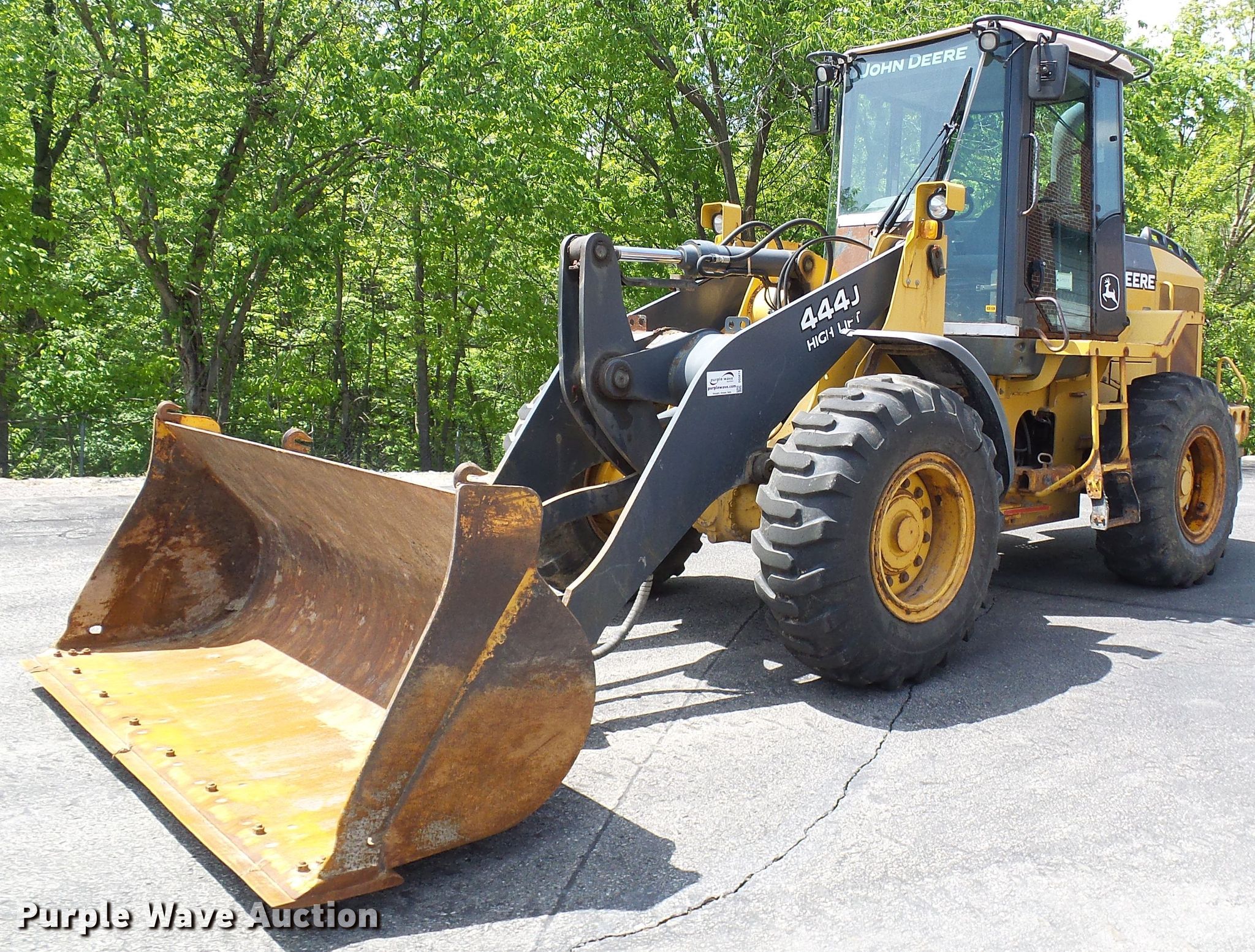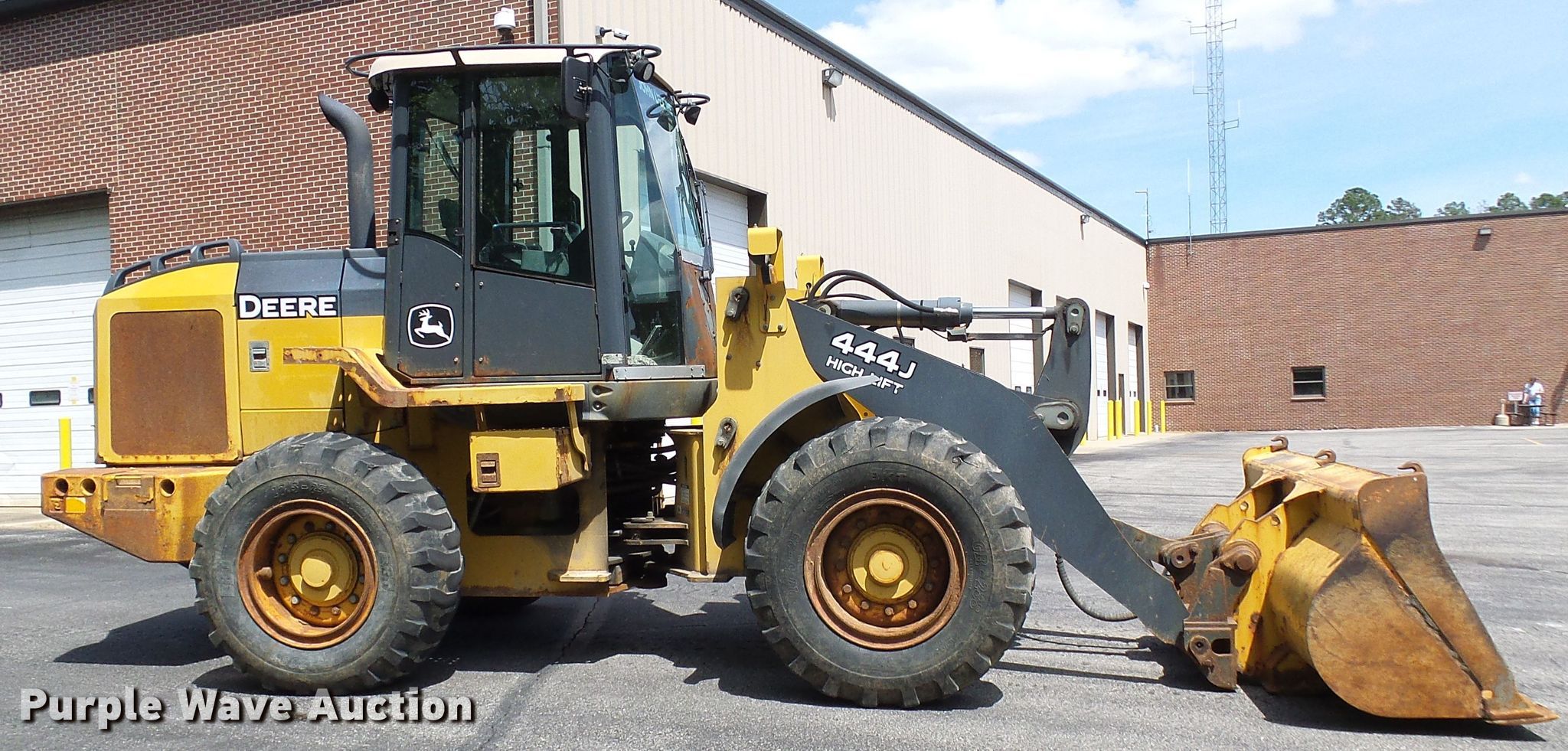 Purple Wave is selling a used Wheel Loader in Missouri. This item is a 2007 John Deere 444J High Lift wheel loader with the following: 5,619 hours on meter, Serial: DW444JH615734, MODOT #: G9353