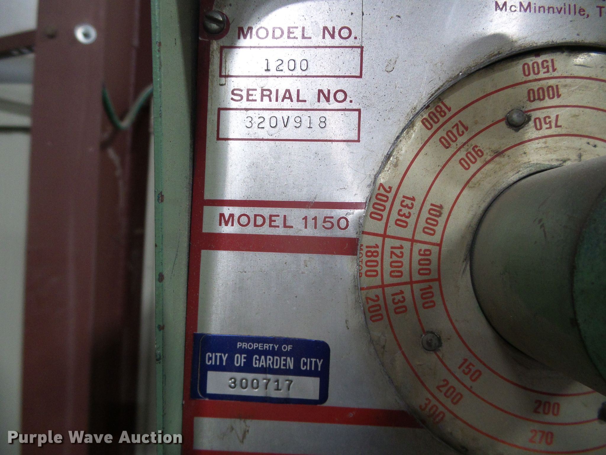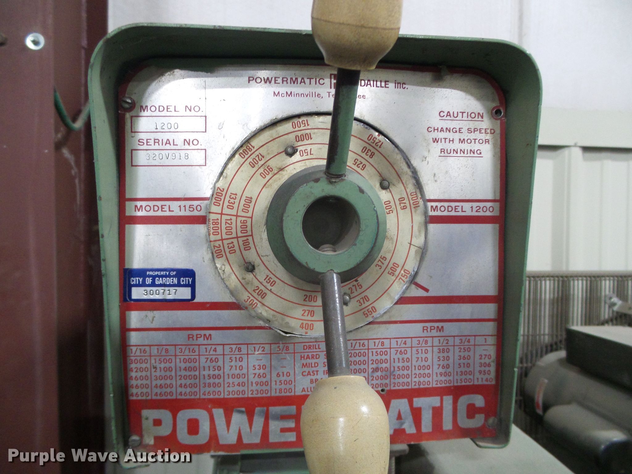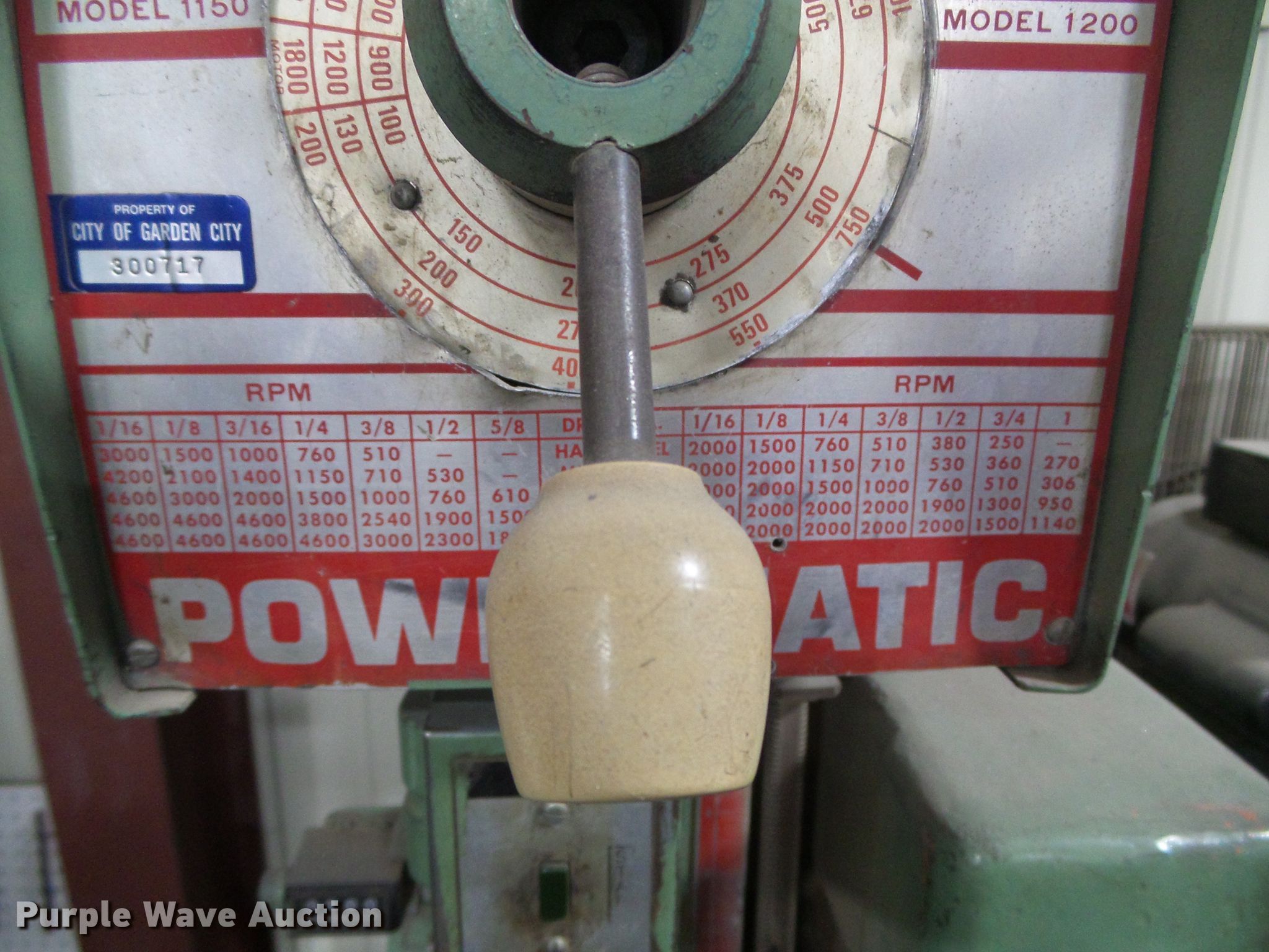 Purple Wave is selling a used Tools in Kansas. This item is a Powermatic No. 1200 drill press with the following: 230/460V electric motor, 1 HP, Three phase, Off button sticks, Power lever broken, Serial 320V918, Unit# 300717