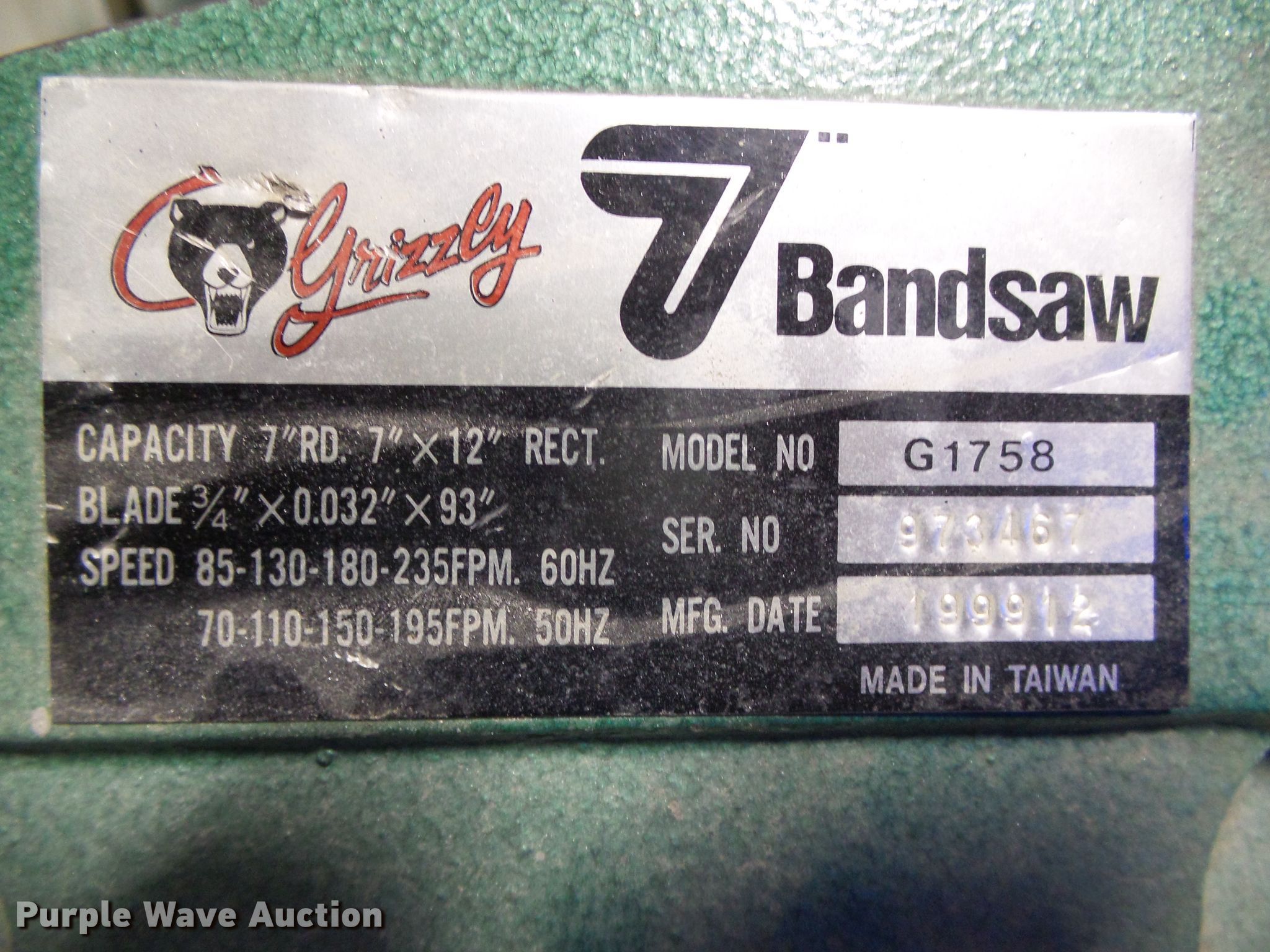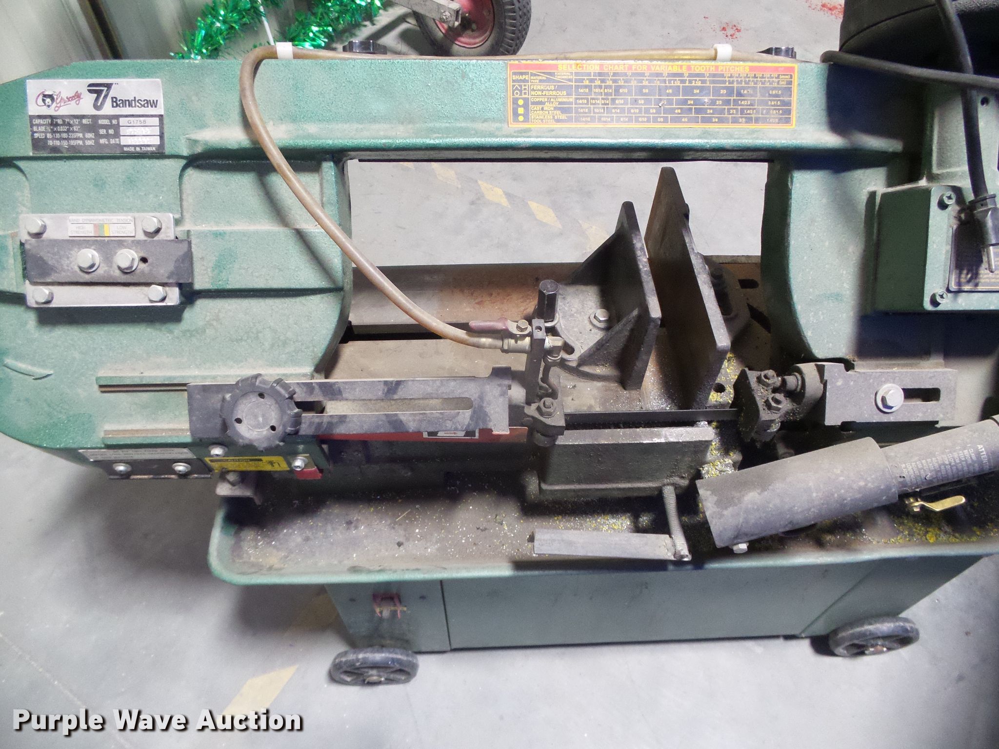 Purple Wave is selling a used Tools in Kansas. This item is a Grizzly G1758 metal bandsaw with the following: Serial 973467