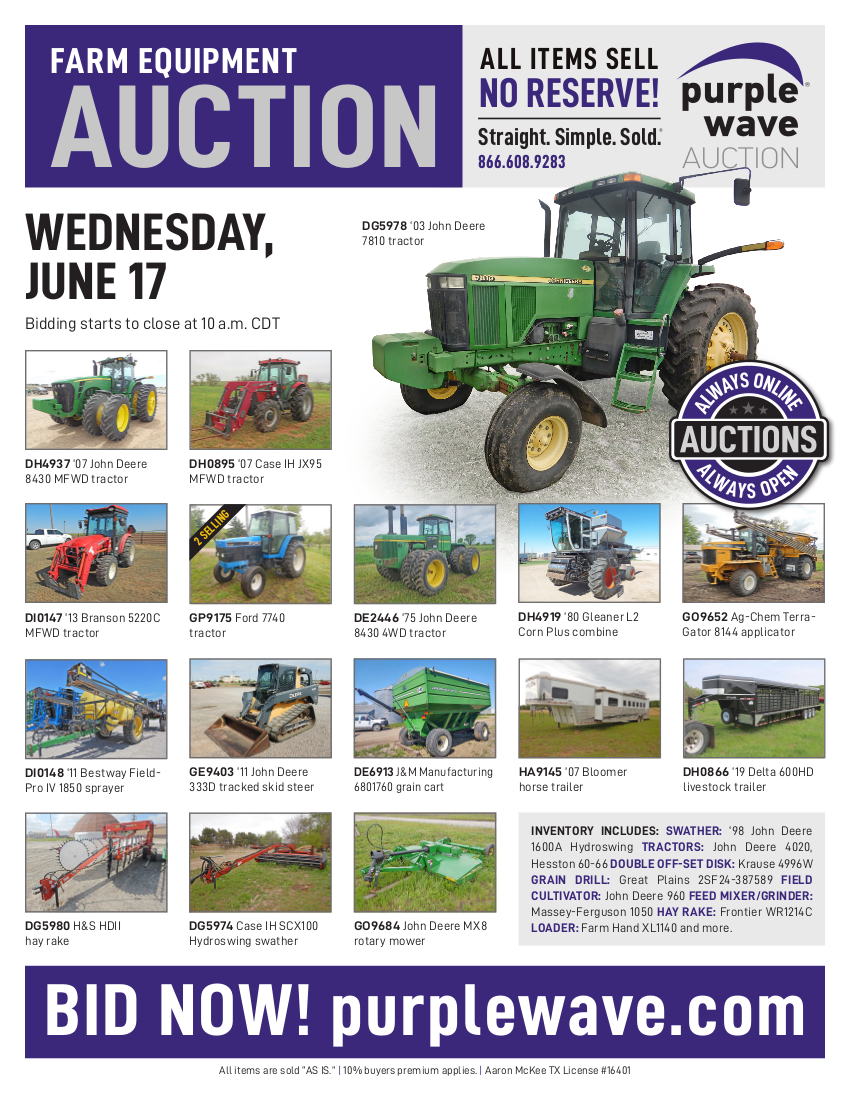 This auction is conducted by Purple Wave, Inc., whose home office is 825 Levee Drive, Manhattan, Kansas. Aaron McKee, Texas auctioneer license # 16401, operates Purple Wave, Inc. Complaints against us may be directed to the Texas Department of Licensing and Regulation, P.O. Box 12157, Austin, Texas 78711, (512) 463-6599. For additional required information, see the attached document.