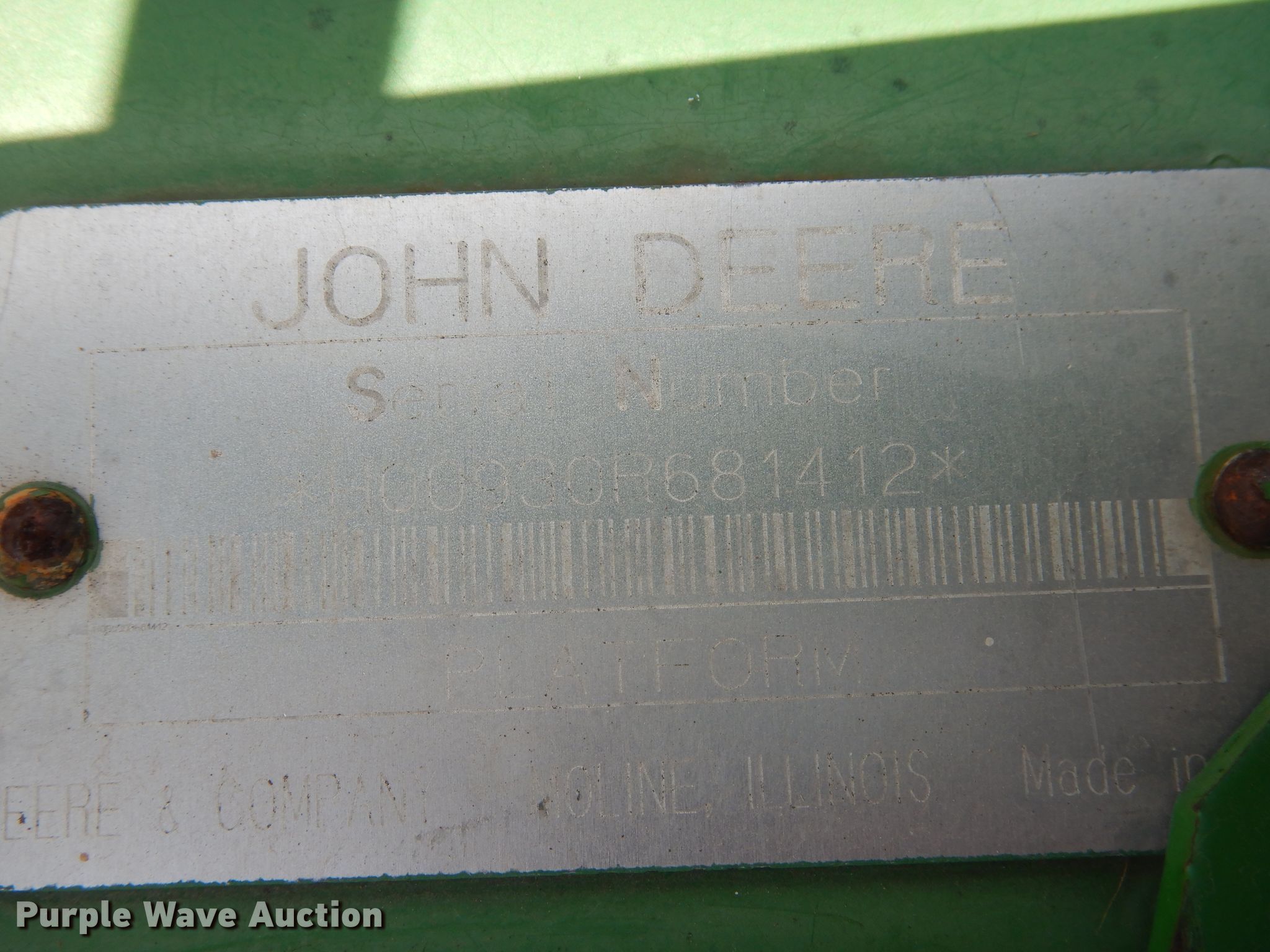 Purple Wave is selling a used Platform or Stripper Head in Oklahoma. This item is a 1999 John Deere 930 rigid head with the following: 30'W, Bat reel, Hydraulic reel height control, Steel skid plates, Unknown operating condition, Serial H00930R681412