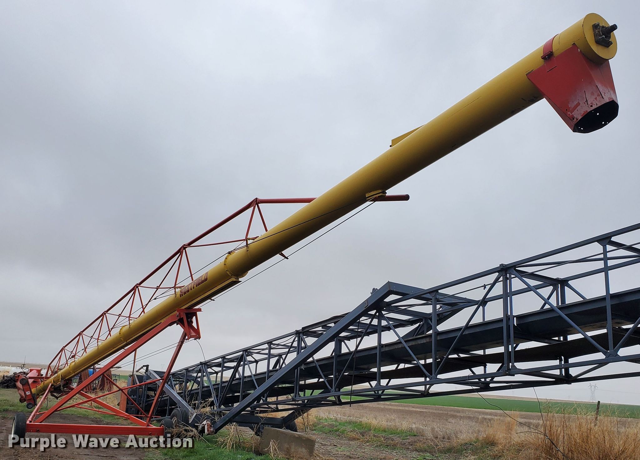 Purple Wave is selling a used Auger or Conveyor in Kansas. This item is a Westfield 130-91 Plus auger with the following: 91'L x 13" diameter, Hydraulic lift, Swing-out hopper, 9.50R15 tires, Auger frame bent, PTO shaft missing, Unknown operating condition