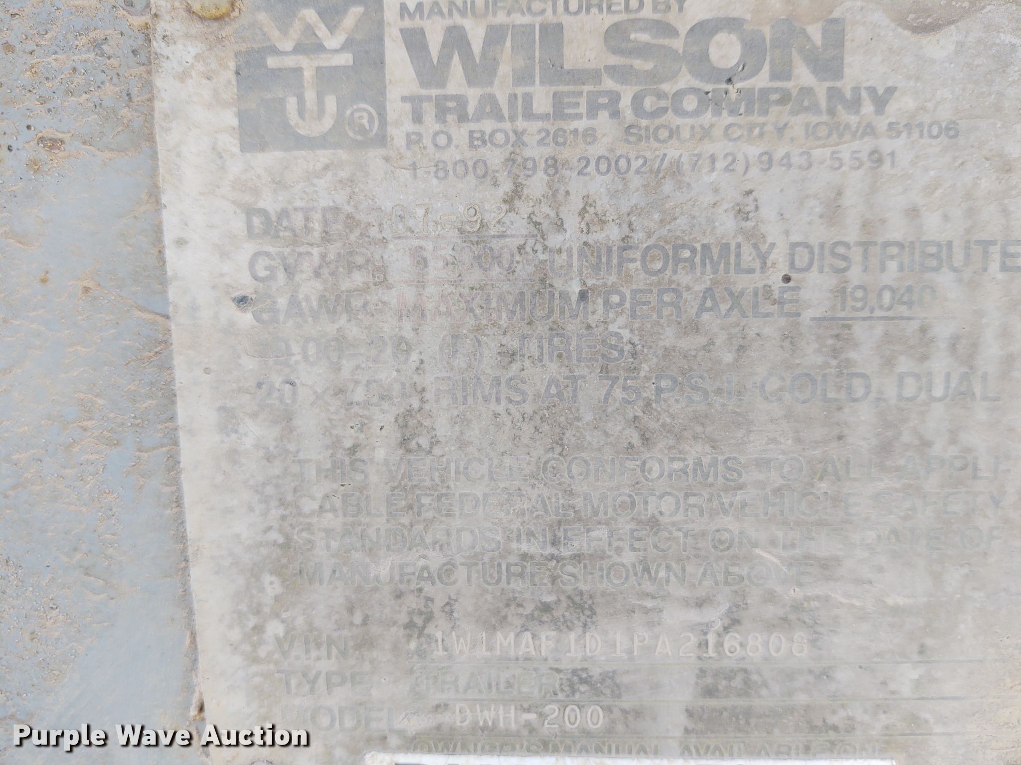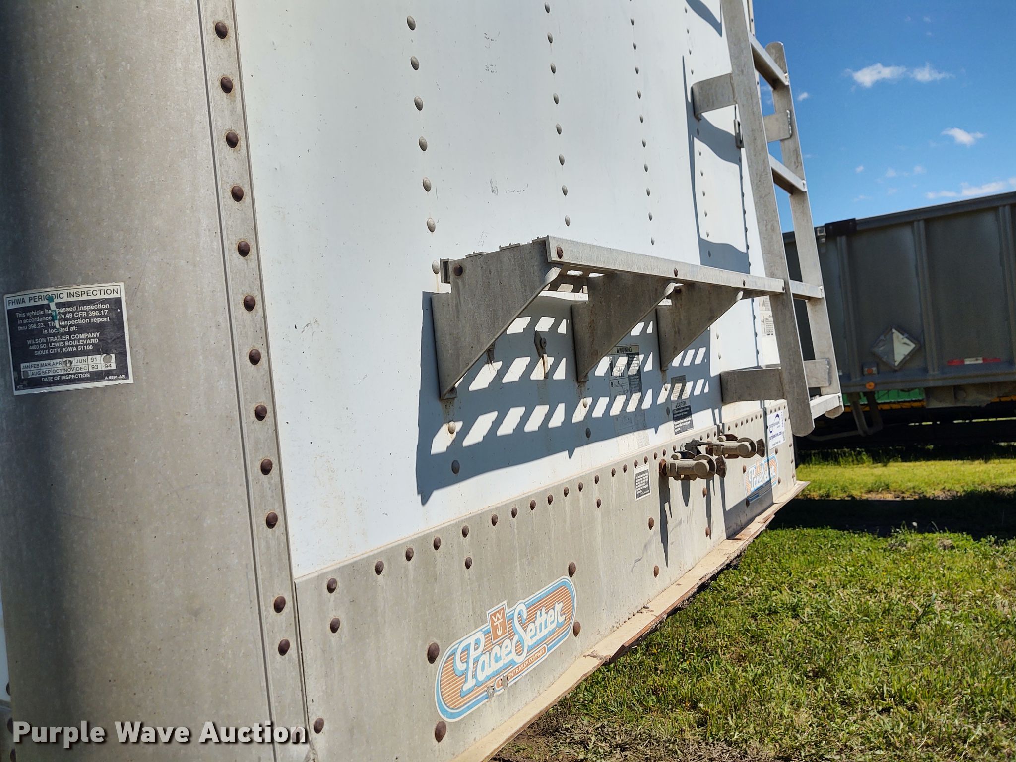 Purple Wave is selling a used Grain or Commodity Trailer in Kansas. This item is a 1993 Wilson DWH-200 double hopper bottom grain trailer with the following: 42'L x 96"W overall, 54" side height, Manual trap gates, Roll tarp, Spring suspension, Air brakes, 11R24.5 tires, Frame has been patched