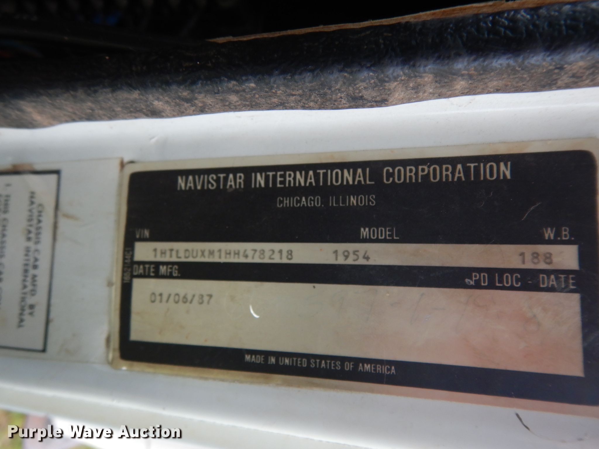 1987 International S1954/1900 dump flatbed truck. 217,390 miles on odometer. Engine International DT466, Displacement: 7.6L, Cylinders: 6, Fuel type: Diesel. Transmission Manual, Speed: 10. Chassis Axles: Tandem, Suspension: Spring, Brakes: Hydraulic, PTO, Wheelbase: 188". Interior AC, Heat. Operational Dump flatbed 16' L x 96" W, Side board height: 12", Bed type: Steel, Ram: Single , End gate: Manual. Tires Size: 10R22.5. Notes Two-radio not included, Non-operational AC, Bed will not dump Hydraulic lines may be on backwards. Oklahoma title. 1HTLDUXM1HH478218. 3251 S Hutchins Ln. Tishomingo, OK 73460