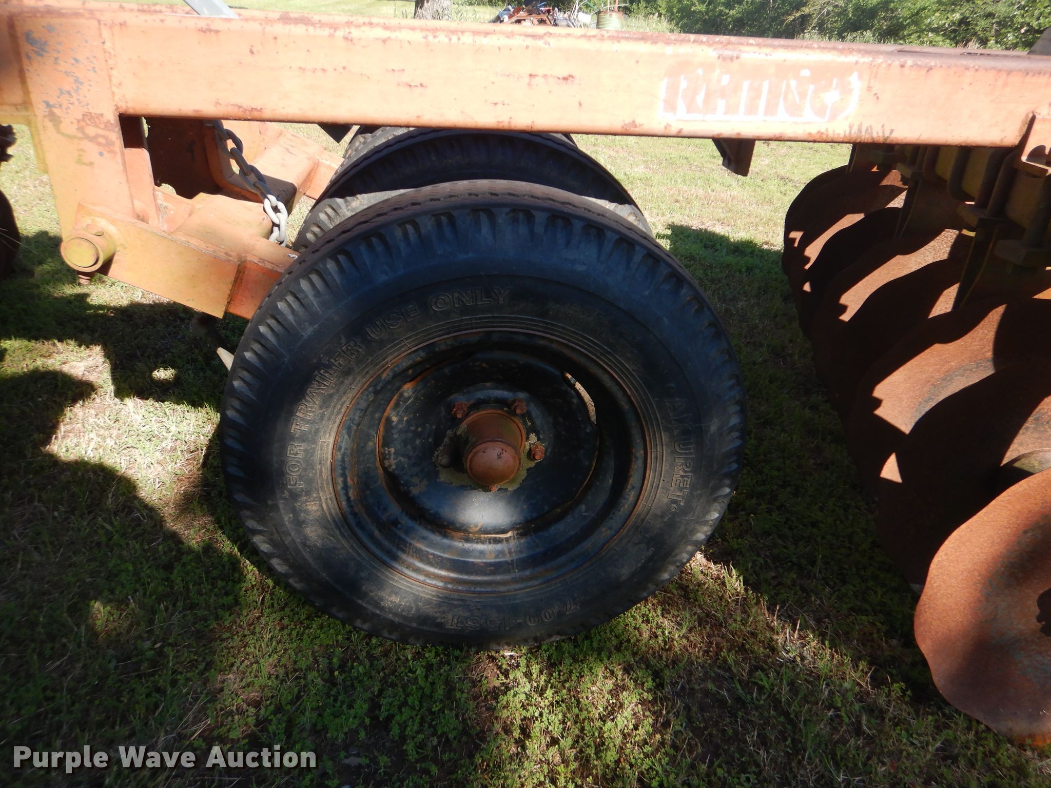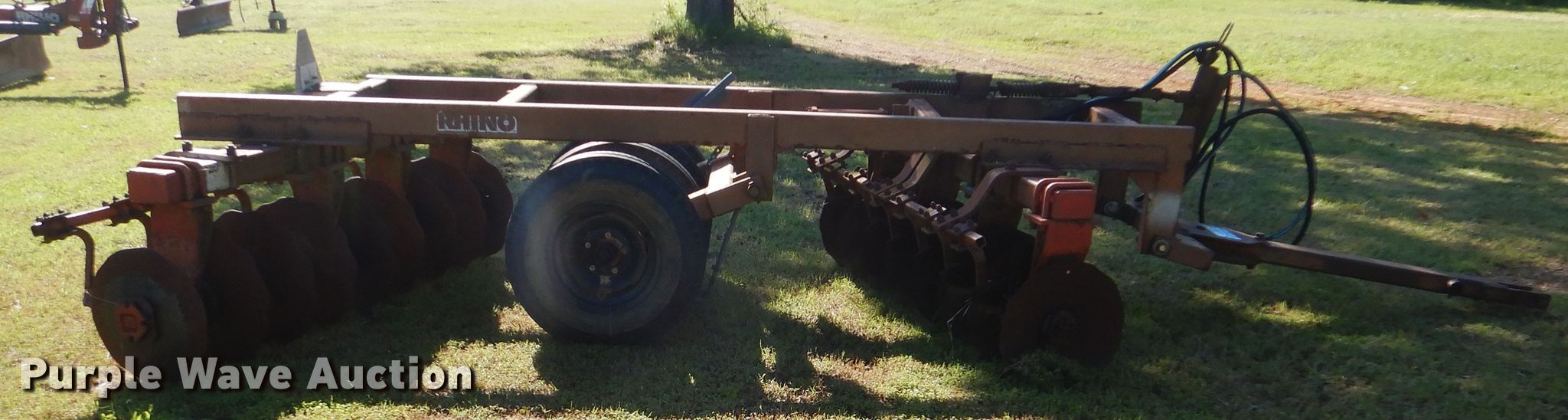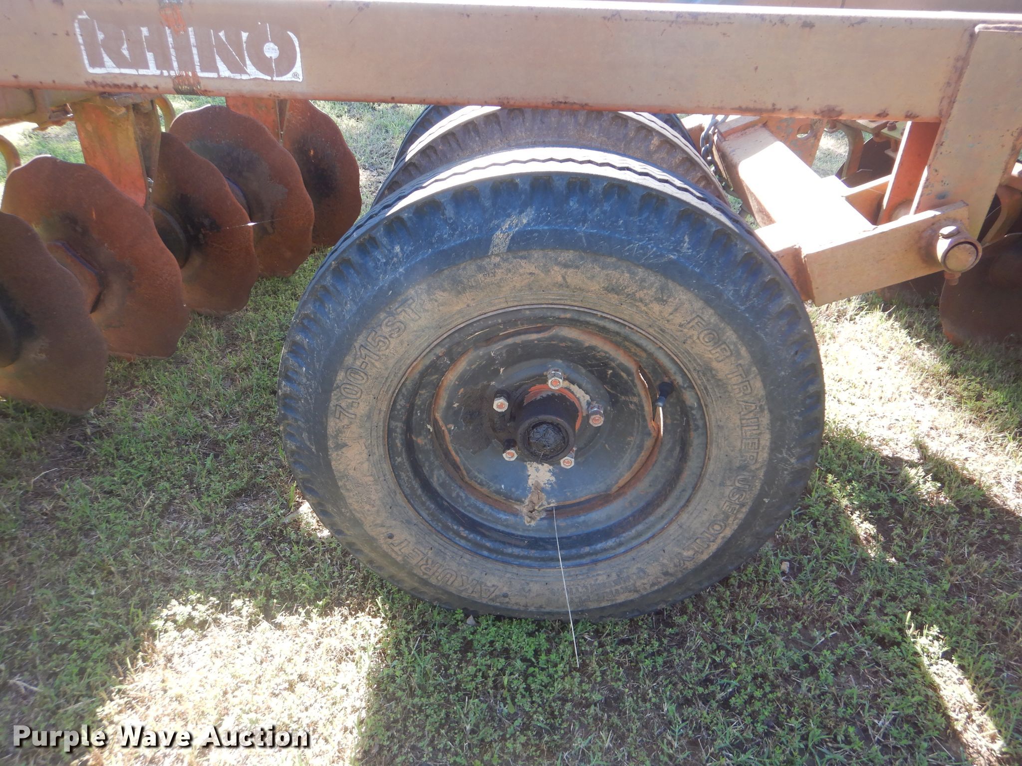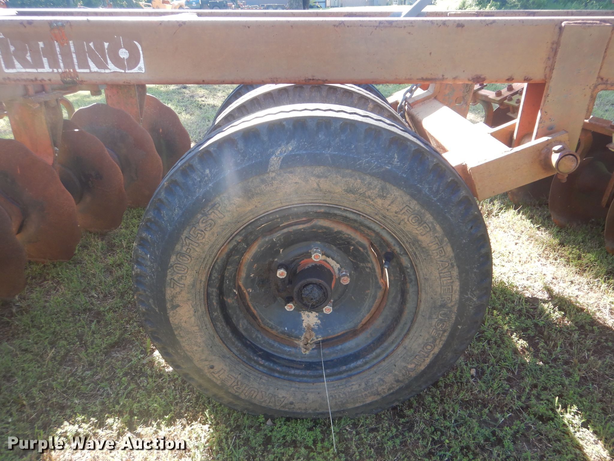 Purple Wave is selling a used Disk in Oklahoma. This item is a Rhino 167 tandem disk with the following: 6.5'W, 19" diameter disks, 10.5" spacing, Hydraulic fold, 7.00-15ST tires