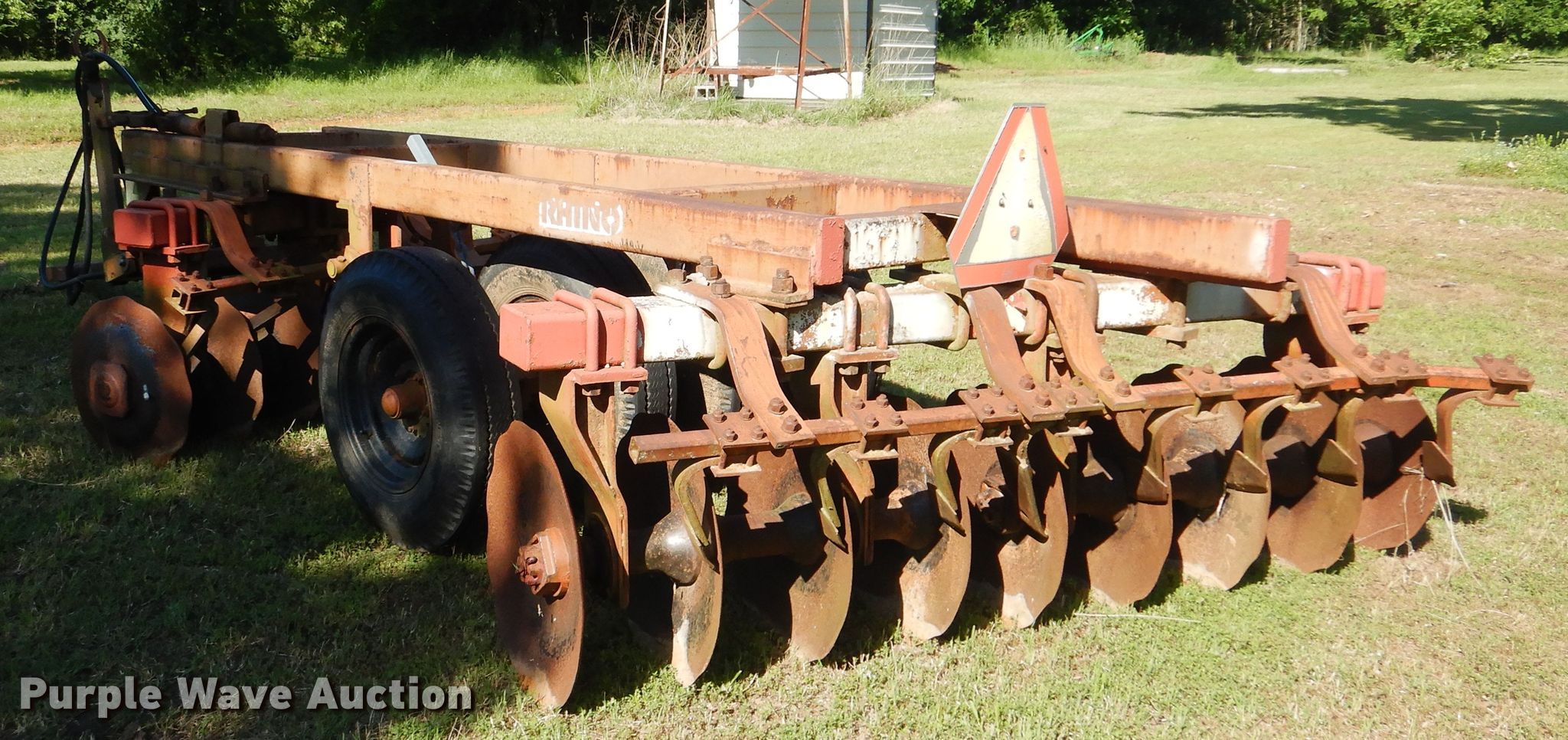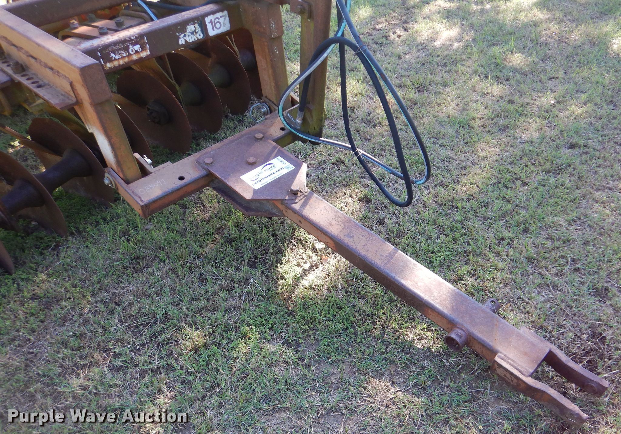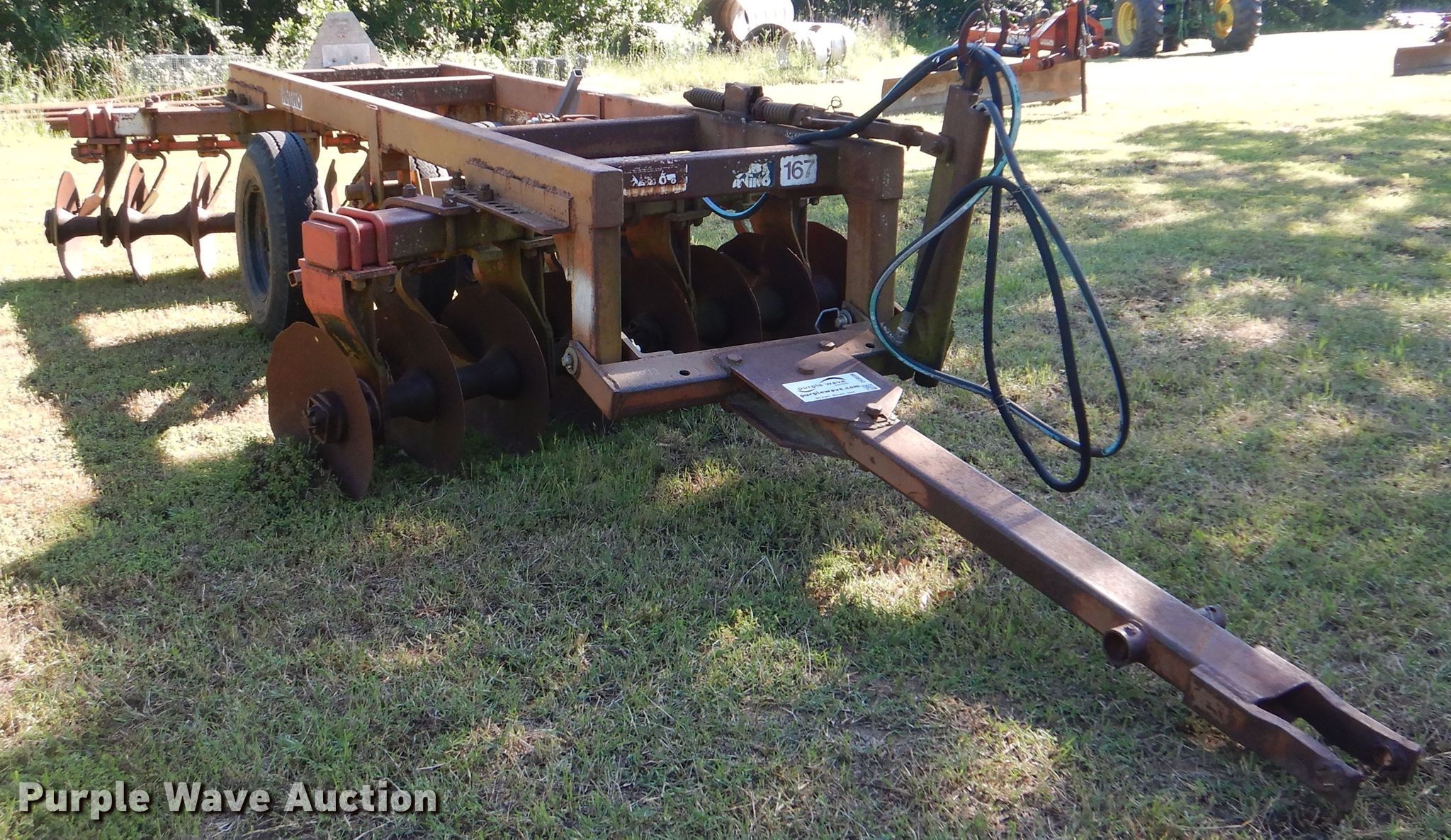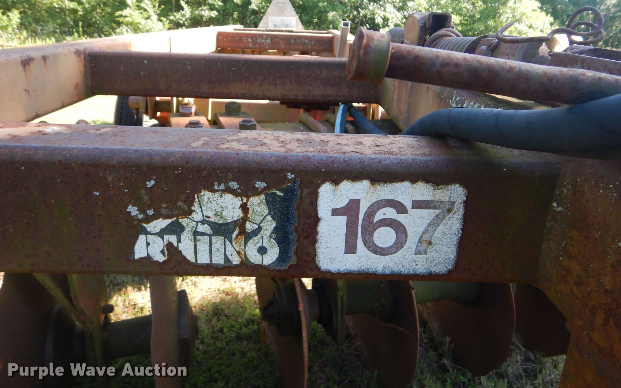 Purple Wave is selling a used Disk in Oklahoma. This item is a Rhino 167 tandem disk with the following: 6.5'W, 19" diameter disks, 10.5" spacing, Hydraulic fold, 7.00-15ST tires