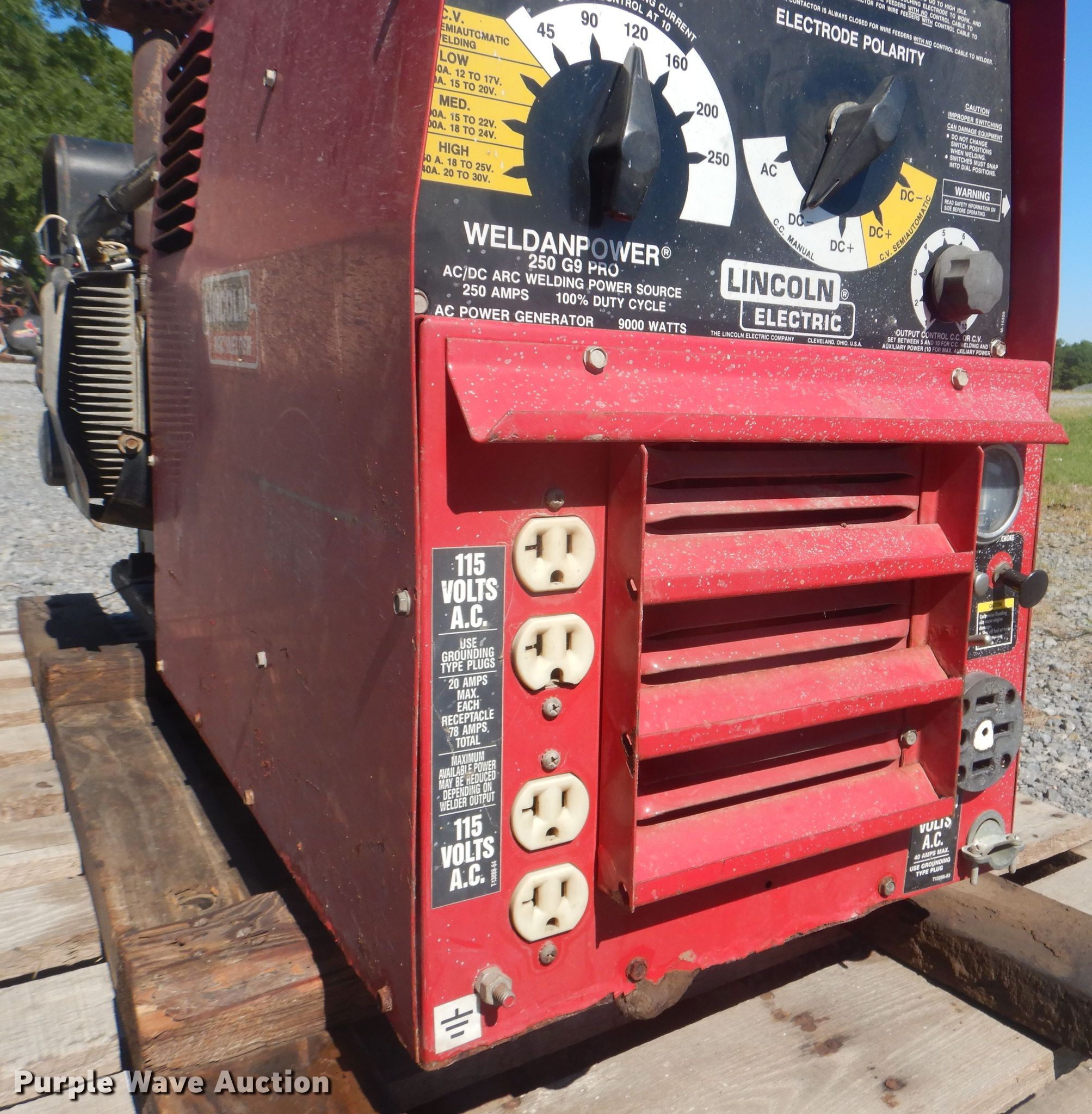 Purple Wave is selling a used Welder (Manual) in Oklahoma. This item is a Lincoln Weldanpower AC/DC arc welder/generator with the following: Onan two cylinder gas engine, 250 amps, 250 amps at 25V output rating, 250 amps at 30V constant voltage output rating, 10 kW auxiliary power rating, 115/230V, 60 Hz, 61" x 25" x 38"