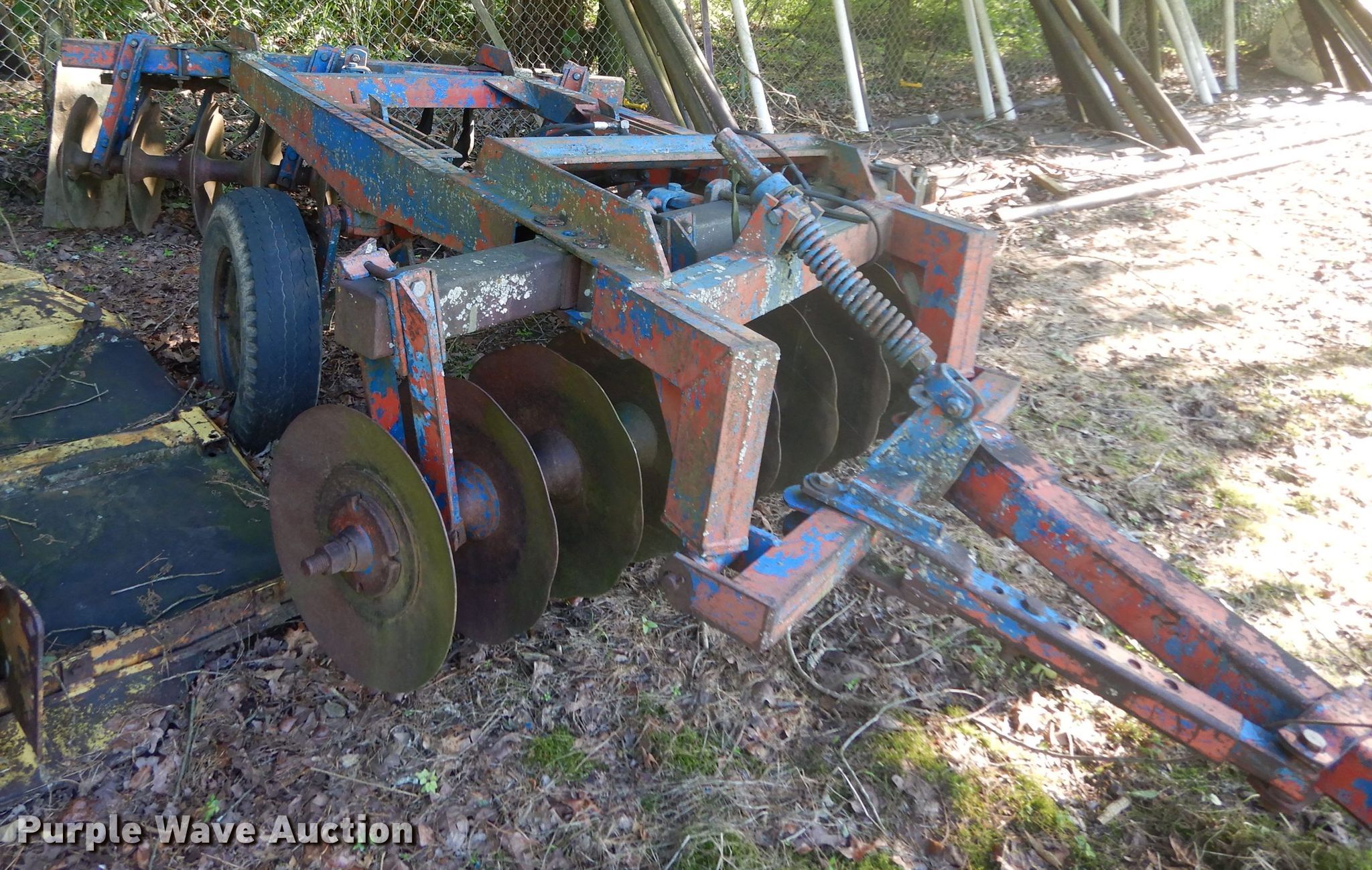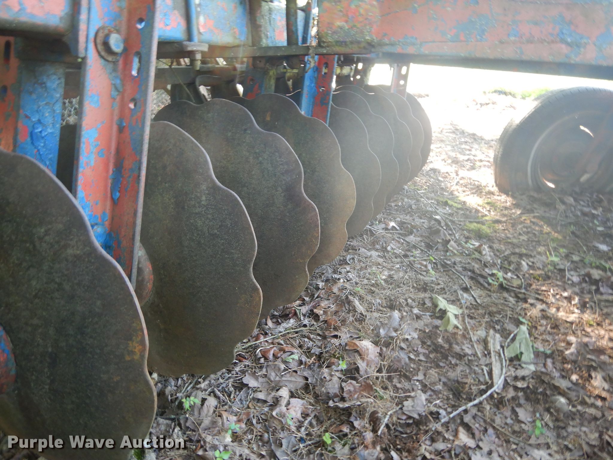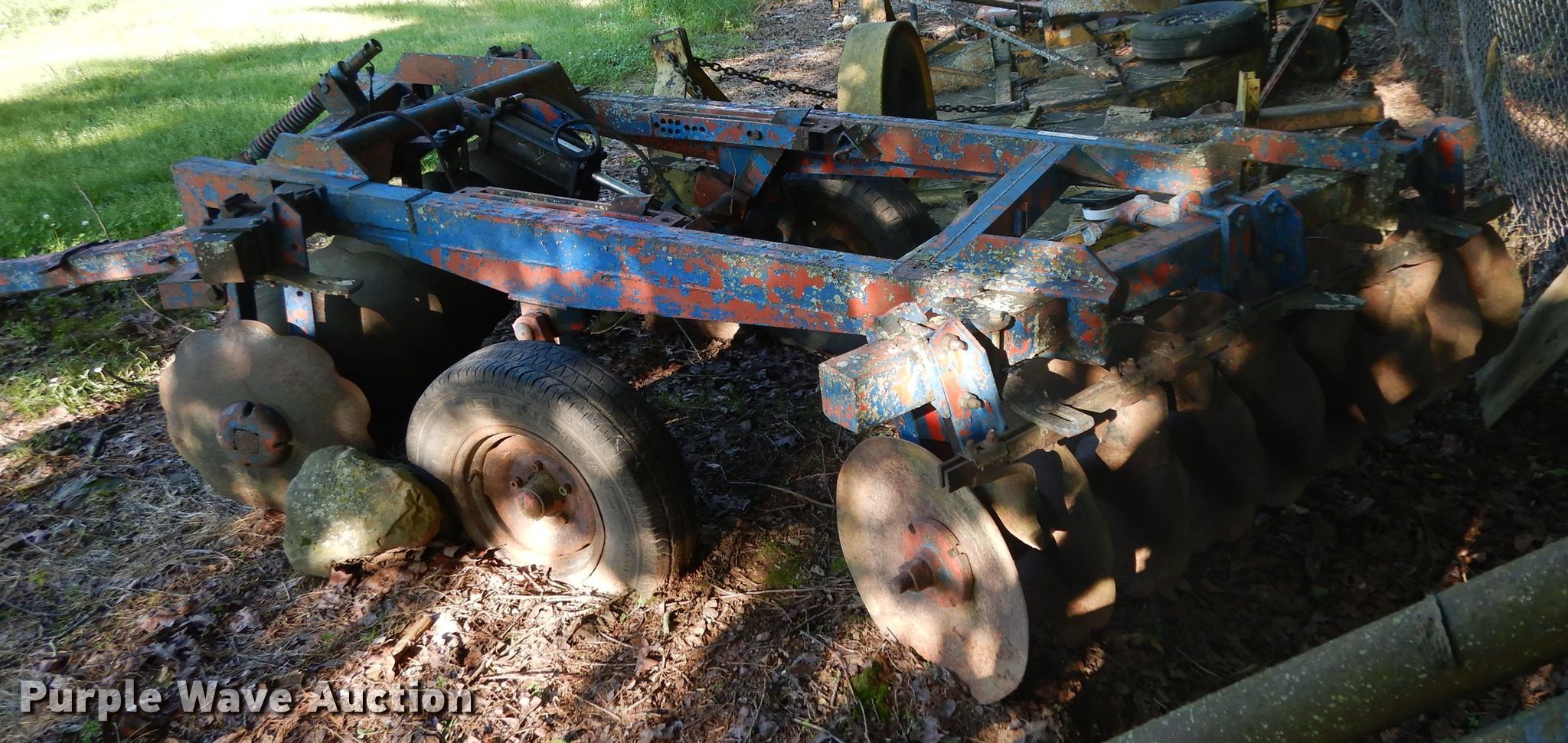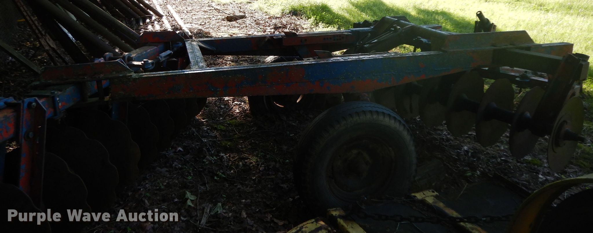 Purple Wave is selling a used Disk in Oklahoma. This item is a Ford 219 off-set disk with the following: 6'W, 14" diameter disks, 10" spacing, Manual leveler, Hydraulic lift, 8.50-14 tires, Serial 001411