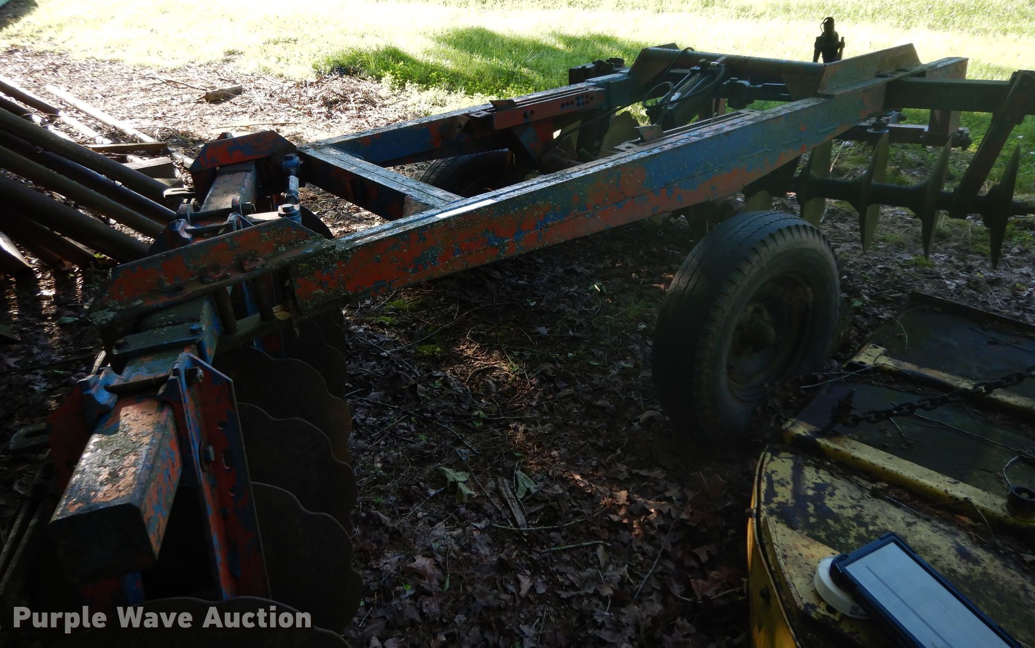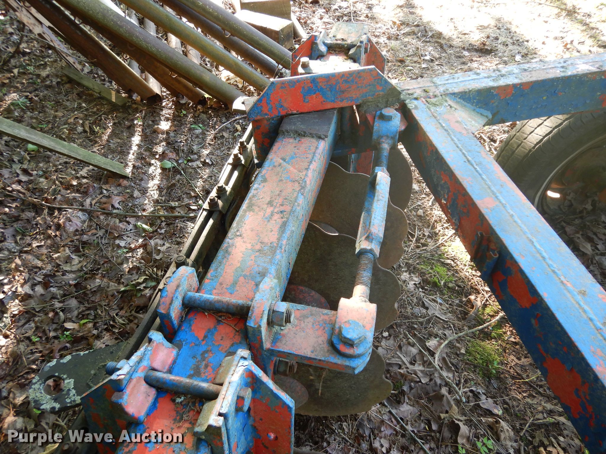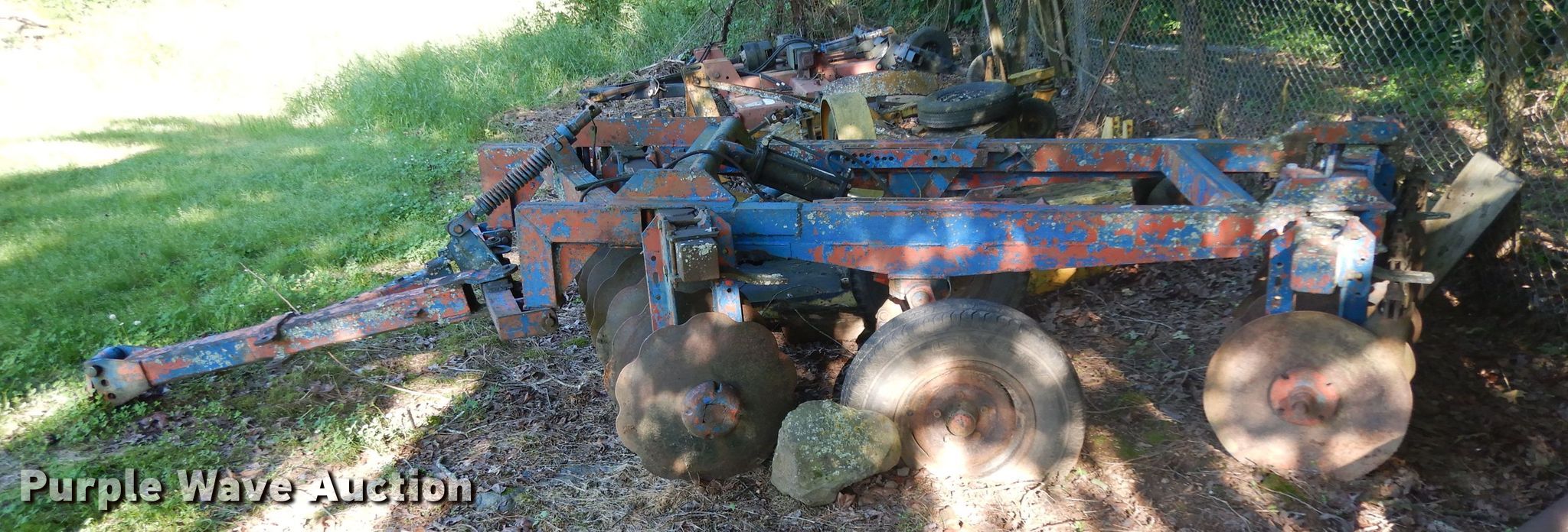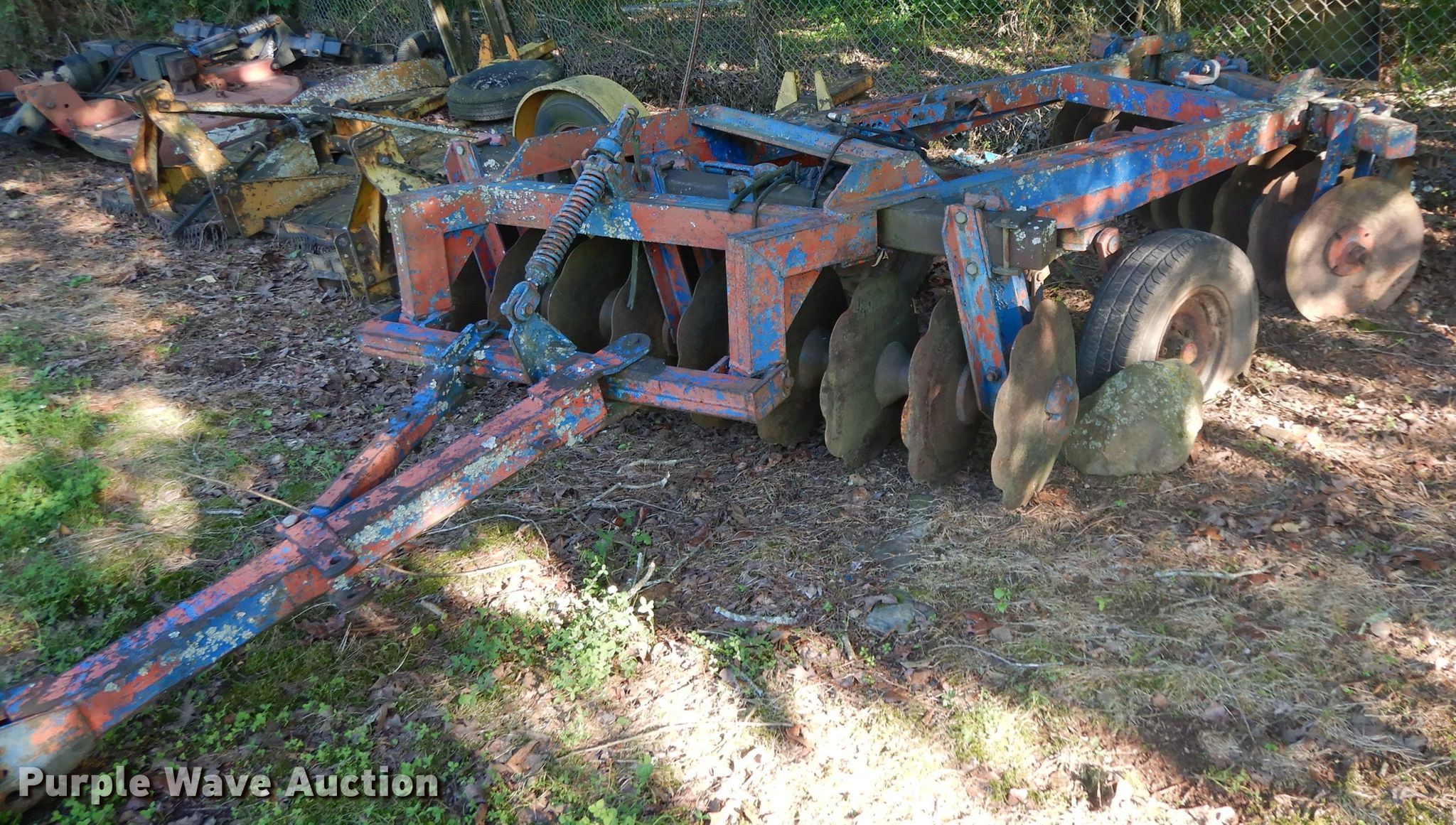 Purple Wave is selling a used Disk in Oklahoma. This item is a Ford 219 off-set disk with the following: 6'W, 14" diameter disks, 10" spacing, Manual leveler, Hydraulic lift, 8.50-14 tires, Serial 001411
