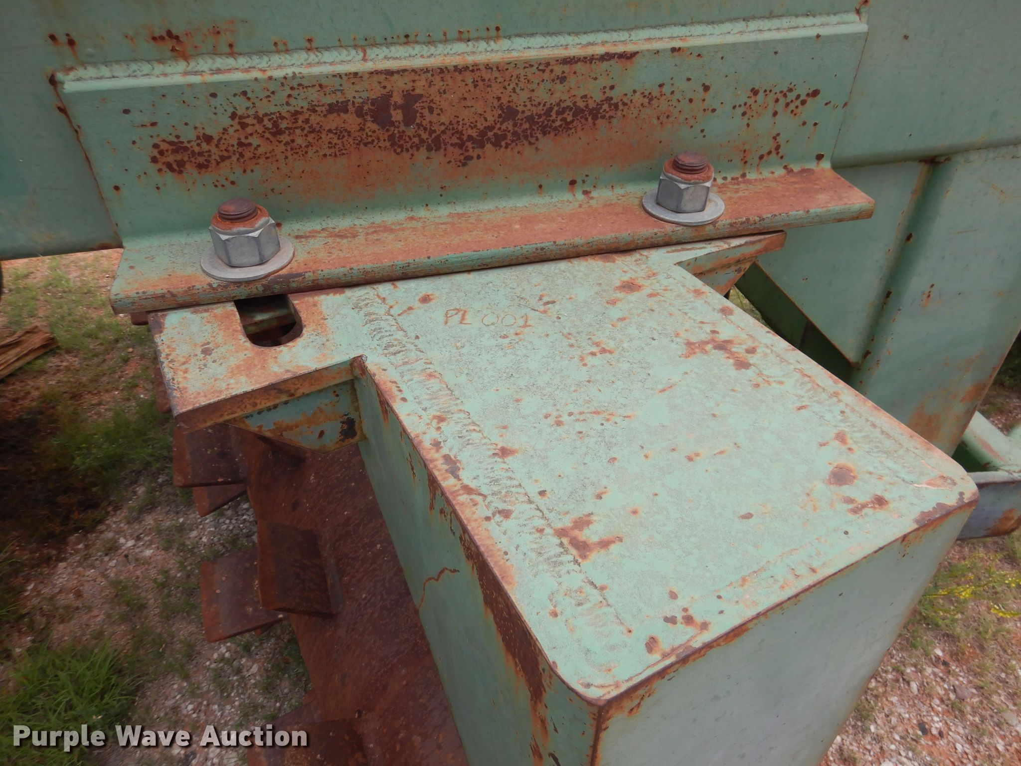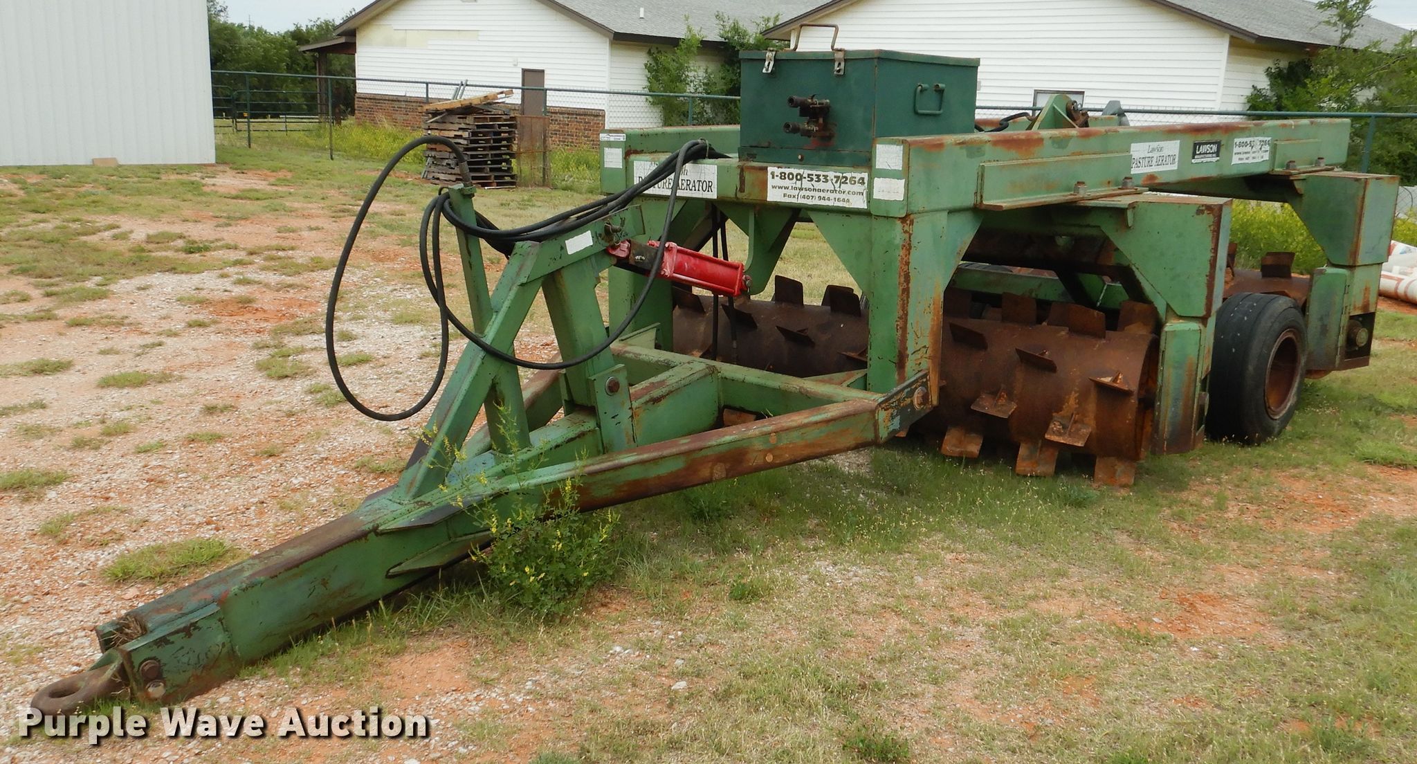 Purple Wave is selling a used Rotary Tillage in Oklahoma. This item is a Lawson pasture aerator with the following: 263"L x 101"W overall, 7'W x 20" diameter drums, Hydraulic lift, Dozer package, 30x11.50 tires, Hydraulic cylinder leaks