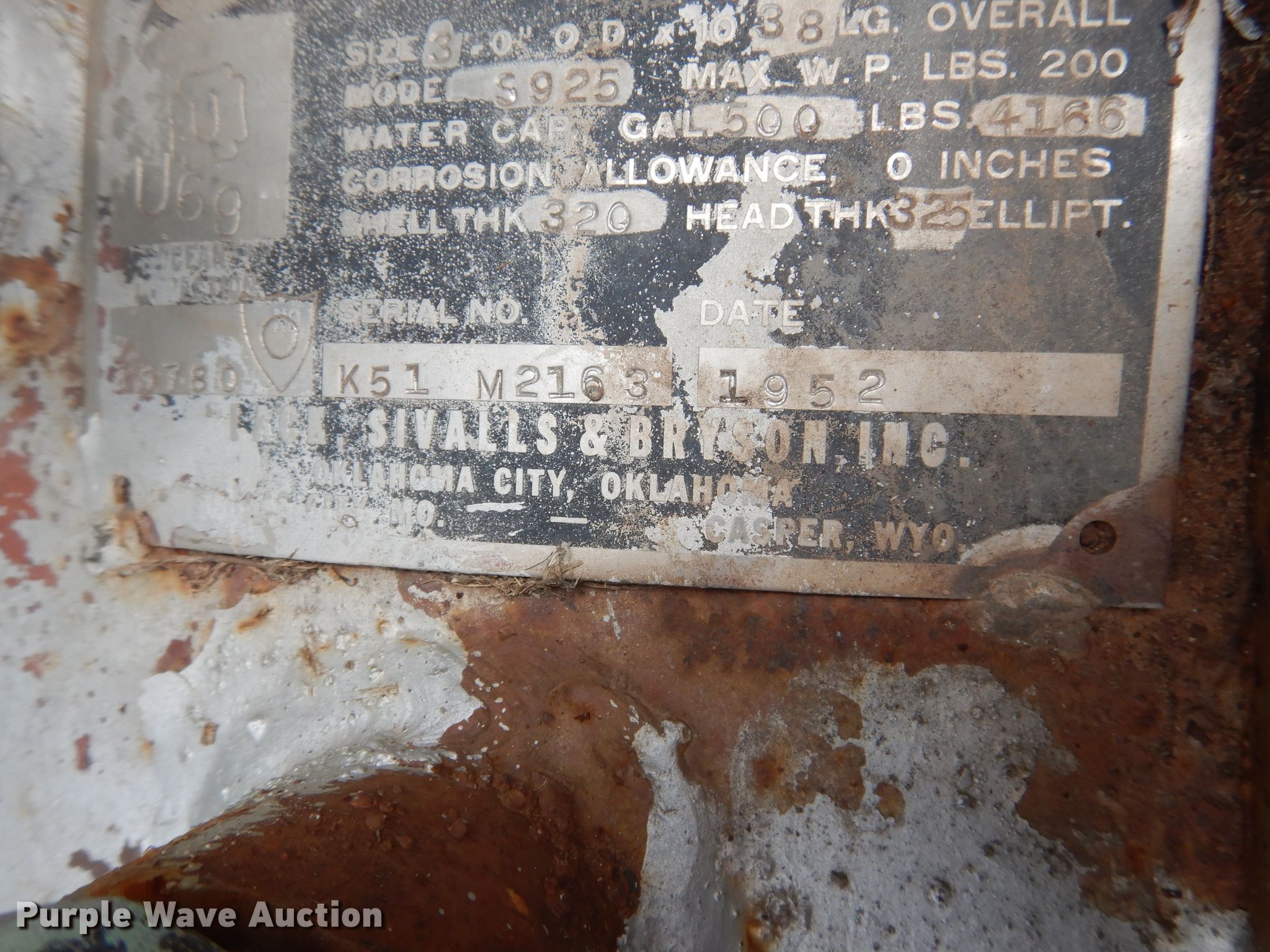 Purple Wave is selling a used Fuel and Lube in Oklahoma. This item is a 1952 propane tank with the following: 500 gallon capacity, Serial K51M2163