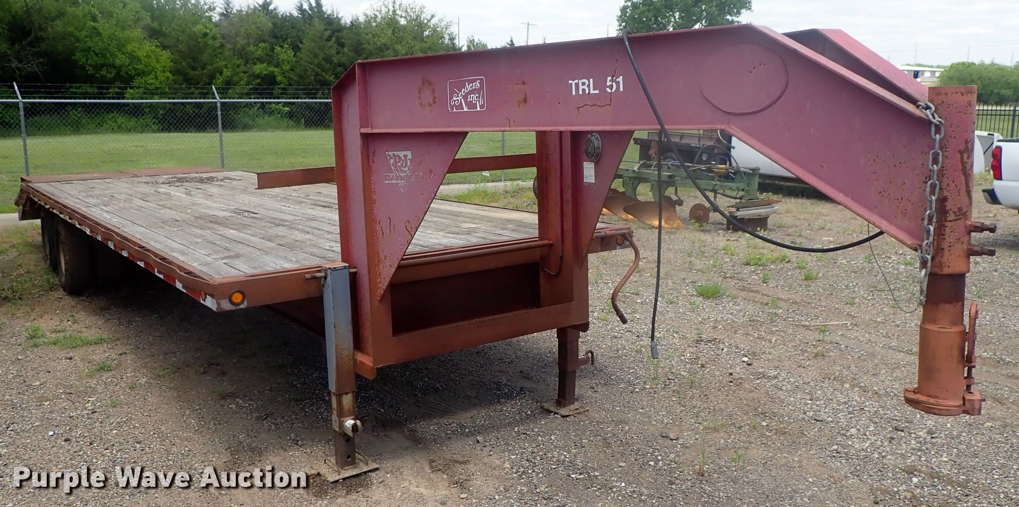 1996 PJ equipment trailer. 30'L overall, 25'L x 92"W wood deck, 5' tail length, Dual leg landing gear, Spring suspension, Electric brakes, Tandem axle, Steel wheels, 235/85R16 tires. Kansas title. 4P56F3029T1118388. Seeders Inc.. 4111 S Broad St. Wichita, KS 67215