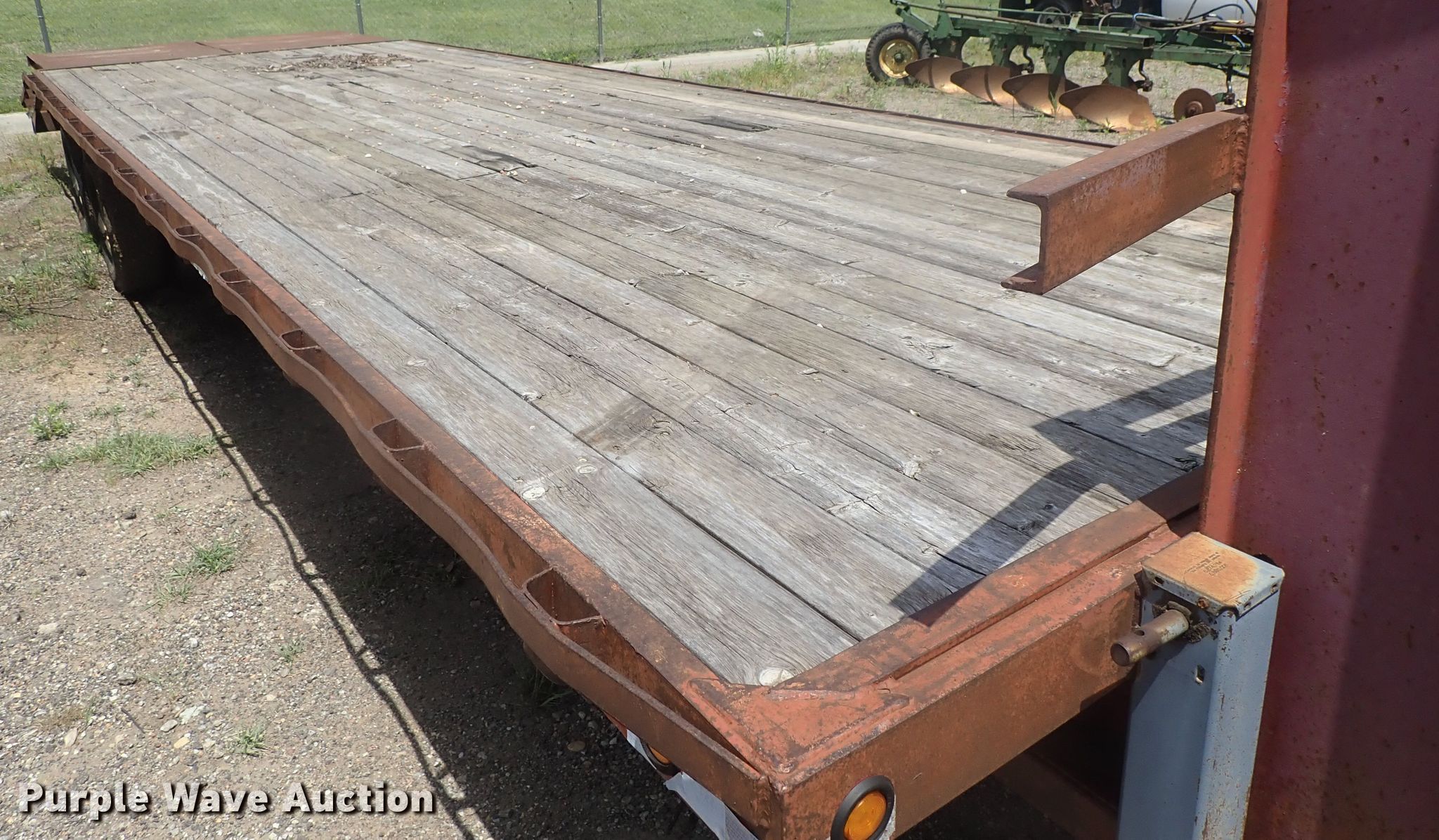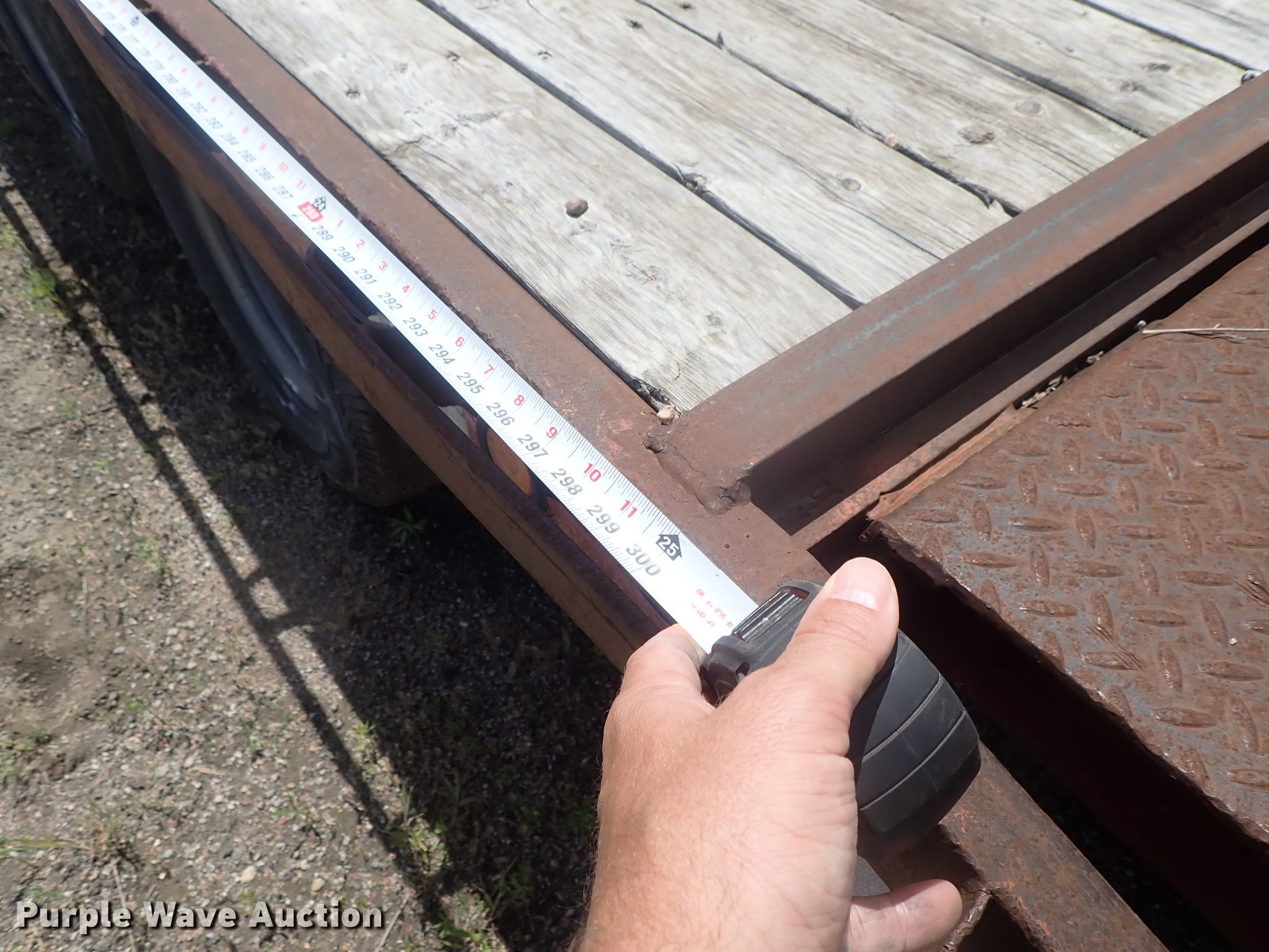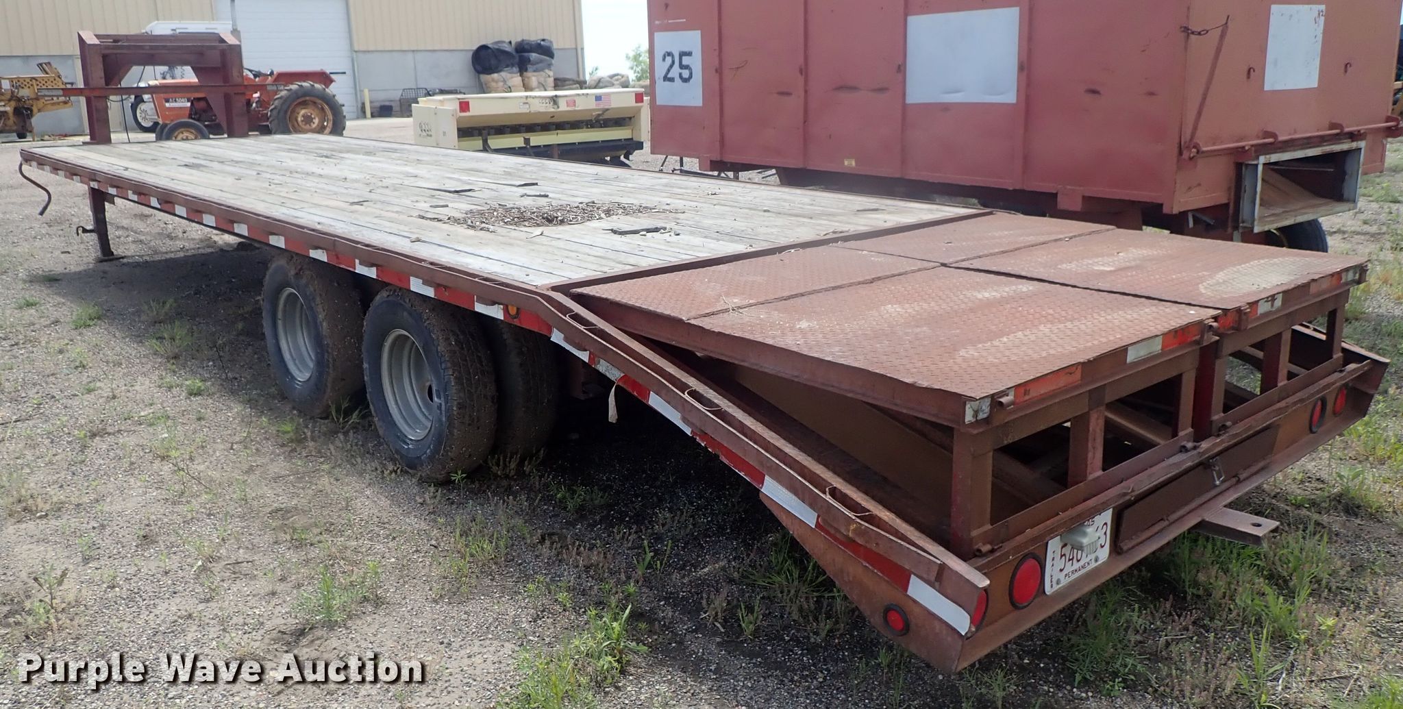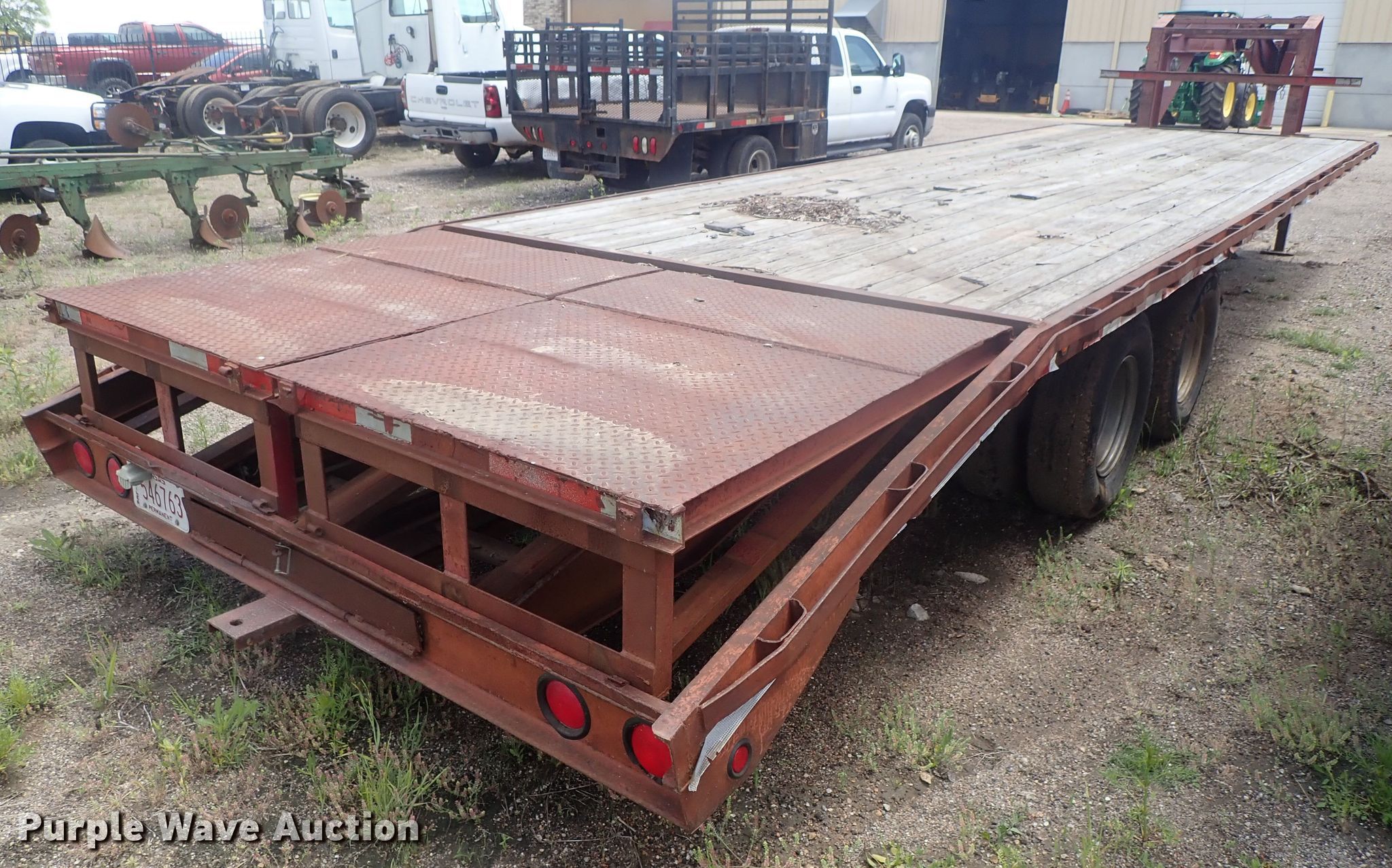 Purple Wave is selling a used Equip. Trailer in Kansas. This item is a 1996 PJ equipment trailer with the following: 30'L overall, 25'L x 92"W wood deck, 5' tail length, Dual leg landing gear, Spring suspension, Electric brakes, Tandem axle, Steel wheels, 235/85R16 tires