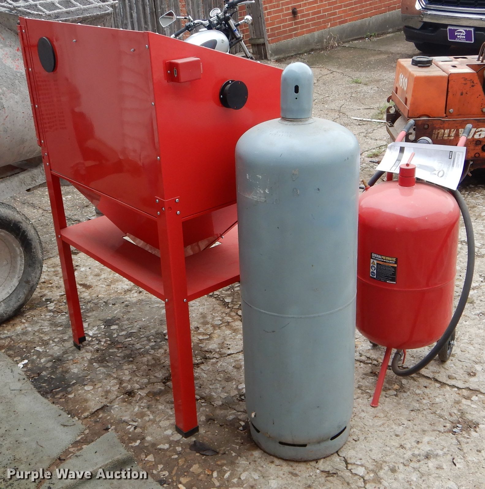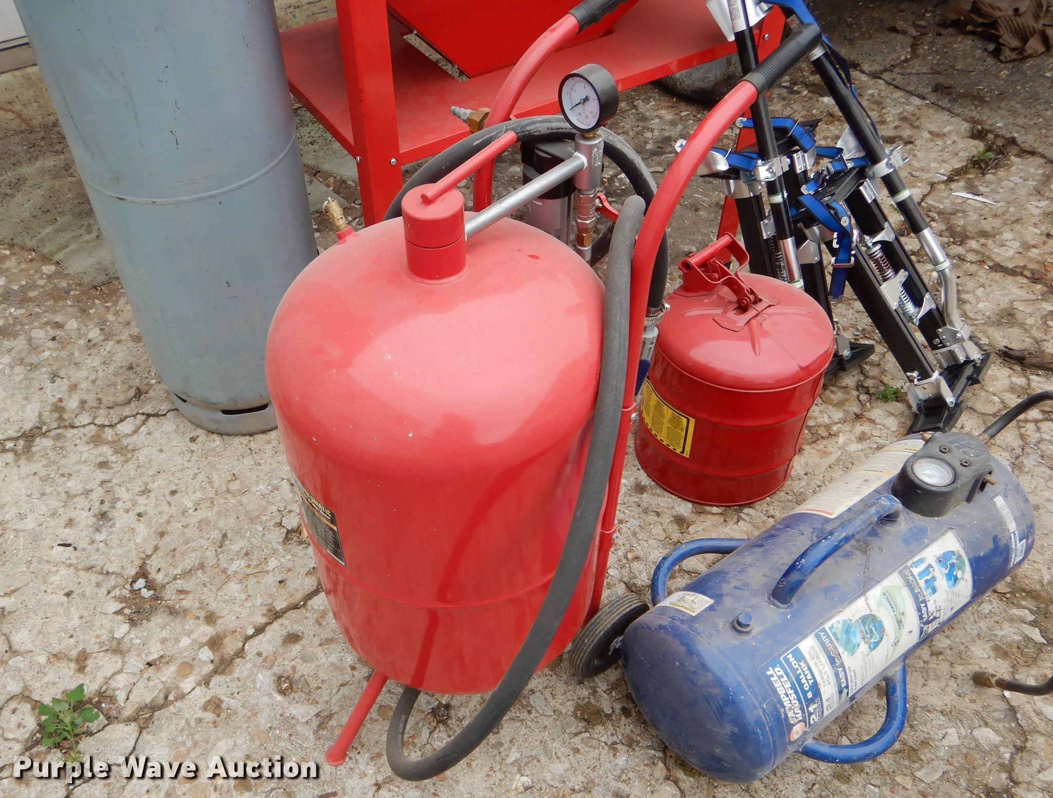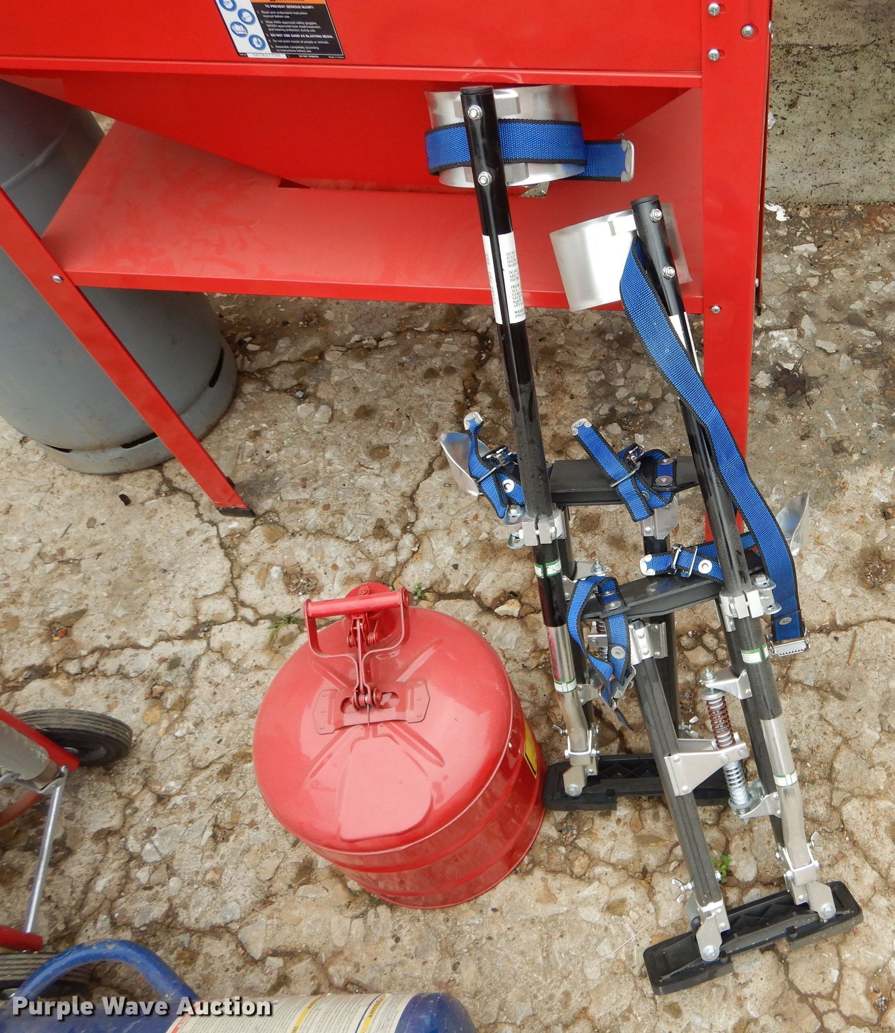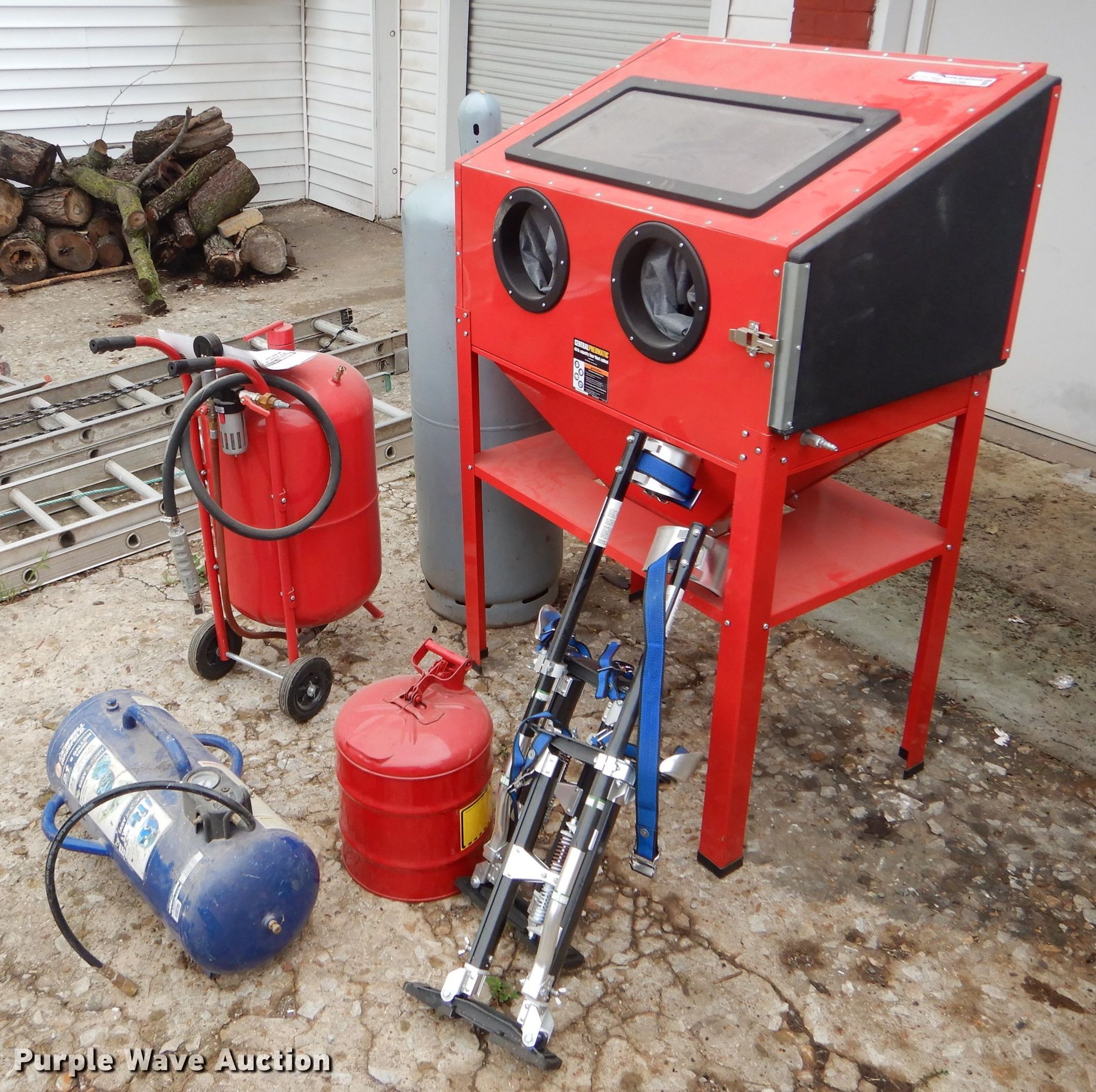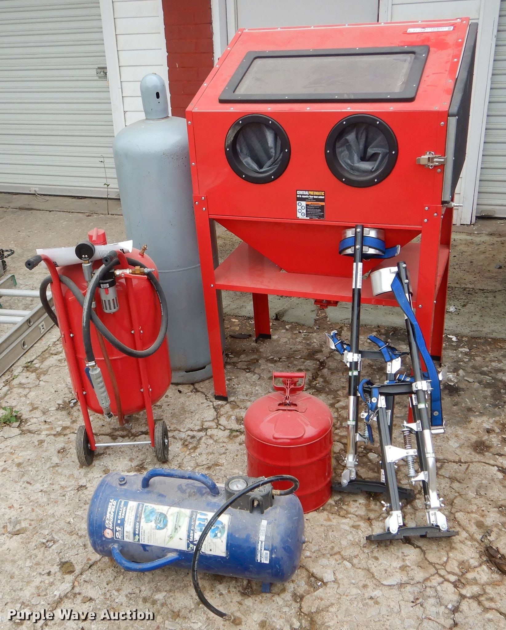 Purple Wave is selling a used Tools in Missouri. This item is a Tools with the following: Air tank, 150 maximum psi, Eight gallon capacity, Stilts, Justrite fuel tank, Five gallon capacity, Central Pneumatic media blaster, 110 lbs, Hackney 43" x 14" propane tank, Central Pneumatic blast cabinet, 40 lbs capacity
