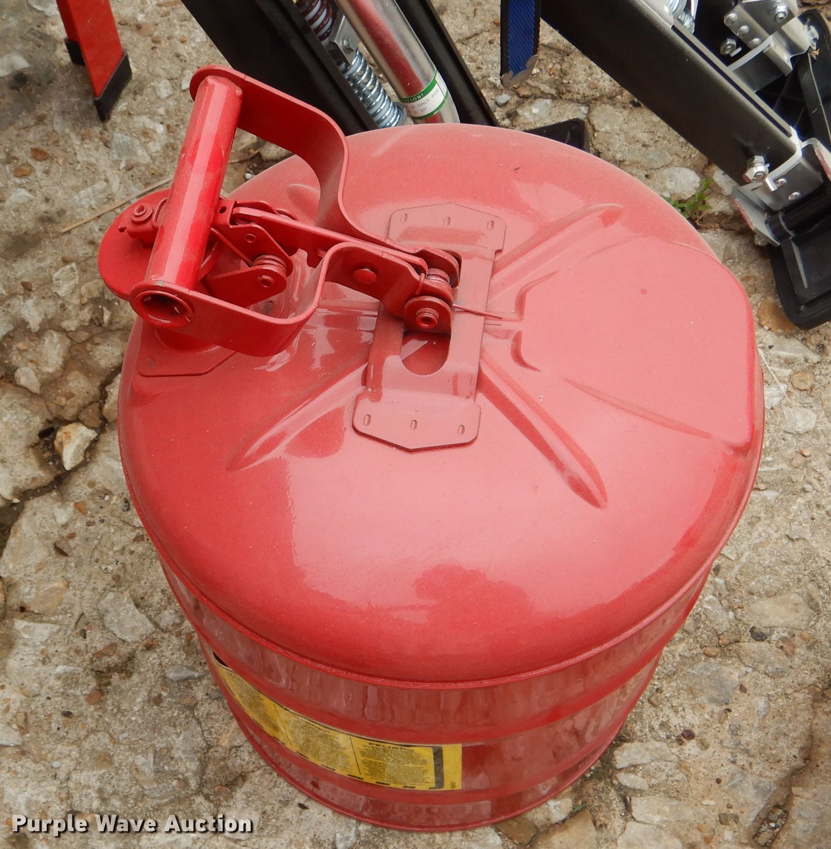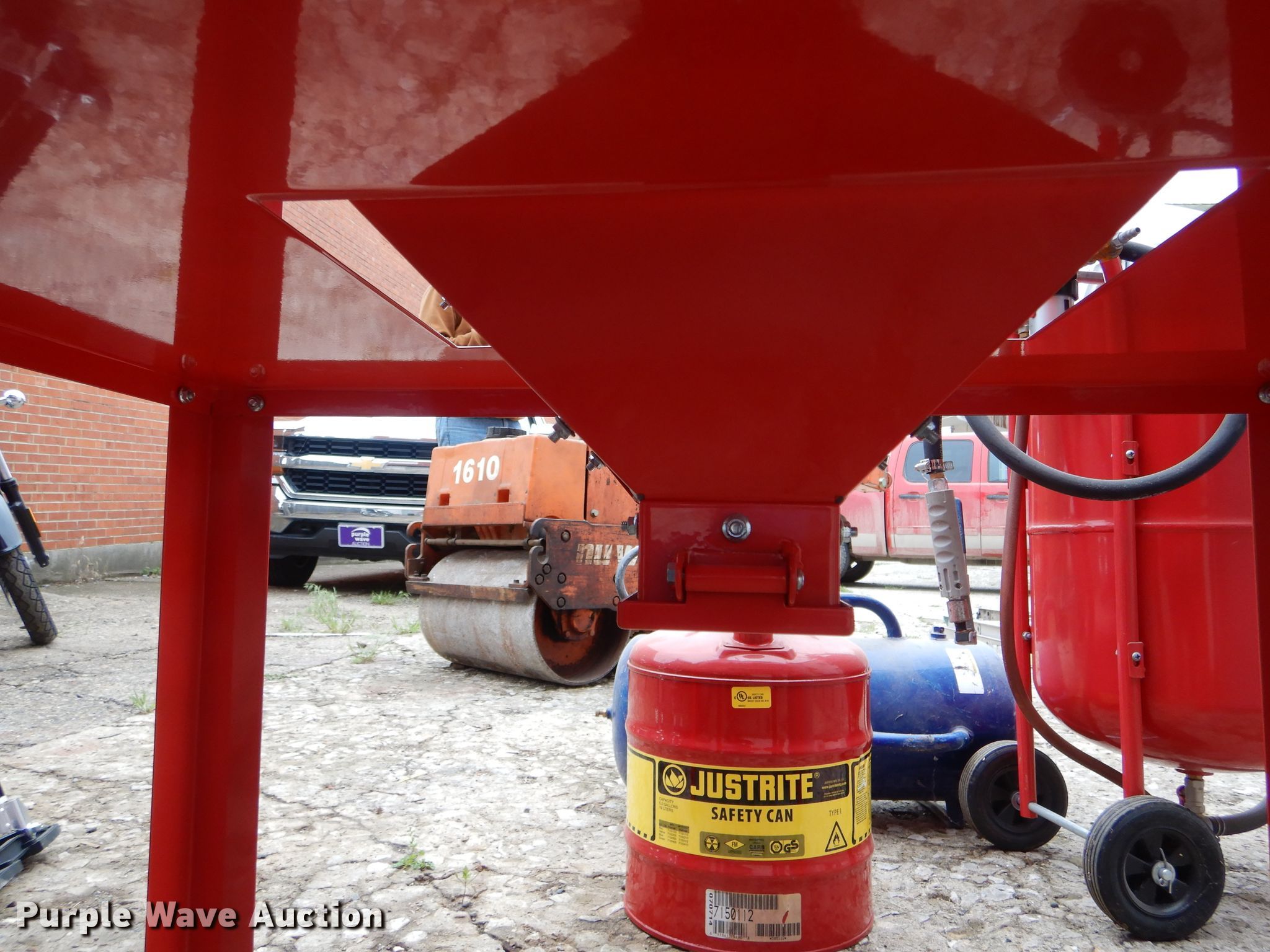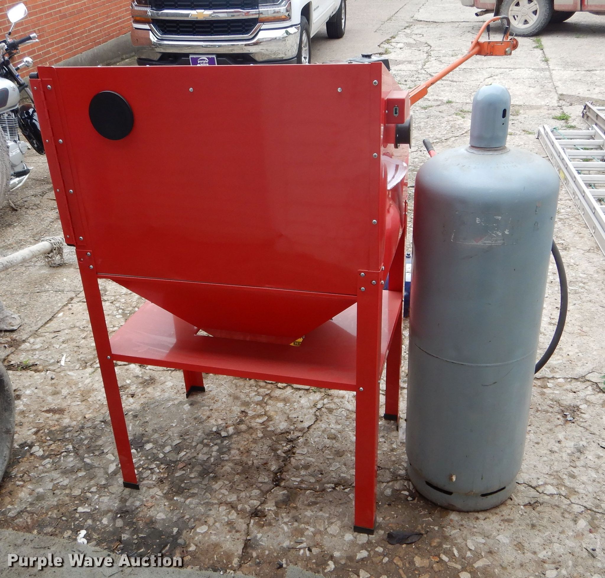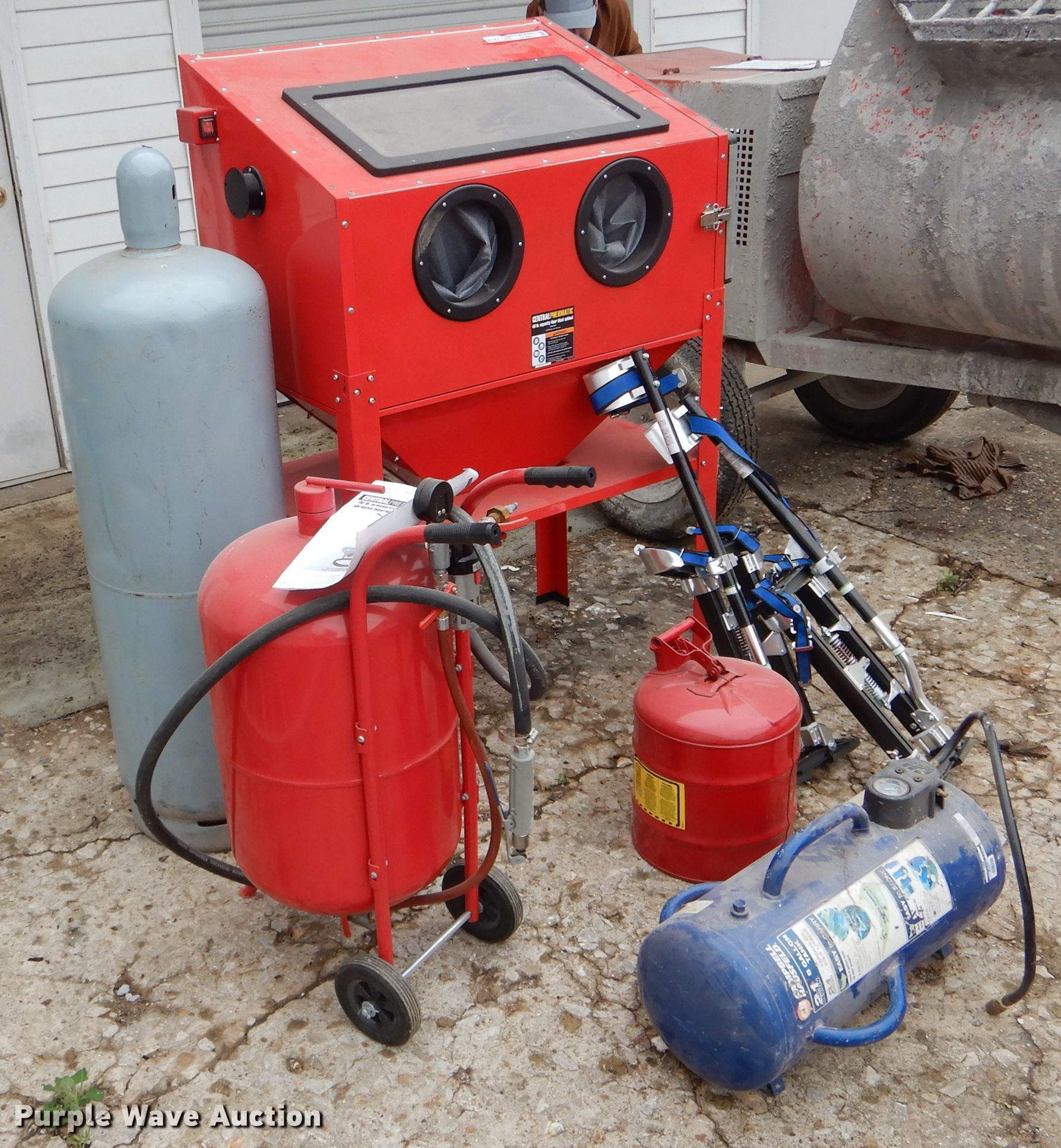 Purple Wave is selling a used Tools in Missouri. This item is a Tools with the following: Air tank, 150 maximum psi, Eight gallon capacity, Stilts, Justrite fuel tank, Five gallon capacity, Central Pneumatic media blaster, 110 lbs, Hackney 43" x 14" propane tank, Central Pneumatic blast cabinet, 40 lbs capacity