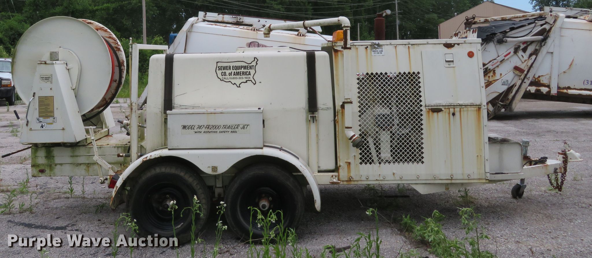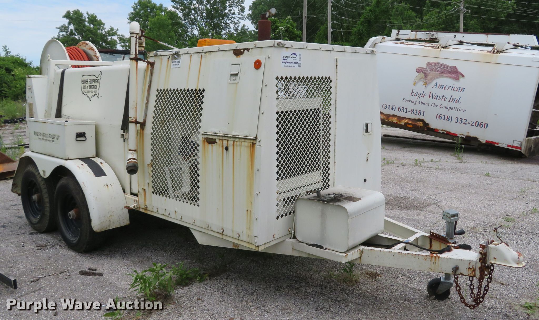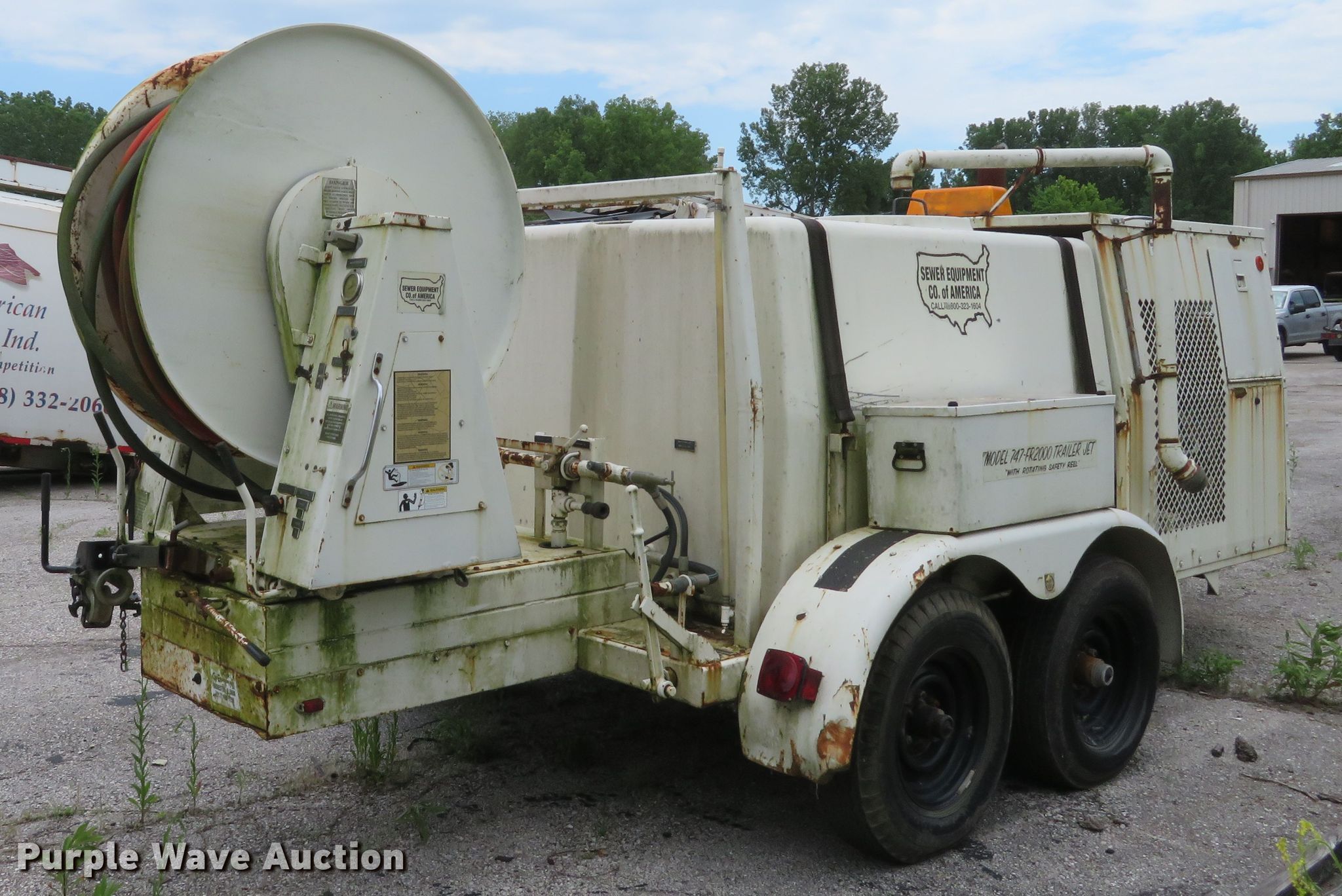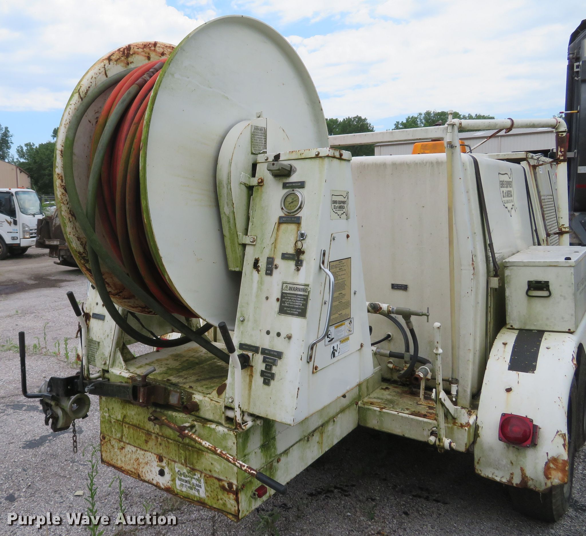 Purple Wave is selling a used Trailer Other in Missouri. This item is a Sewer Equipment Company 747-FR2000 sewer jetter with the following: GM four cylinder gas engine, FMC water pump, Water tank, Hose reel, Hose, 2 5/16" ball hitch, Spring suspension, Tandem axle, 7.00x15 tires, Serial 7044