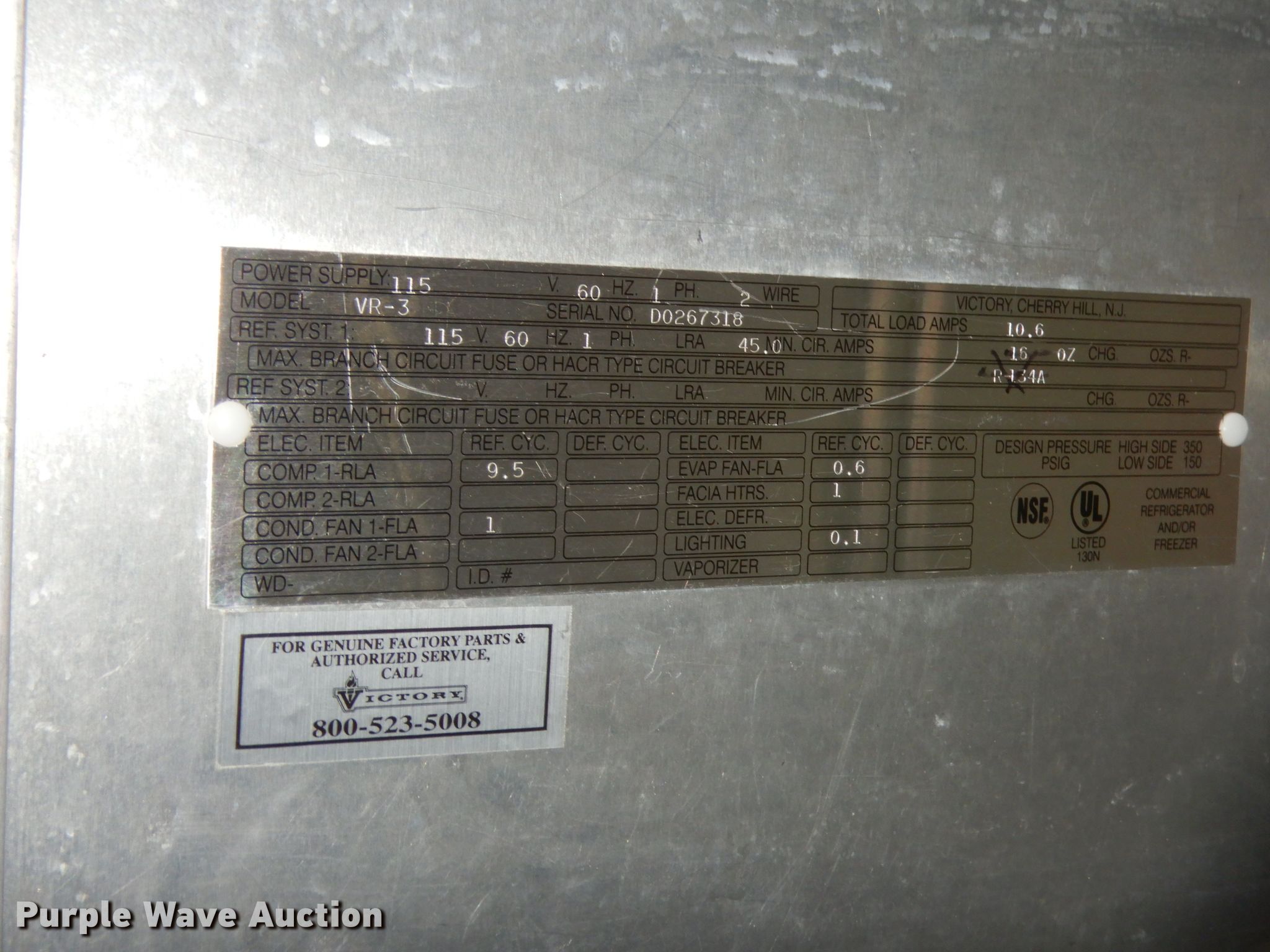 Purple Wave is selling a used Appliances in Kansas. This item is a Victory VR-3 refrigerator/freezer with the following: 115V, Single phase, (3) doors, Serial D0267318