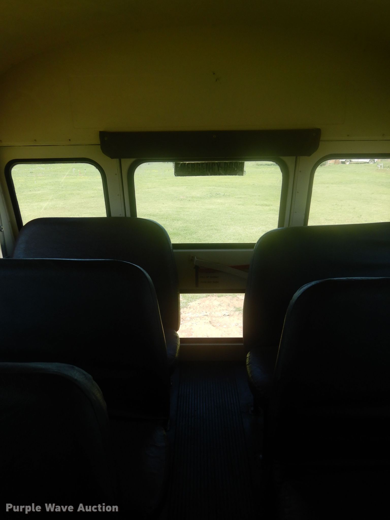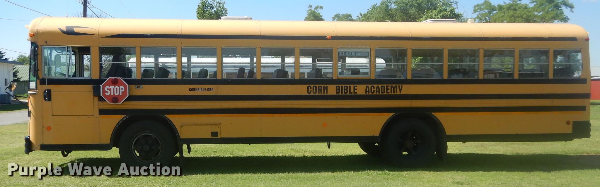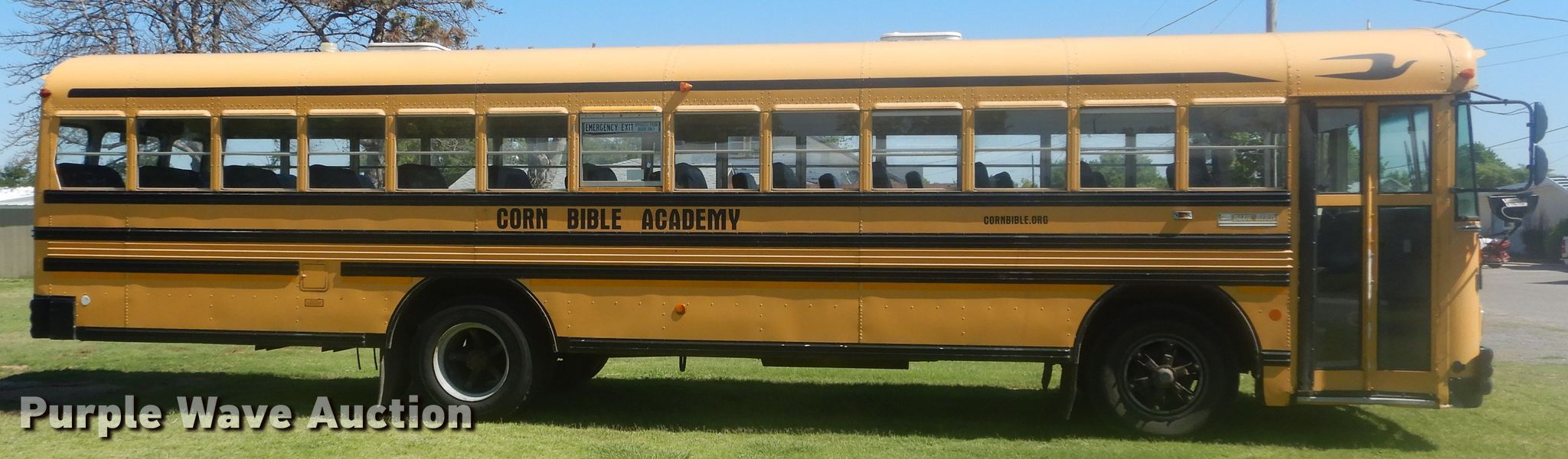1999 Blue Bird TC2000 school bus. 269,539 miles on odometer. Engine Cummins ISB, Displacement: 5.9L, Cylinders: 6, Fuel type: Diesel. Transmission Automatic. Chassis Axles: Single, Suspension: Spring, Brakes: Hydraulic, GVWR: 30,000 lbs. Interior Heat, Auxiliary controls, Passengers: 72. Tires Front: 295.75R22.5, Rear: 10R22.5. Notes Dash cluster has been replaced with used dash cluster Approx. 150,000 total miles. Oklahoma title. 1BAAHCSH7XF085020. Corn Bible Academy. 208 N Reimer St. Corn, OK 73024