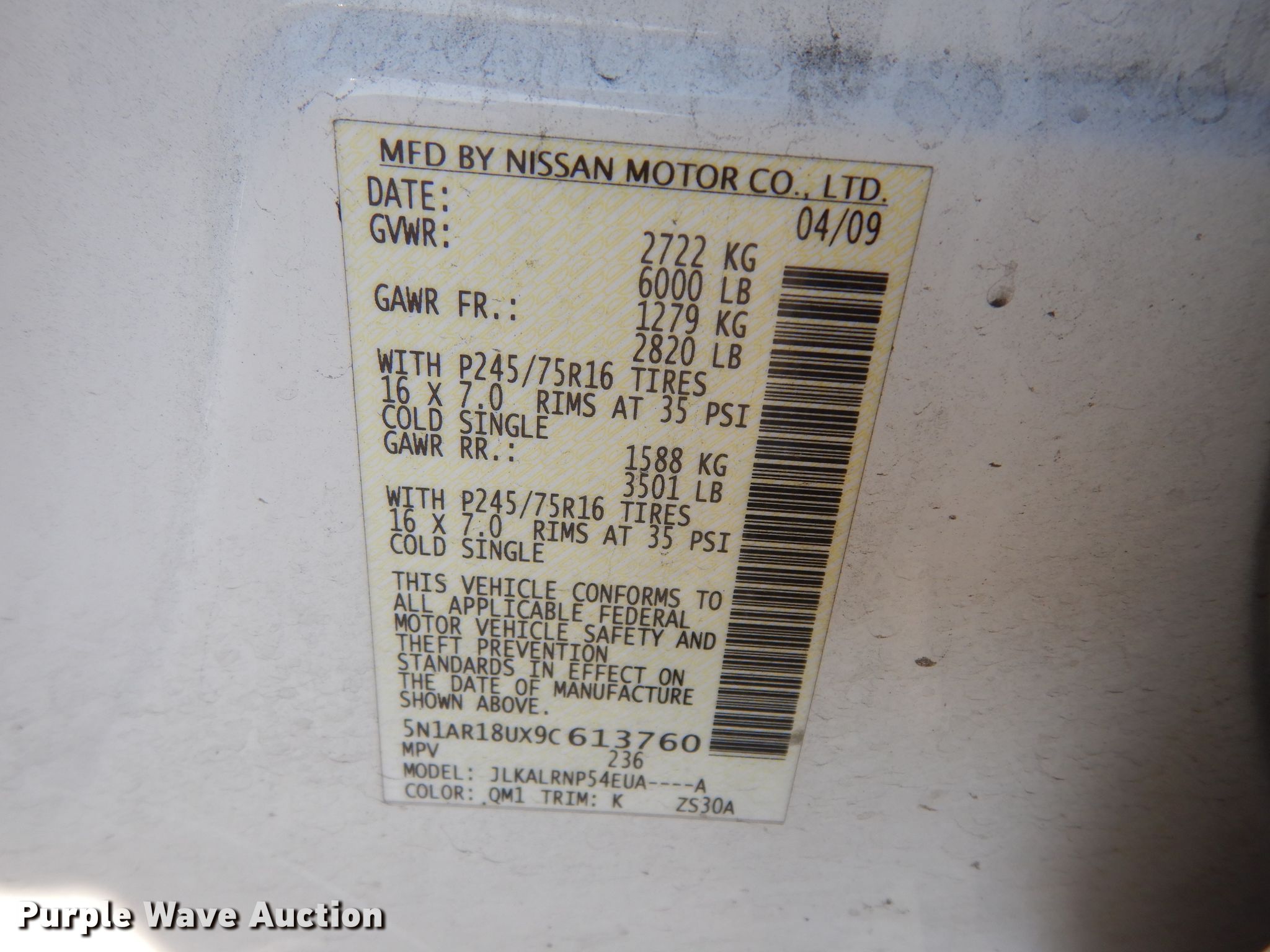 2009 Nissan Pathfinder SUV. 116,838 miles on odometer. Engine Displacement: 4.0L V6 DOHC 24V, Cylinders: 6. Transmission Automatic. Interior AC, Heat, Power windows, Power locks, Cruise control. Tires Size: 245/75R16. Notes Windshield chipped, Battery dead. Kansas title. Title history is unknown. Seized vehicle. Condition and history are unknown. No additional information is available. Title distribution may be delayed up to 30 days from verification of funds. 5N1AR18UX9C613760. Junction City, KS 66441