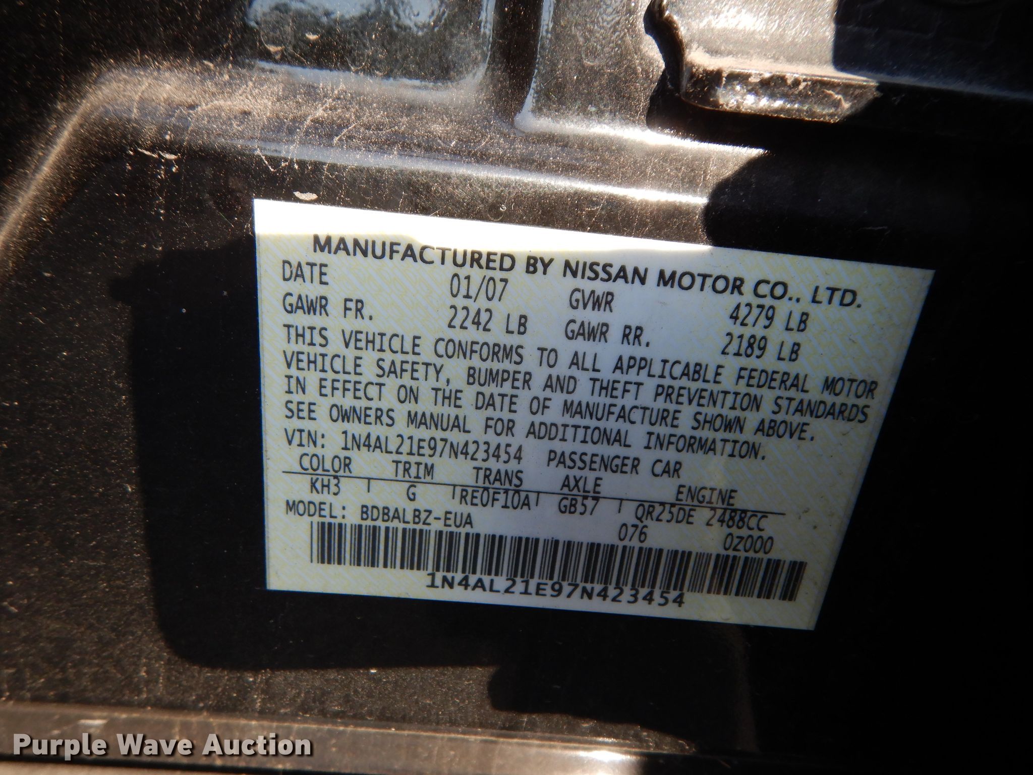2007 Nissan Altima SL. 124,067 miles on odometer. Engine Displacement: 2.5L L4 DOHC 16V, Cylinders: 4, Fuel type: Gas. Transmission Automatic. Interior AC, Heat, Seat: Power driver, Power windows, Power locks, Cruise control, Powered sunroof. Tires Size: 225/60R16. Notes Windshield cracked, Tires flat, Battery dead. Kansas title. Title history is unknown. Seized vehicle. Condition and history are unknown. No additional information is available. Title distribution may be delayed up to 30 days from verification of funds. 1N4AL21E97N423454. Junction City, KS 66441