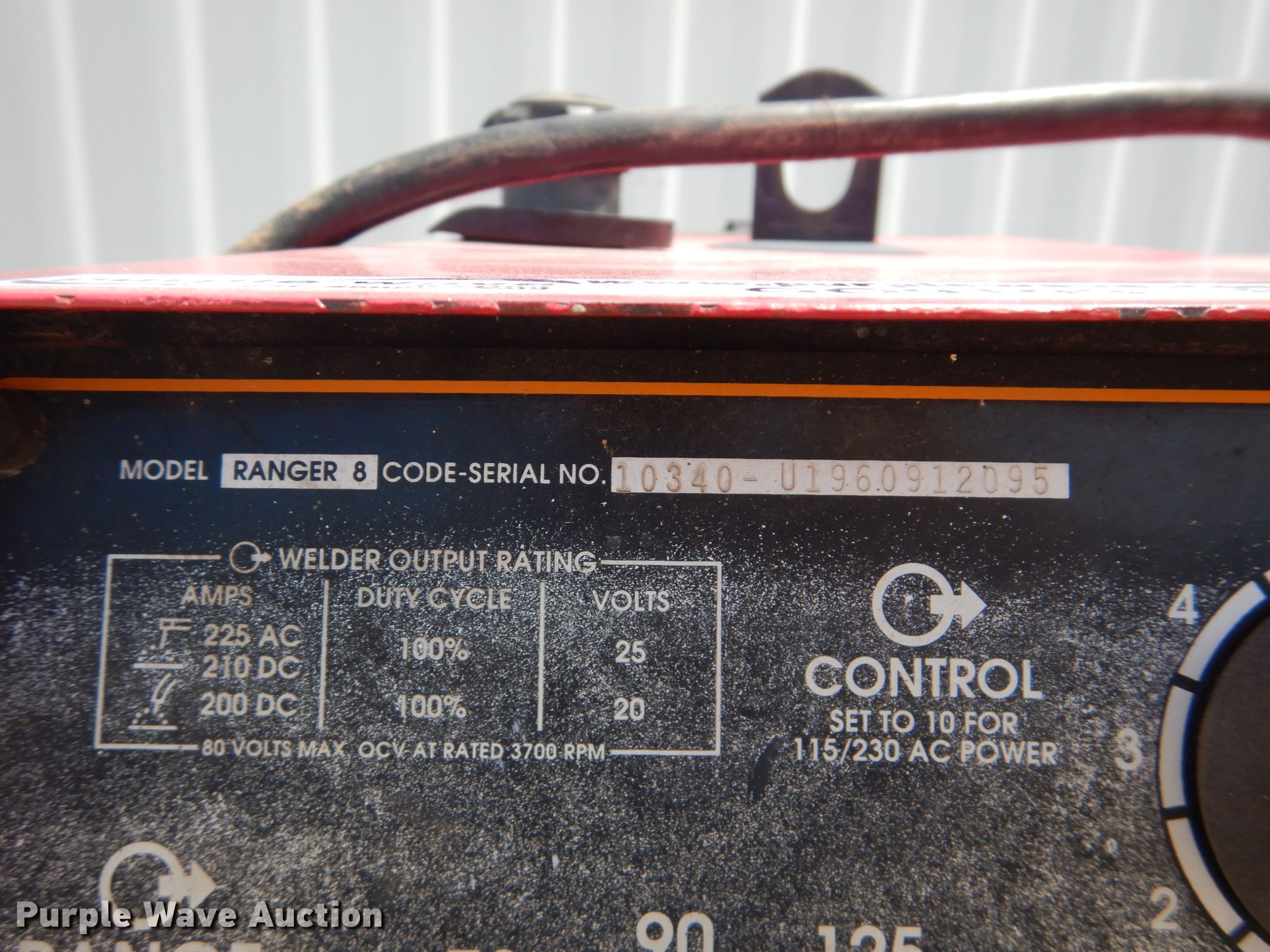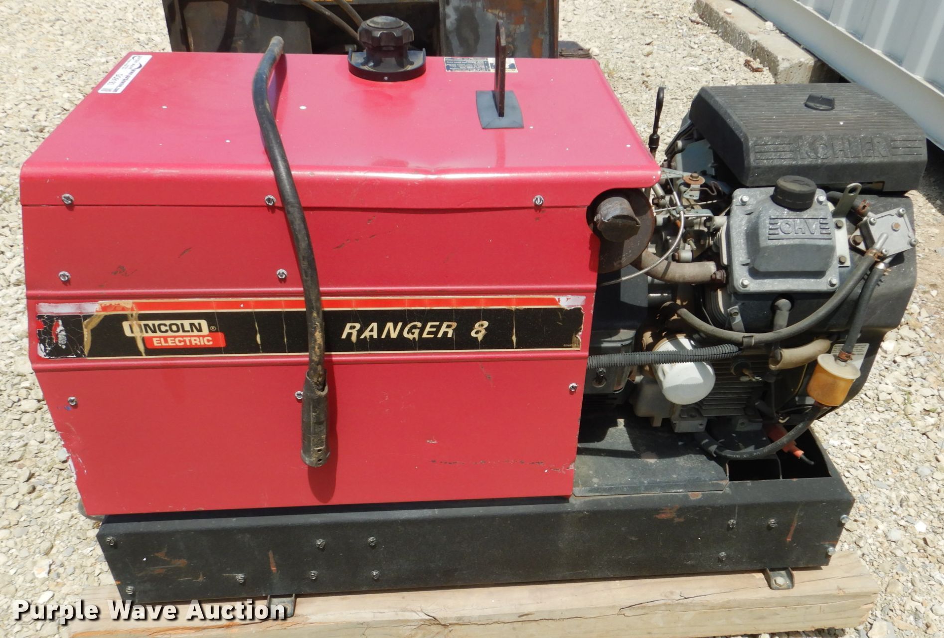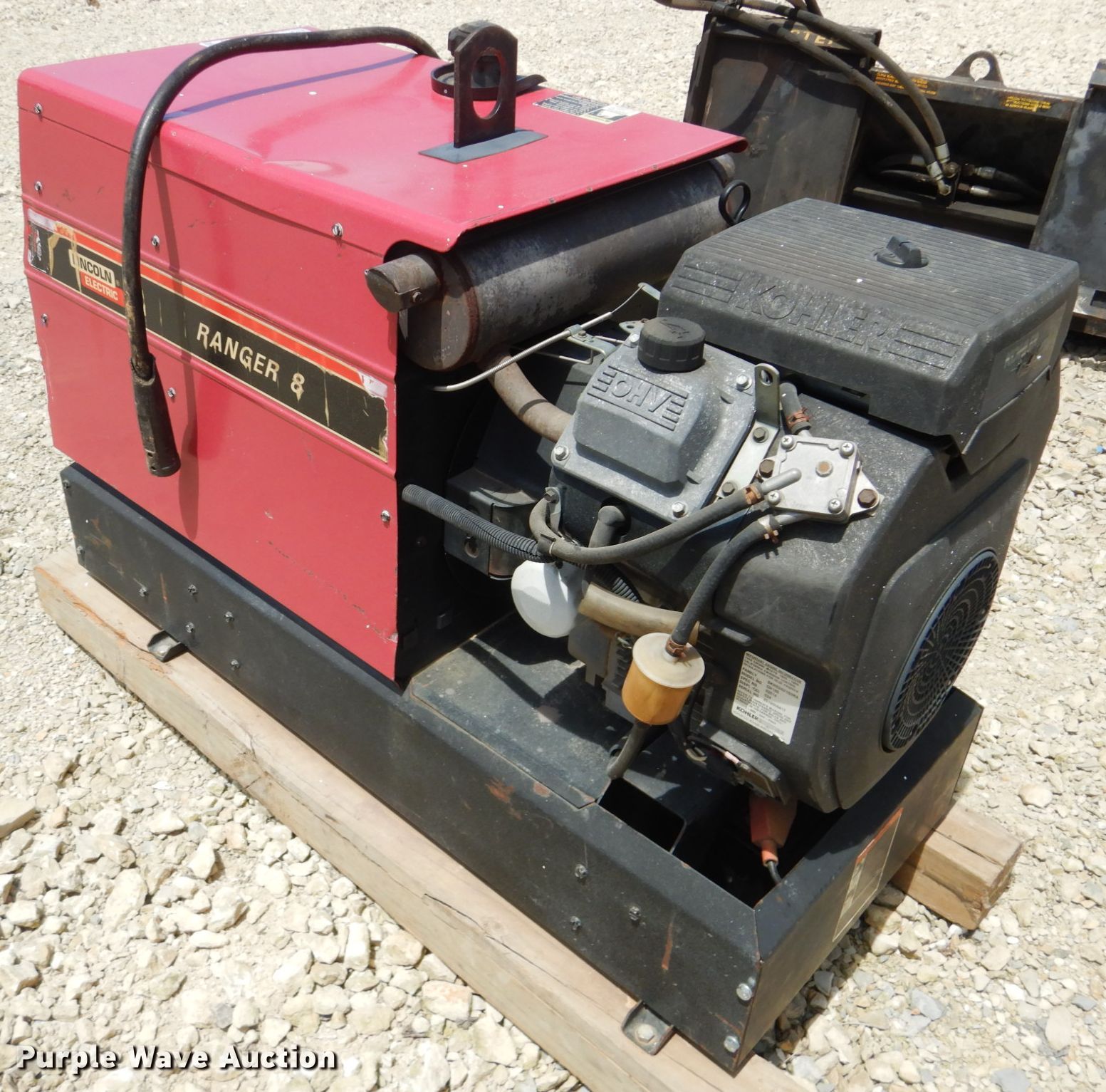 Purple Wave is selling a used Welder (Manual) in Kansas. This item is a Lincoln Ranger 8 arc welder with the following: 565 hours on meter, Kohler gas engine, 18 HP, 225 amp AC, 210 amp DC, (2) 115V outlets, 230V outlet, No welding leads, Serial 10340-U1960912095