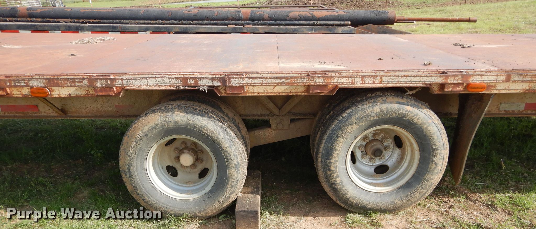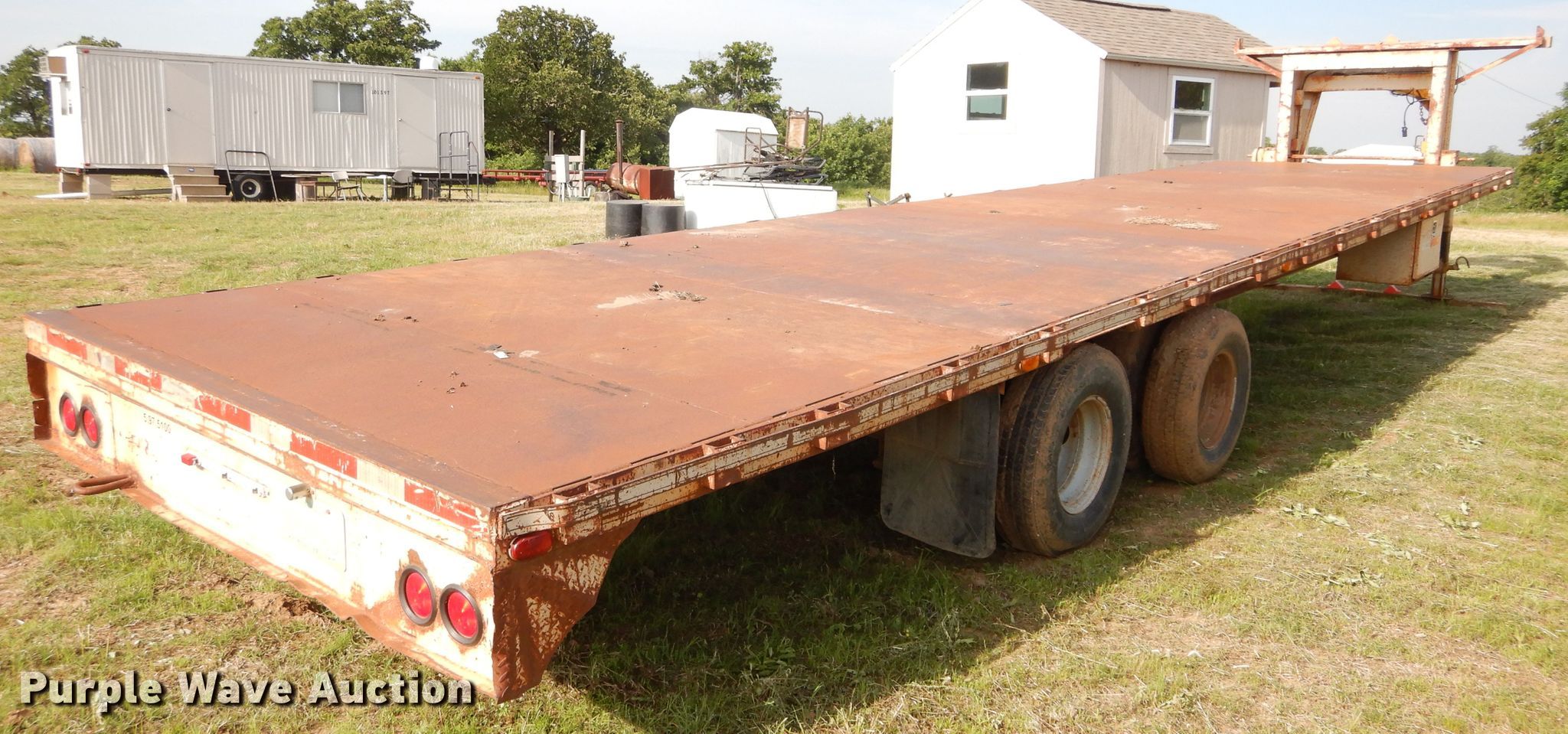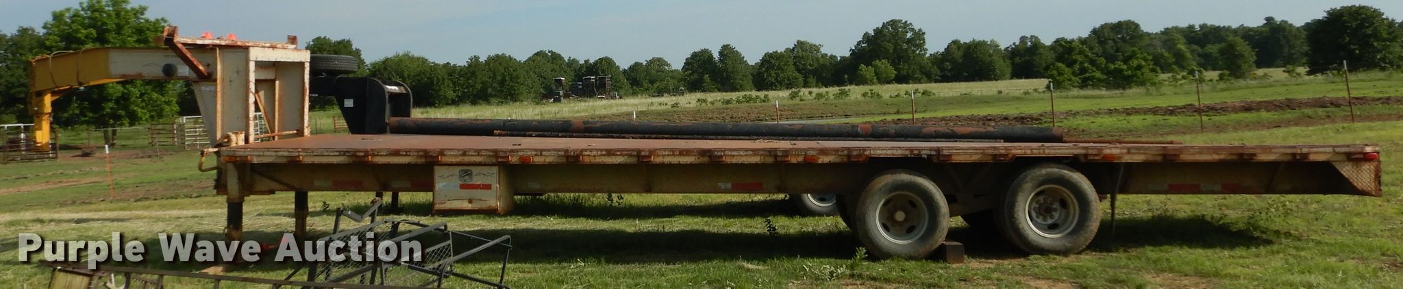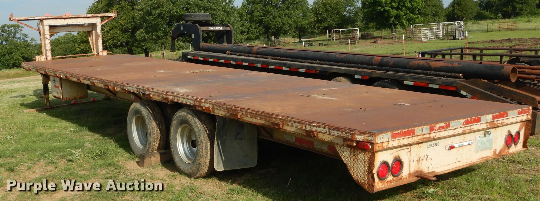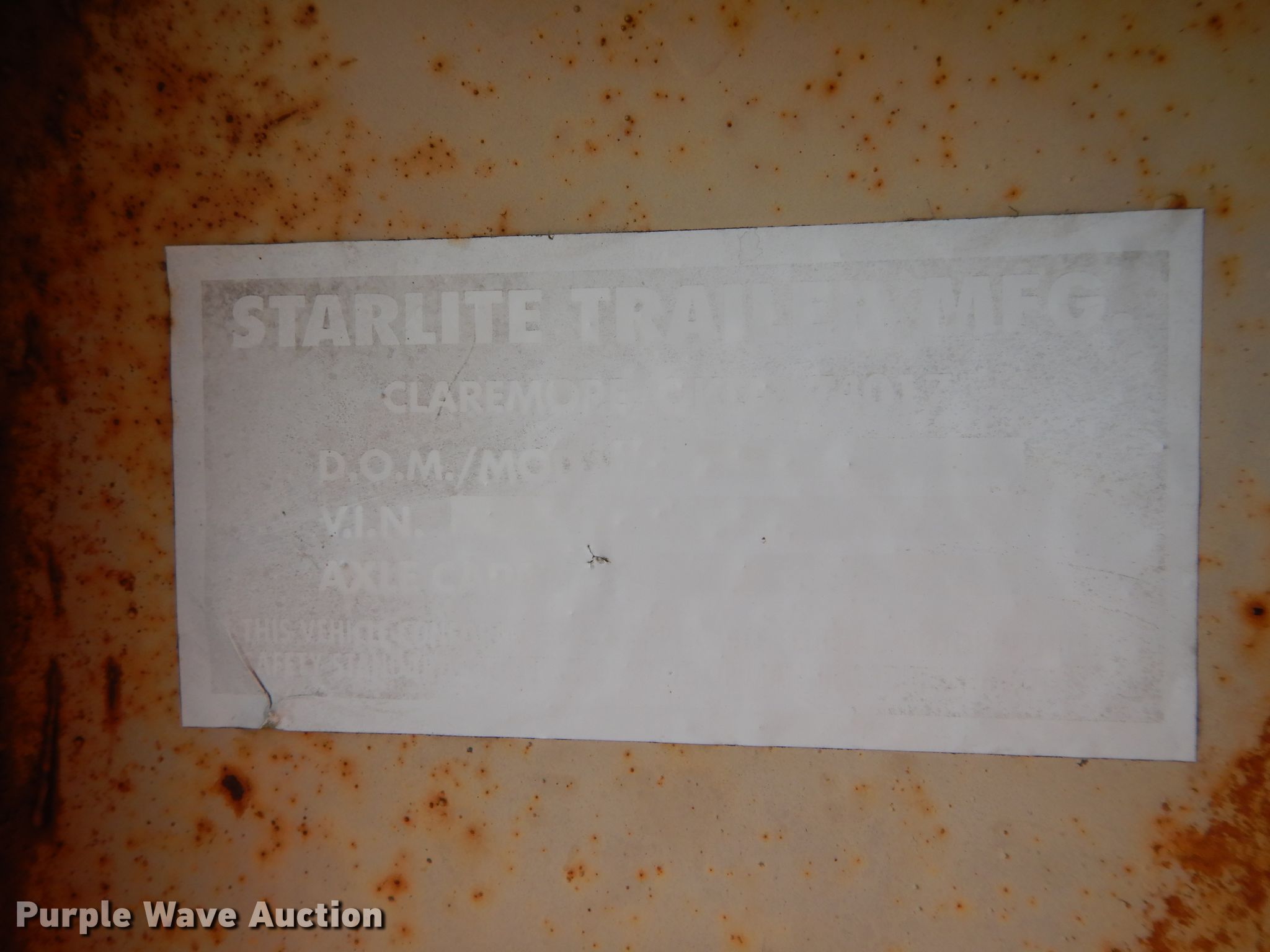 Purple Wave is selling a used Equip. Trailer in Oklahoma. This item is a Starlight equipment trailer with the following: 40'L x 96"W overall, 32'L x 8'W deck, Steel deck, Dual leg landing gear, Spring suspension, Electric brakes, Tandem axle, 235/85R16 tirs, GVWR 20,000 lbs