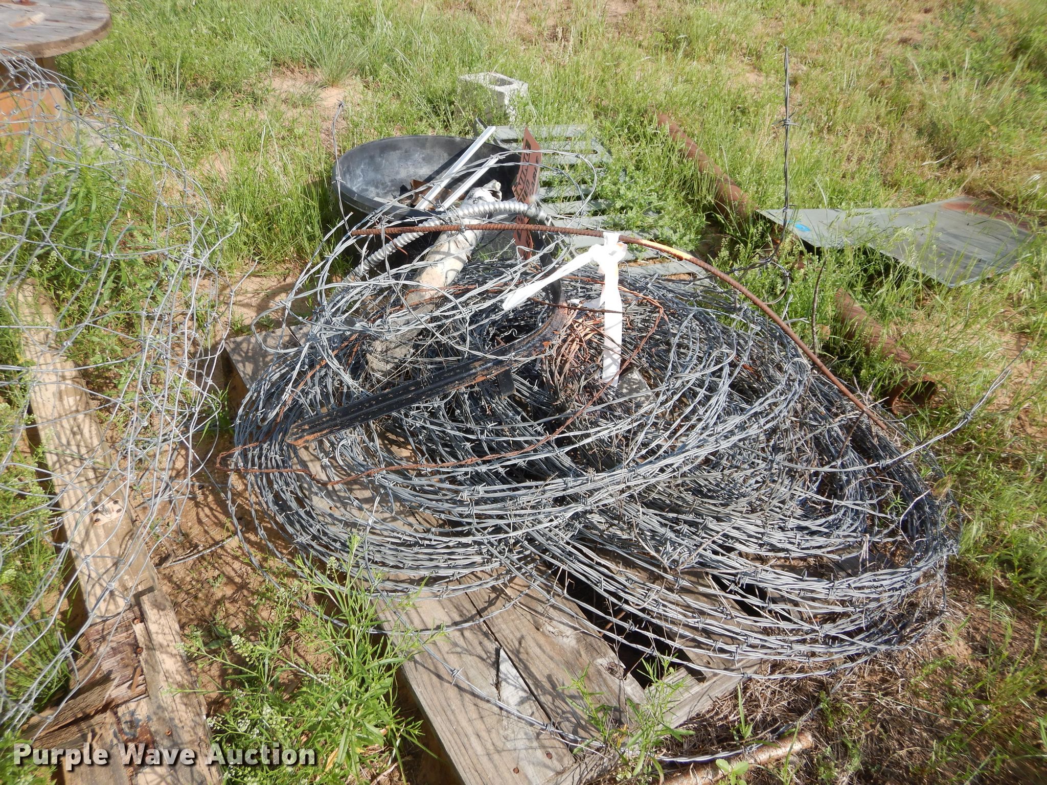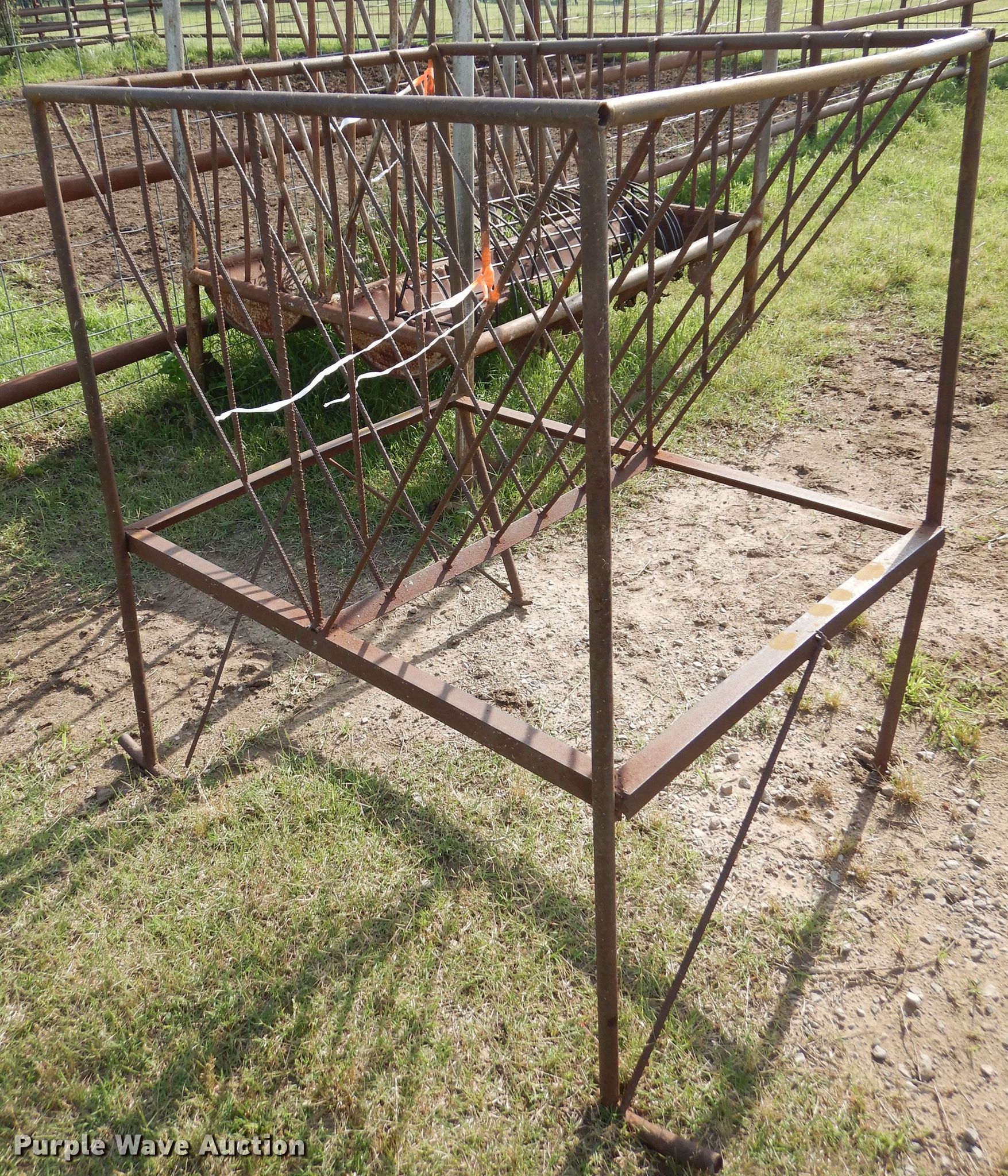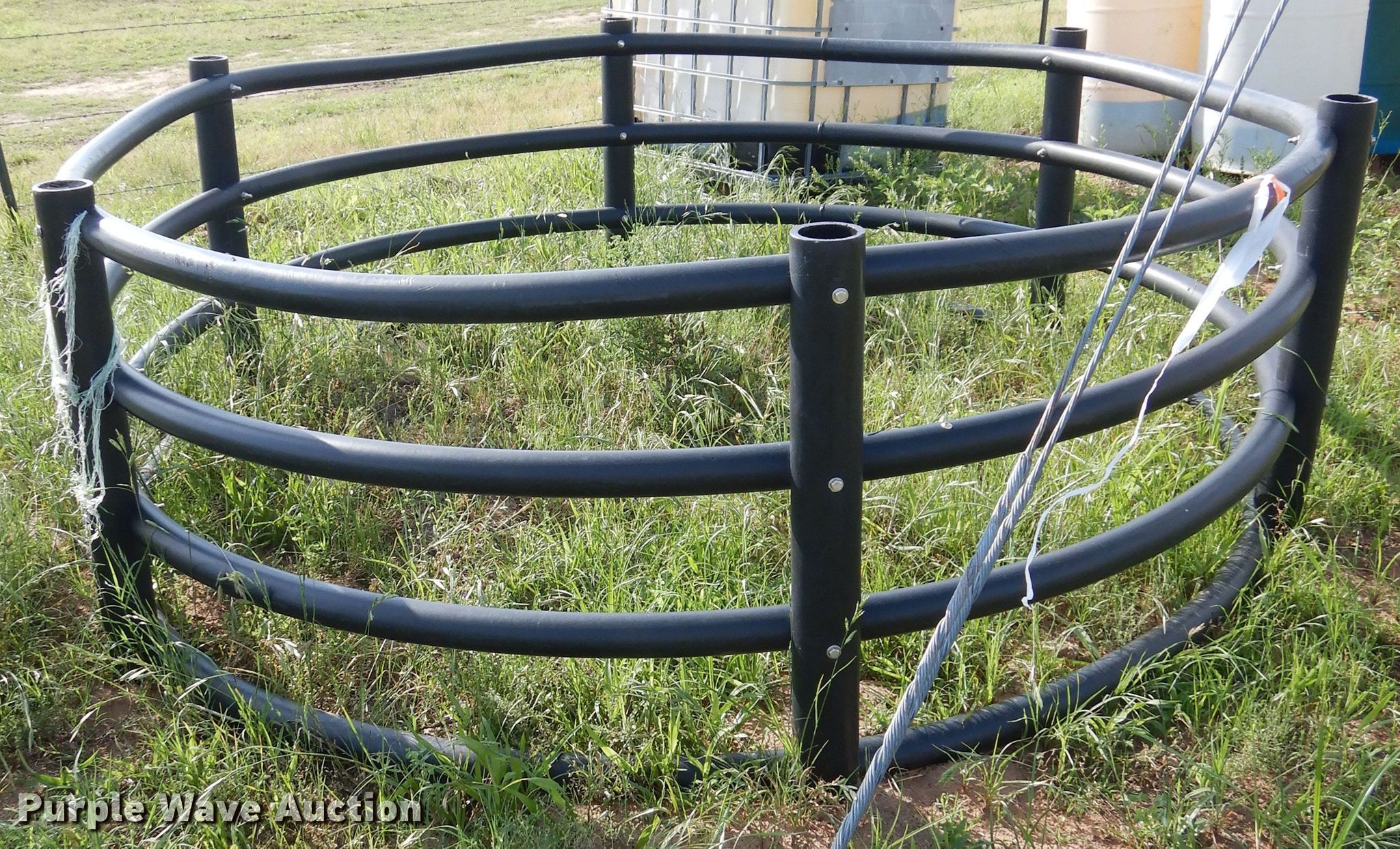 Purple Wave is selling a used Livestock Equip. in Oklahoma. This item is a Livestock feeders with the following: Trough feeders, Hay bale rings, Rolls of barbed wire
