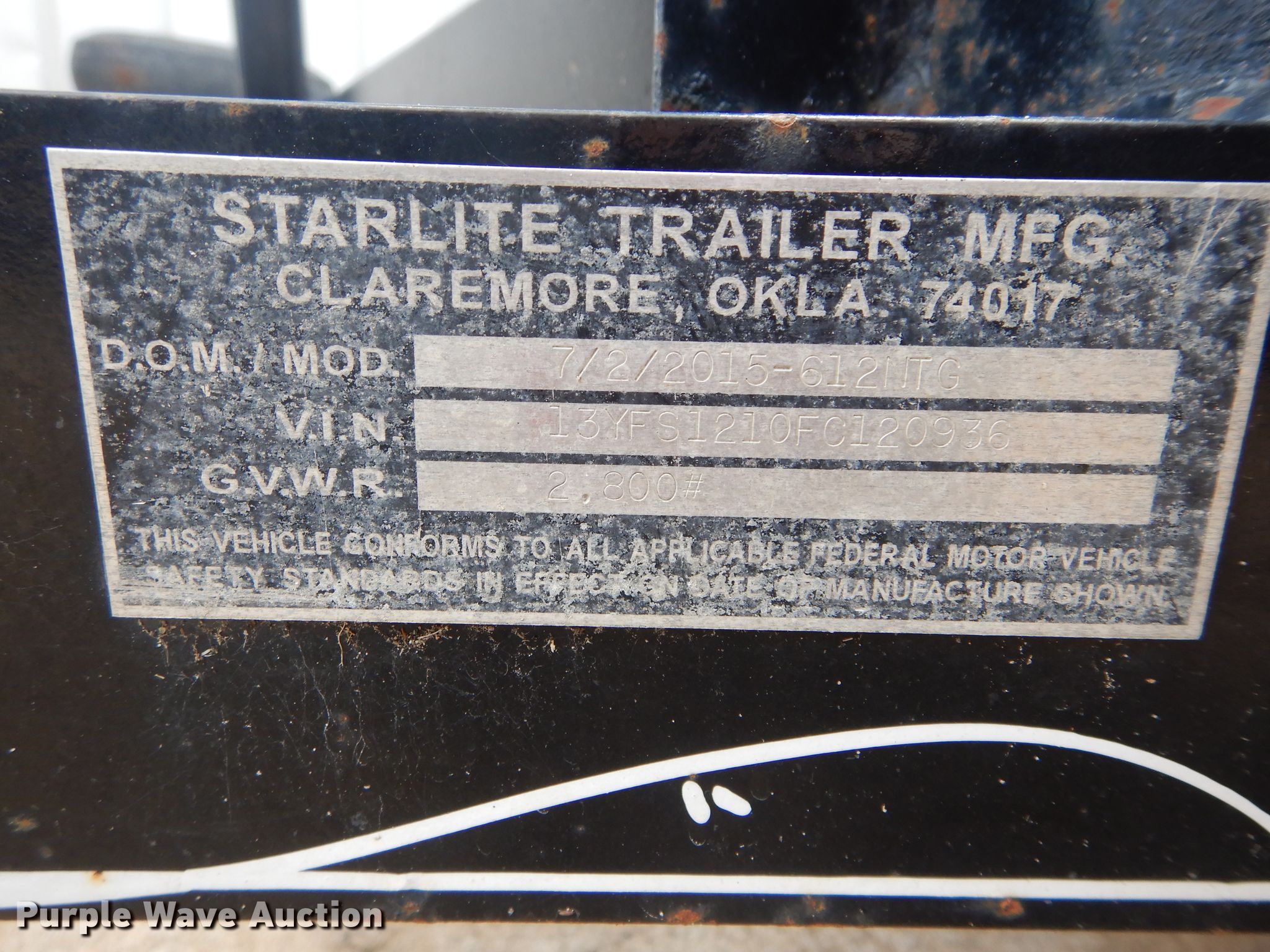 Purple Wave is selling a used Car or Utility Trailer in Oklahoma. This item is a 2015 Starlight utility trailer with the following: 16'L x 8'W overall, 12'L x 76"W deck, Spring suspension, 205/75D15 tires, GVWR 2,800 lbs