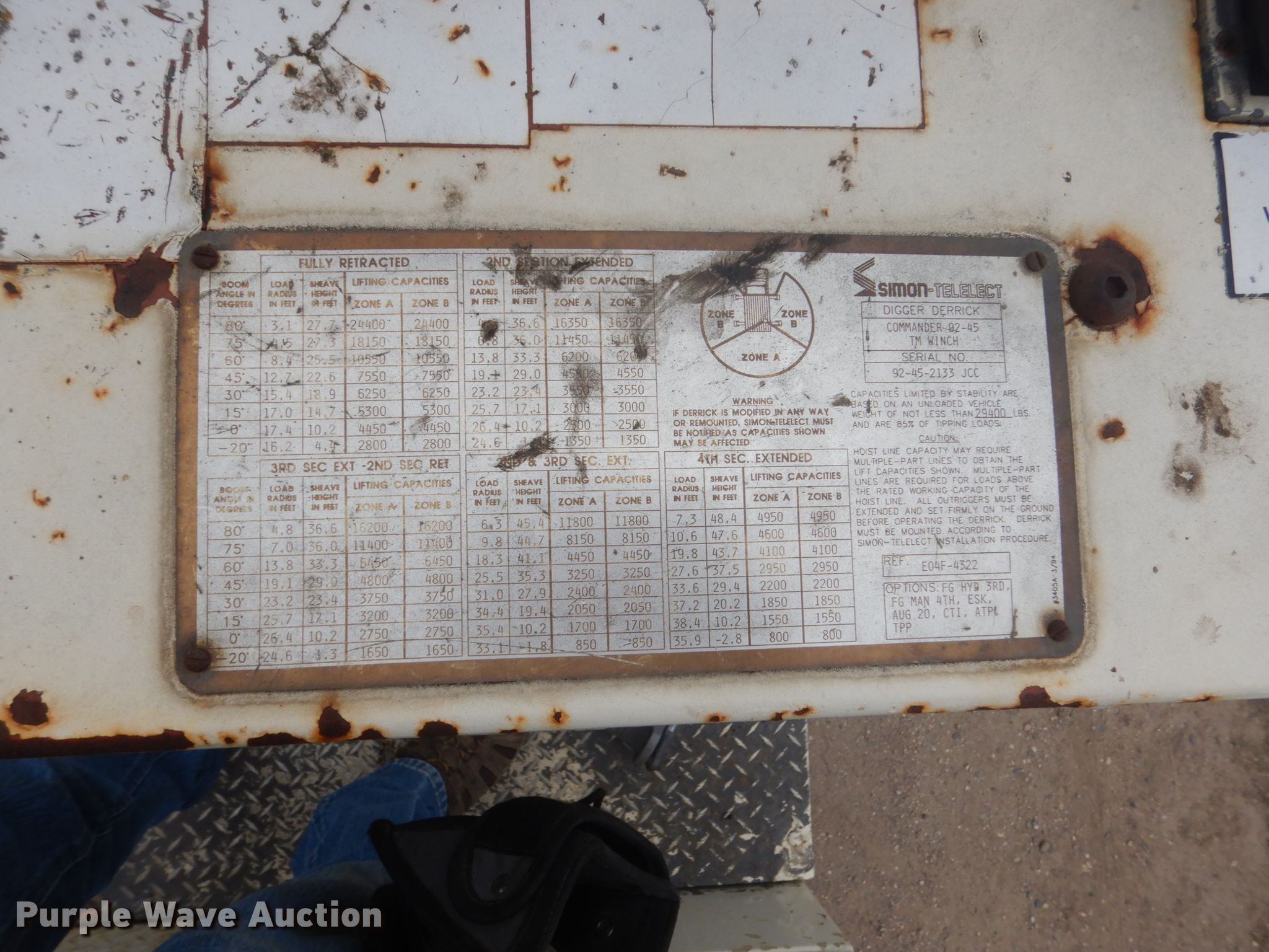 1996 Freightliner FL80 digger derrick truck. 12,738 miles on odometer, Engine hours: 9,102. Engine Cummins , Displacement: 8.3L, Cylinders: 6, Fuel type: Diesel. Transmission Automatic. Chassis Axles: Tandem, Suspension: Spring, Brakes: Air, PTO, GVWR: 54,000 lbs. Interior Heat. Operational Service bed Dueco DAL-138T, 14' 5", Boom Simon_Telelect Commander 92-45, Serial: 92-45-2133-JCC, Maximum lift capacity: 24,400 lbs, Maximum lift height: 48', Boom type: Telescopic, Boom controls, Material handler, Pole guide. Tires Size: 11R22.5. Notes No cable on boom winch. Minnesota title. Seller is a Minnesota licensed motor vehicle dealer. The buyer may be required to pay sales tax and/or registration fees to the dealer prior to taking possession. Title will be assigned and distributed by the dealer. Please contact the seller for distribution questions. 1FVXJLBB2TL829106. Hutchinson, MN 55350