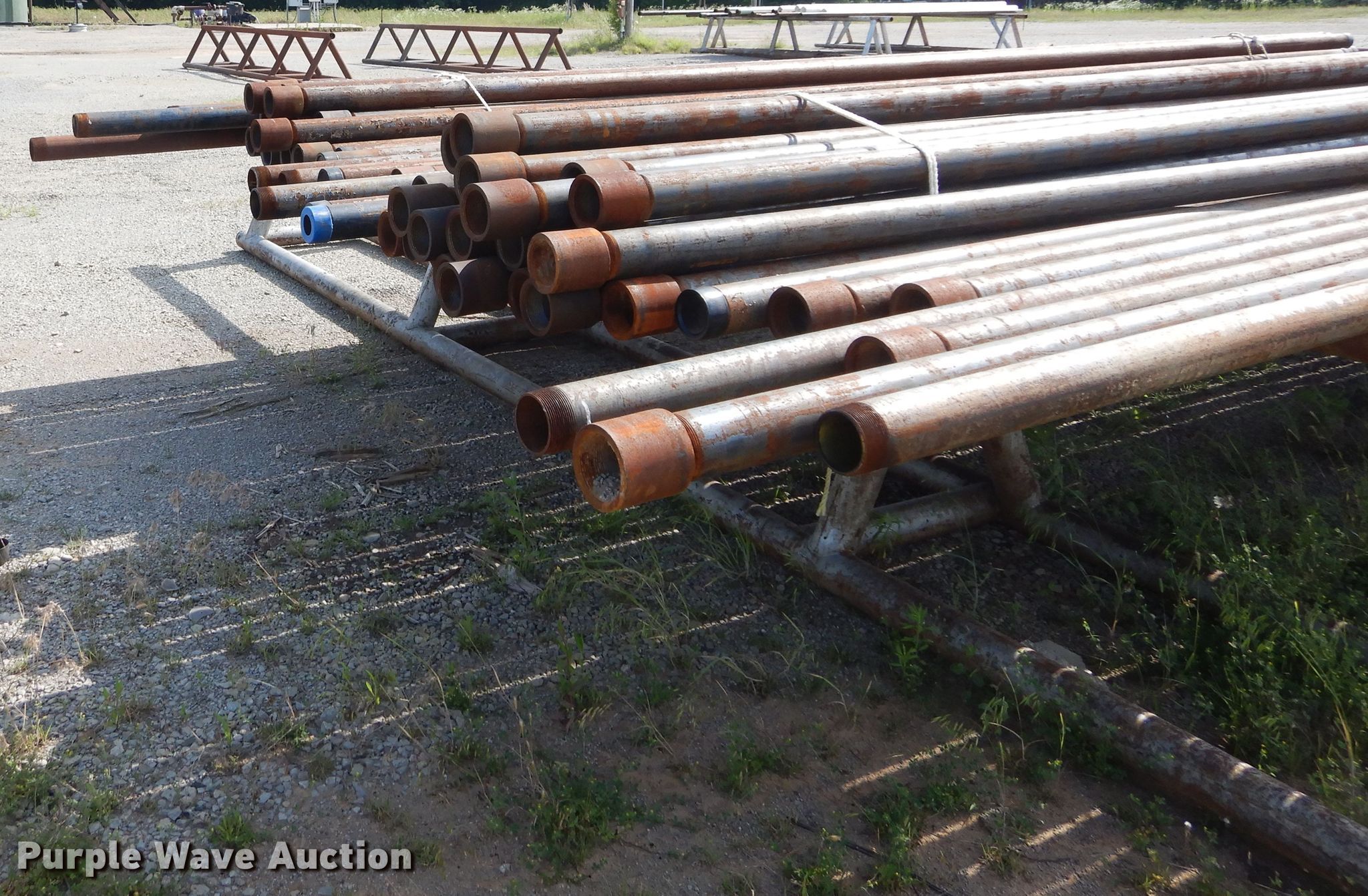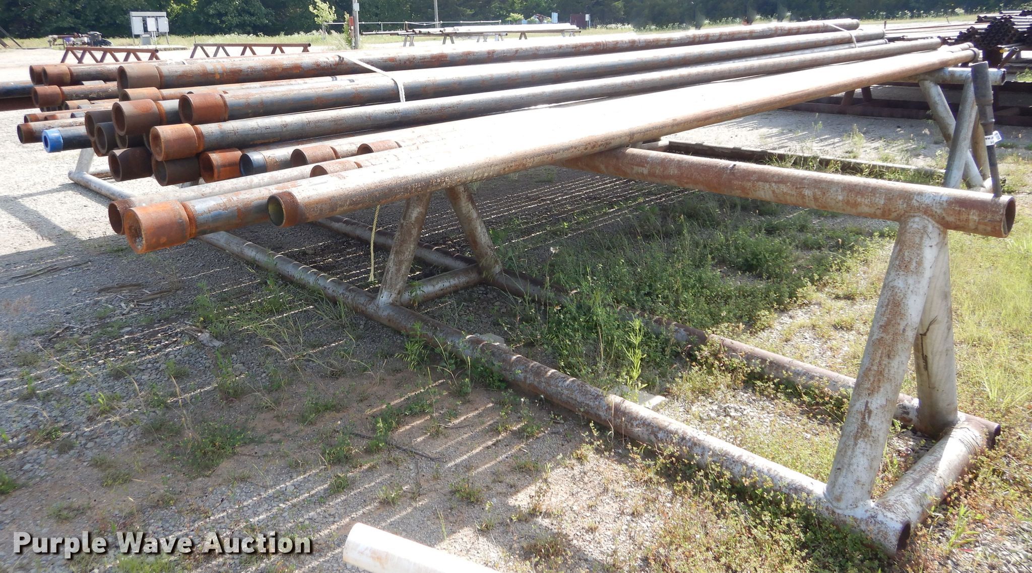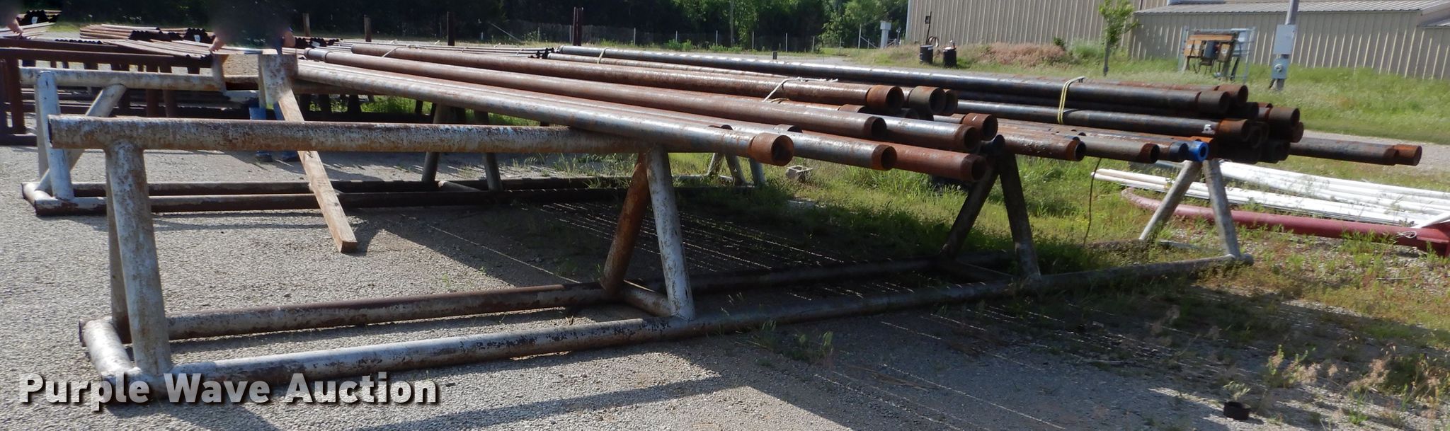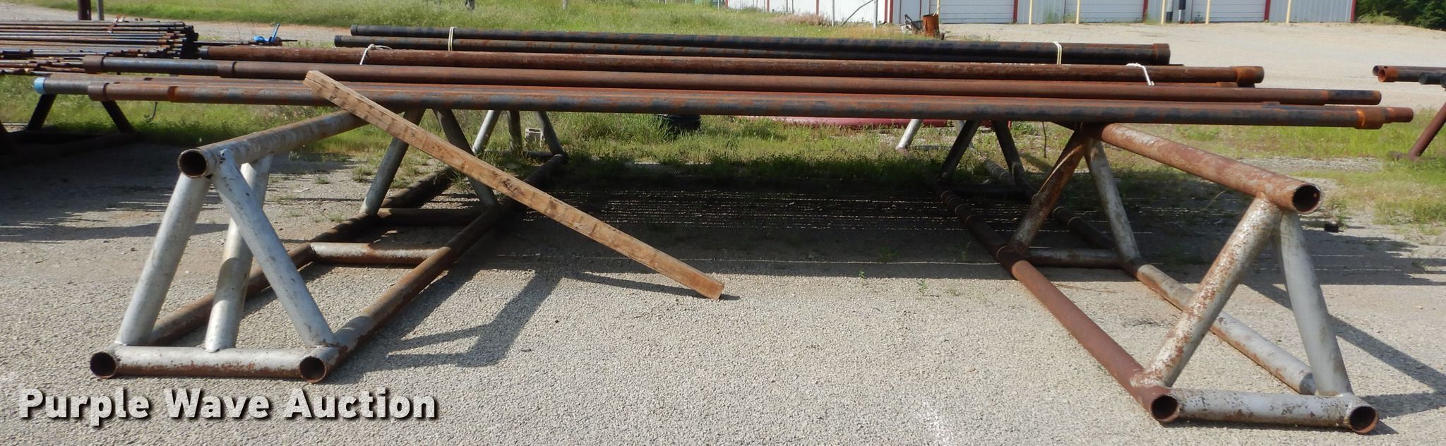 Purple Wave is selling a used Pipe in Oklahoma. This item is a Approximately 70 pipes with the following: 21'L x 3" diameter, Schedule 80, Threaded and collared, Approximately 23'L x 37"H pipe rack