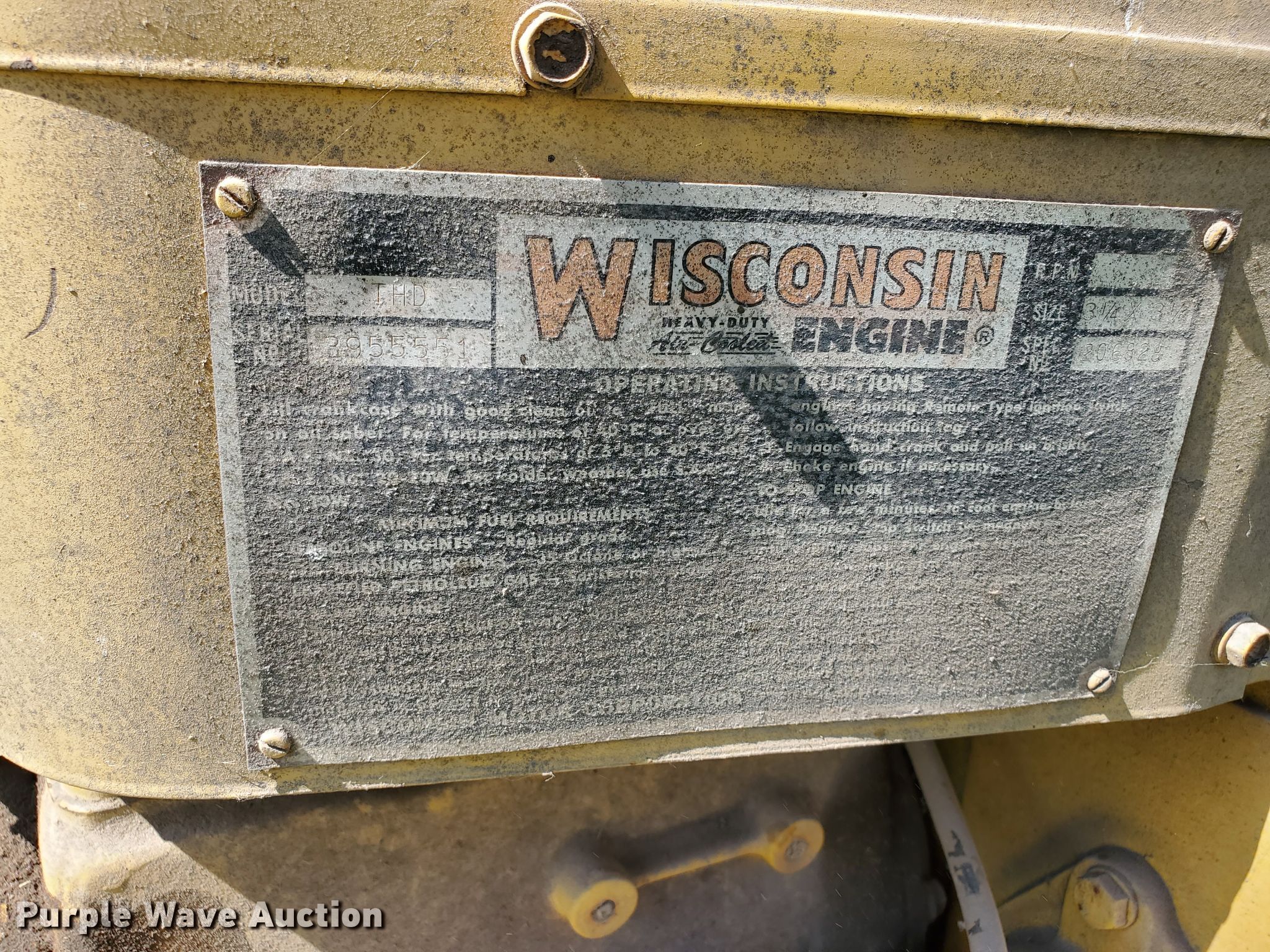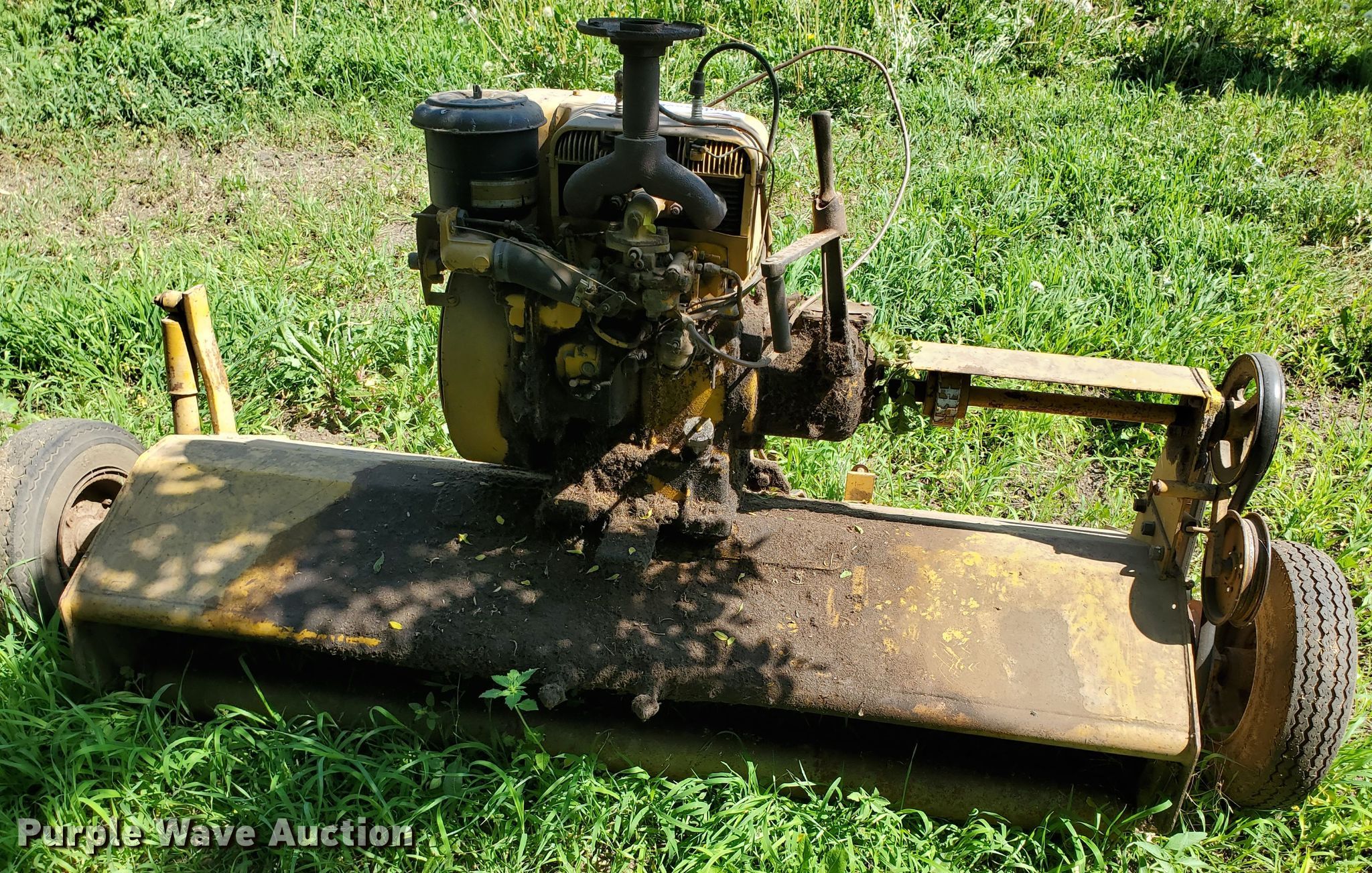 Mott flail mower. 5'W, Wisconsin two cylinder gas engine, 1 7/8" ball hitch, 4.80-8 tires, No fuel tank, Unknown operating condition. K & T Services Inc. Claflin, KS 67525
