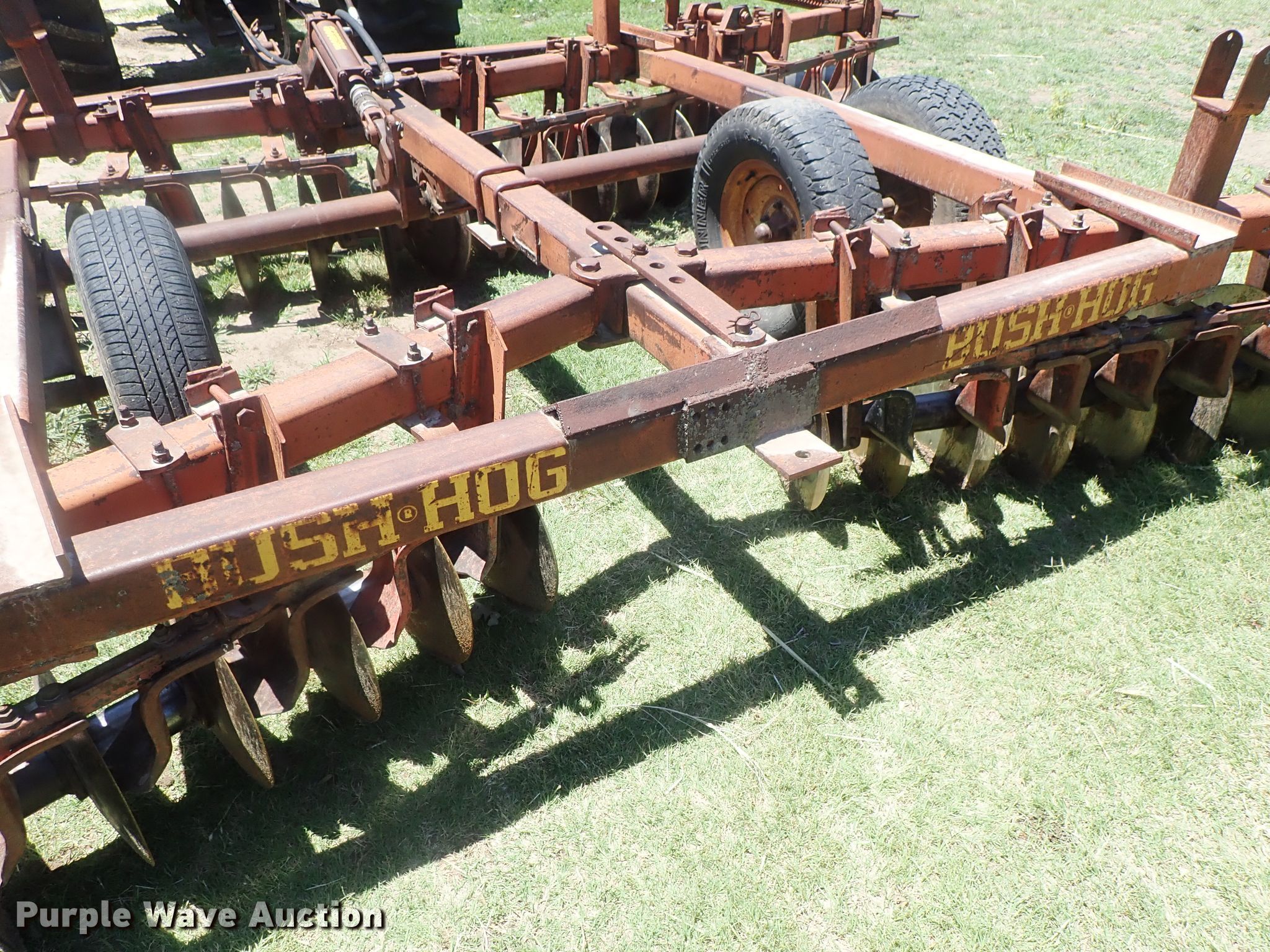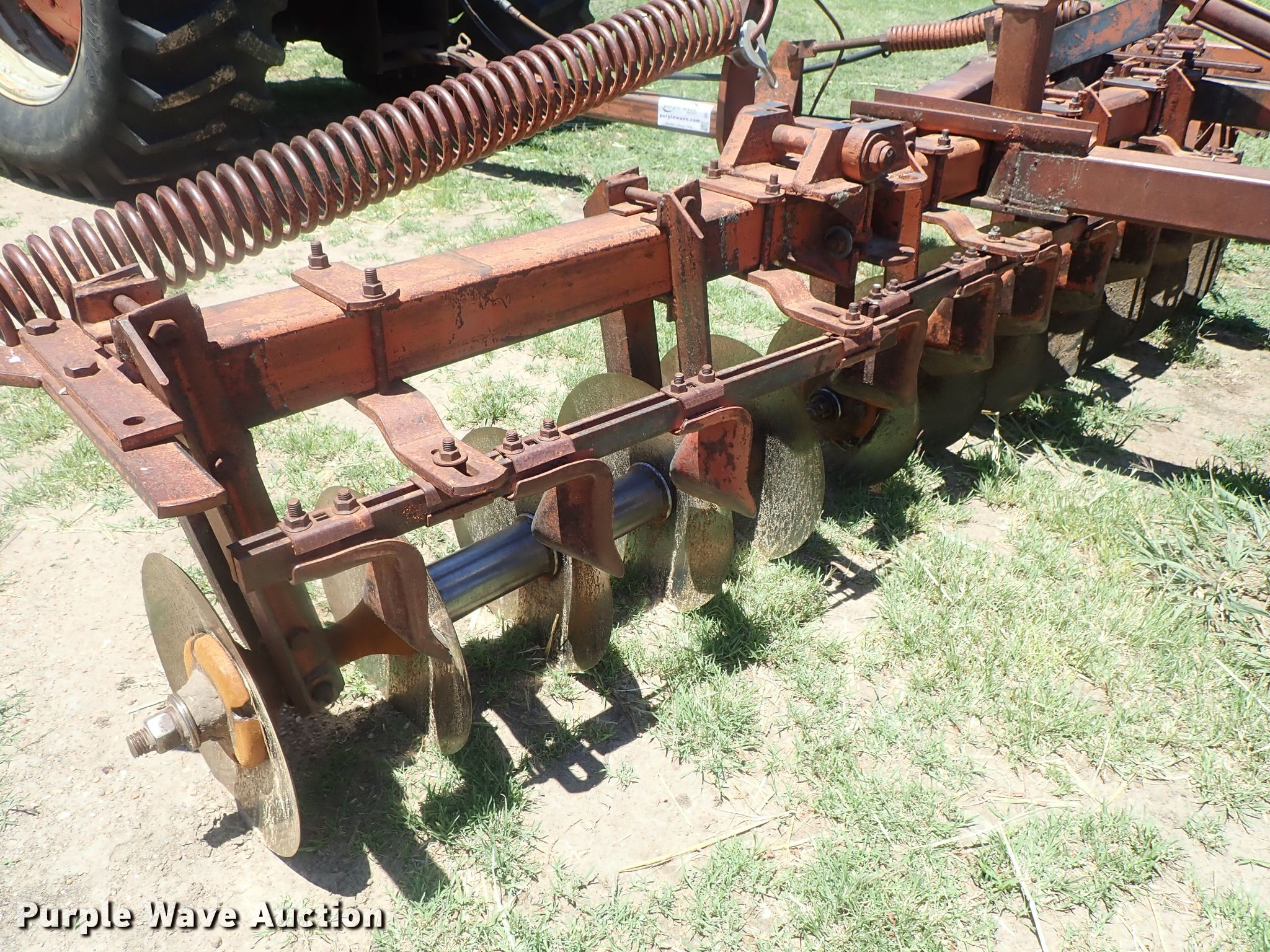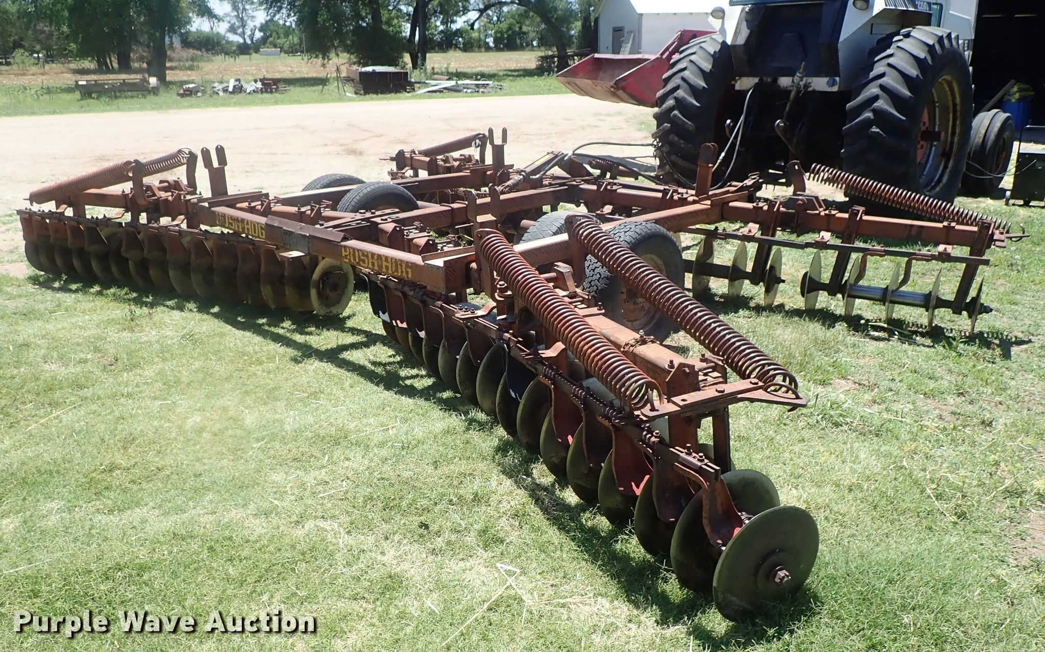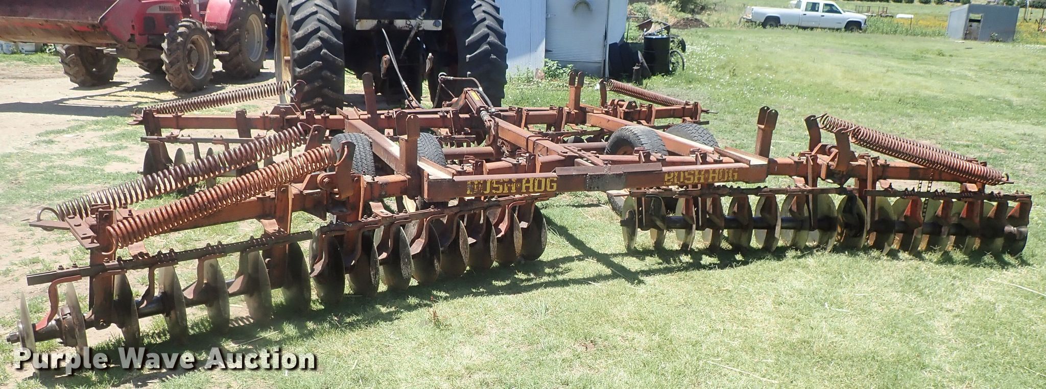 Purple Wave is selling a used Disk in Kansas. This item is a Bush Hog disk with the following: 17'W, 16" diameter disk blades, Disk scrapers, Hydraulic lift, 235/75R15 tires