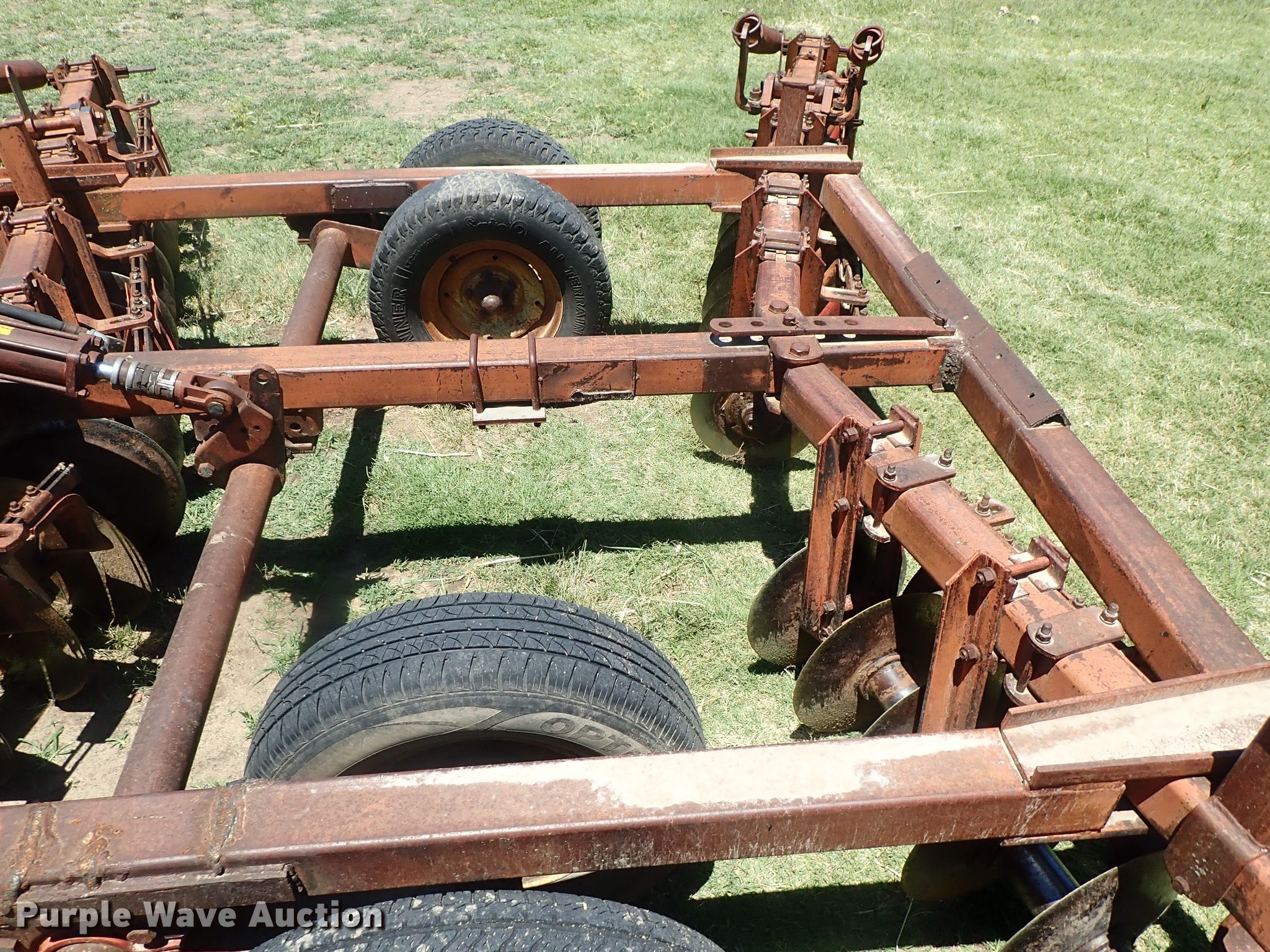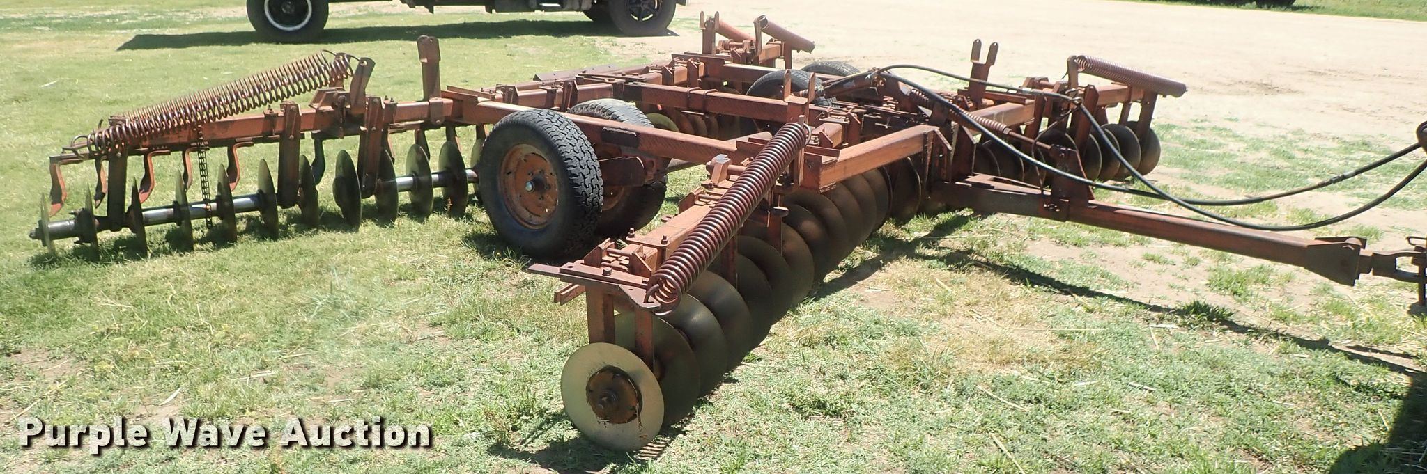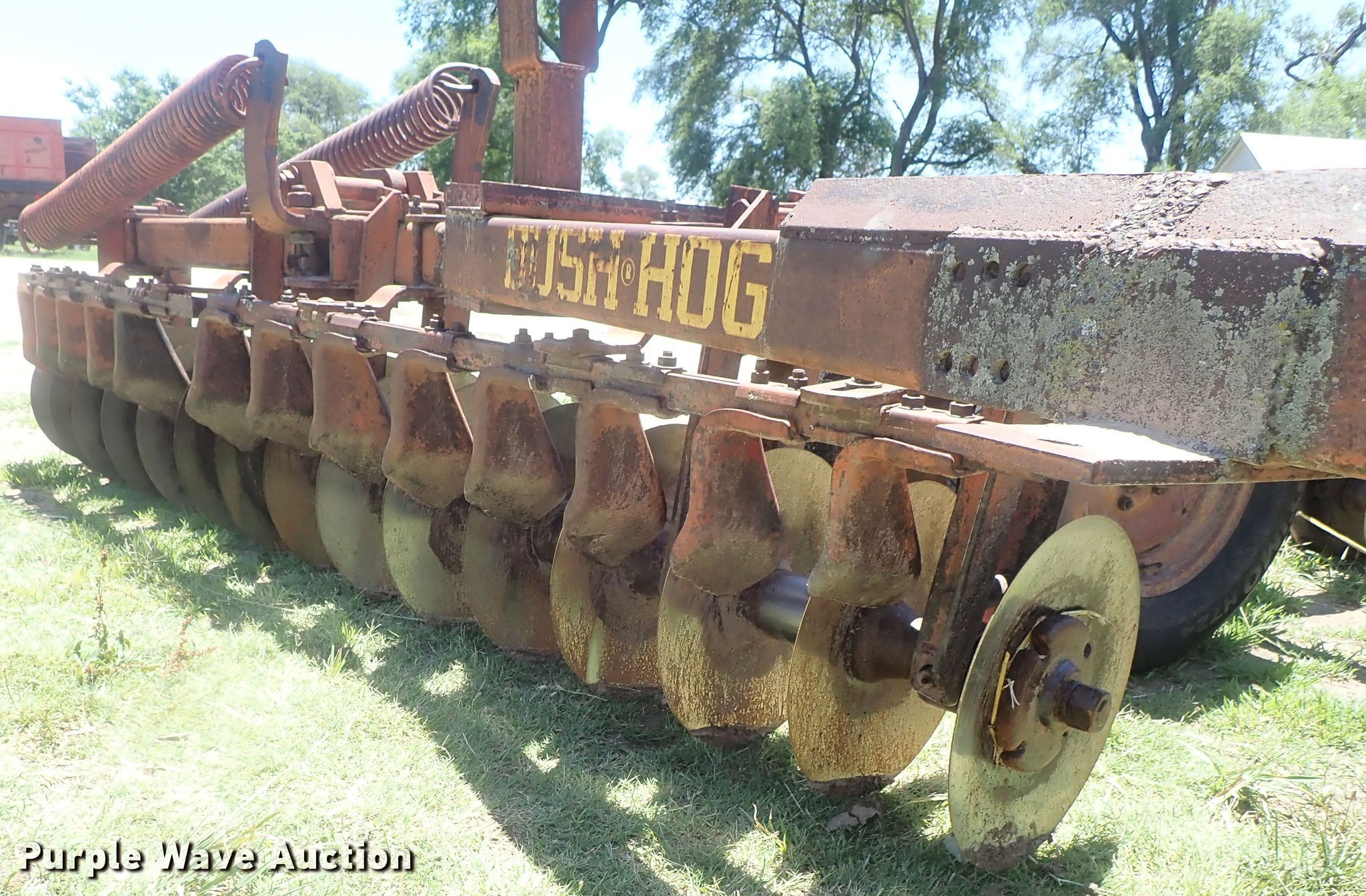 Purple Wave is selling a used Disk in Kansas. This item is a Bush Hog disk with the following: 17'W, 16" diameter disk blades, Disk scrapers, Hydraulic lift, 235/75R15 tires