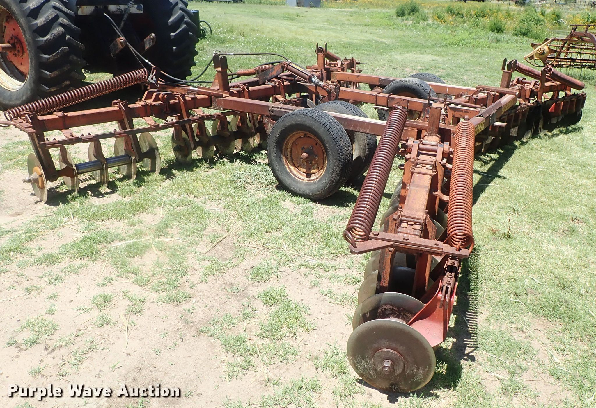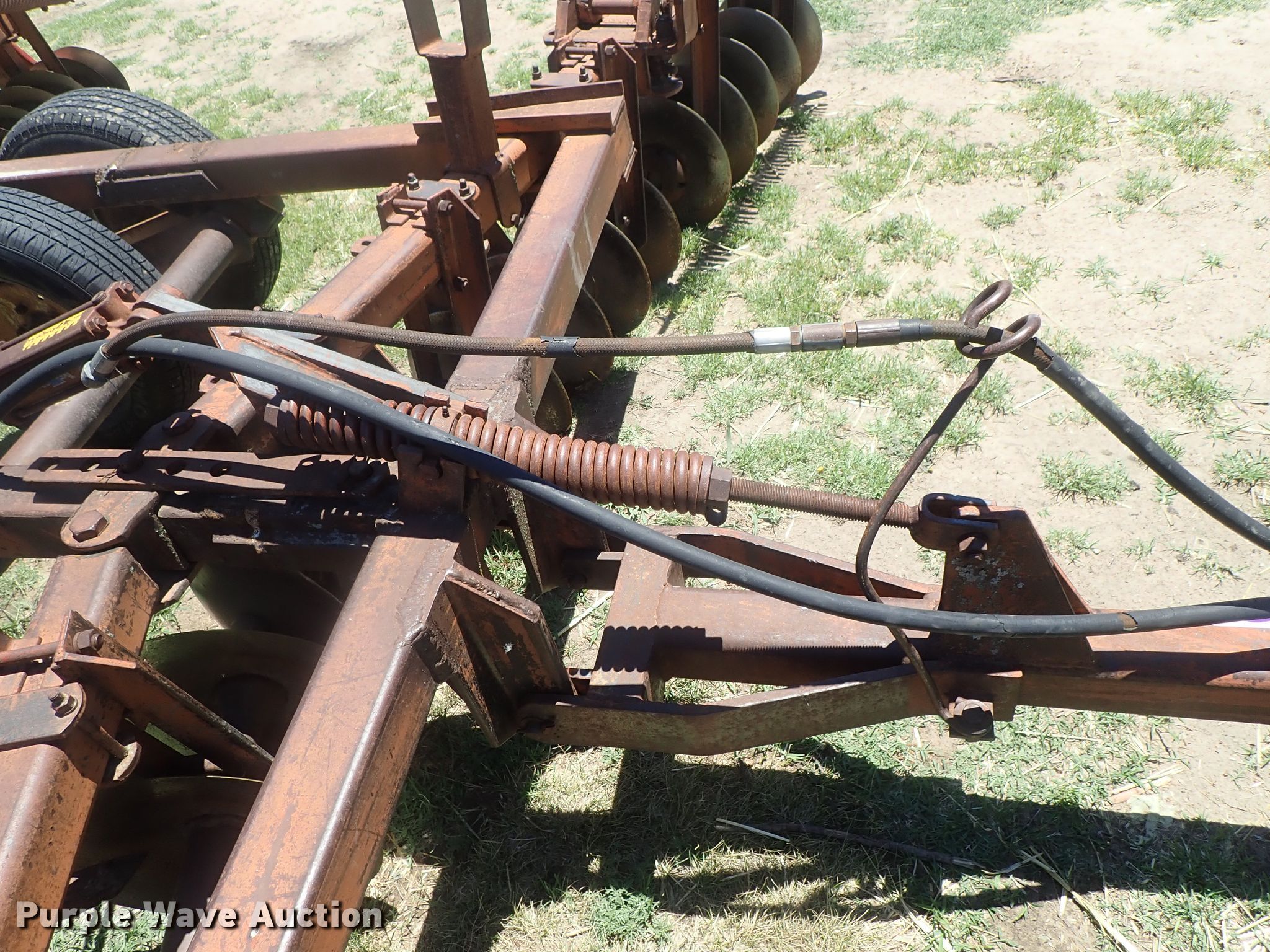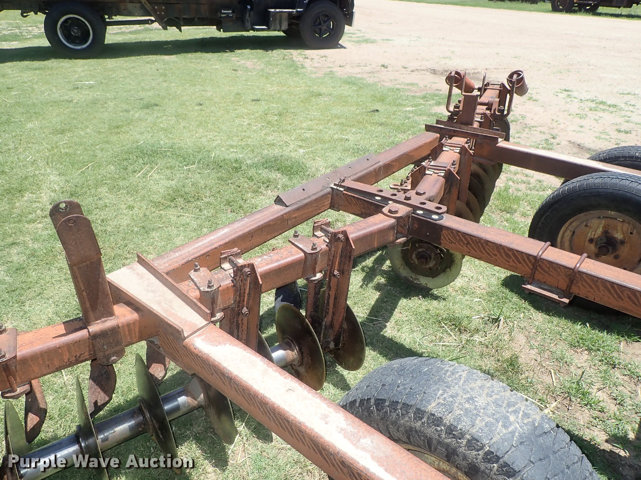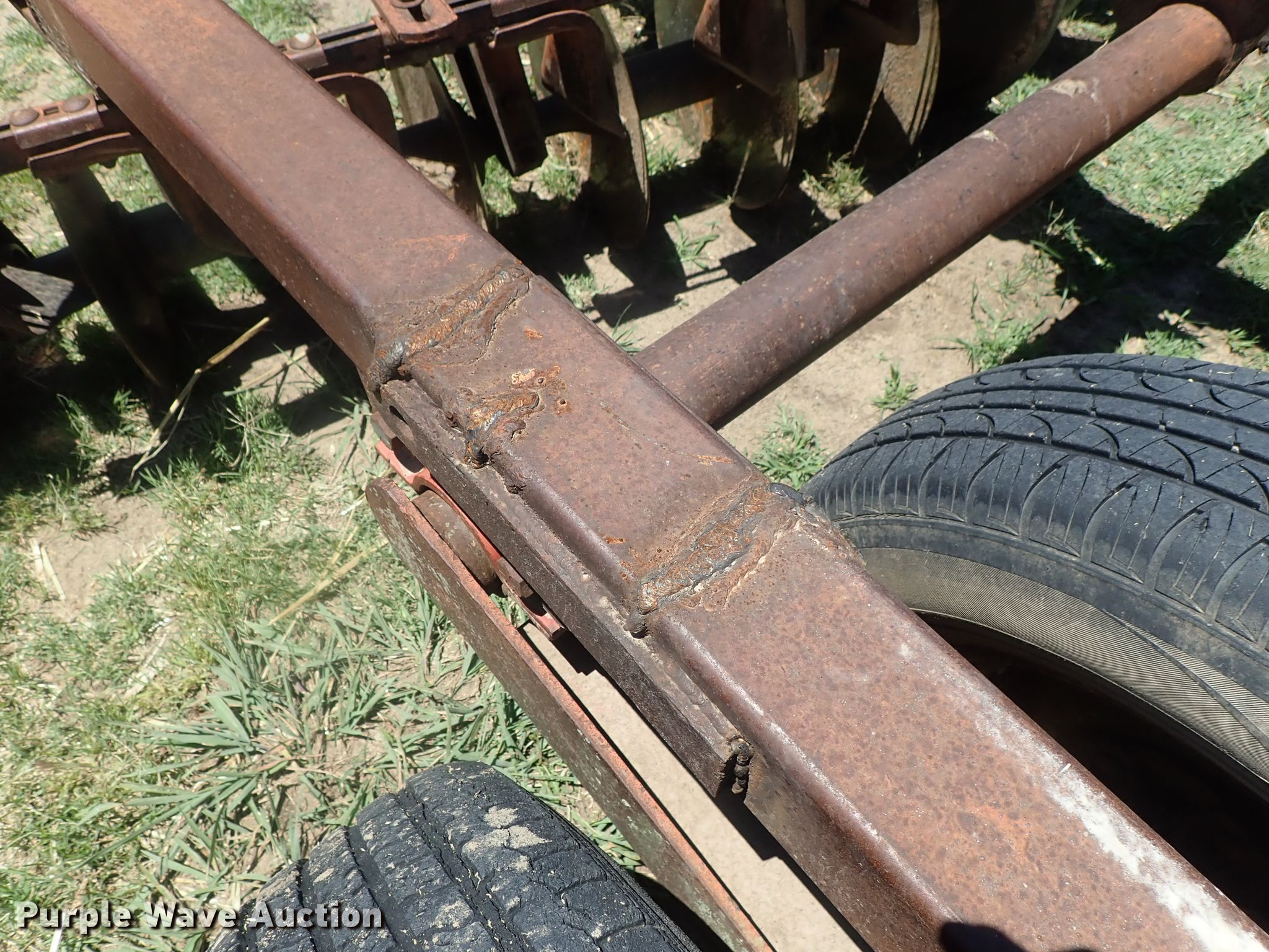Purple Wave is selling a used Disk in Kansas. This item is a Bush Hog disk with the following: 17'W, 16" diameter disk blades, Disk scrapers, Hydraulic lift, 235/75R15 tires