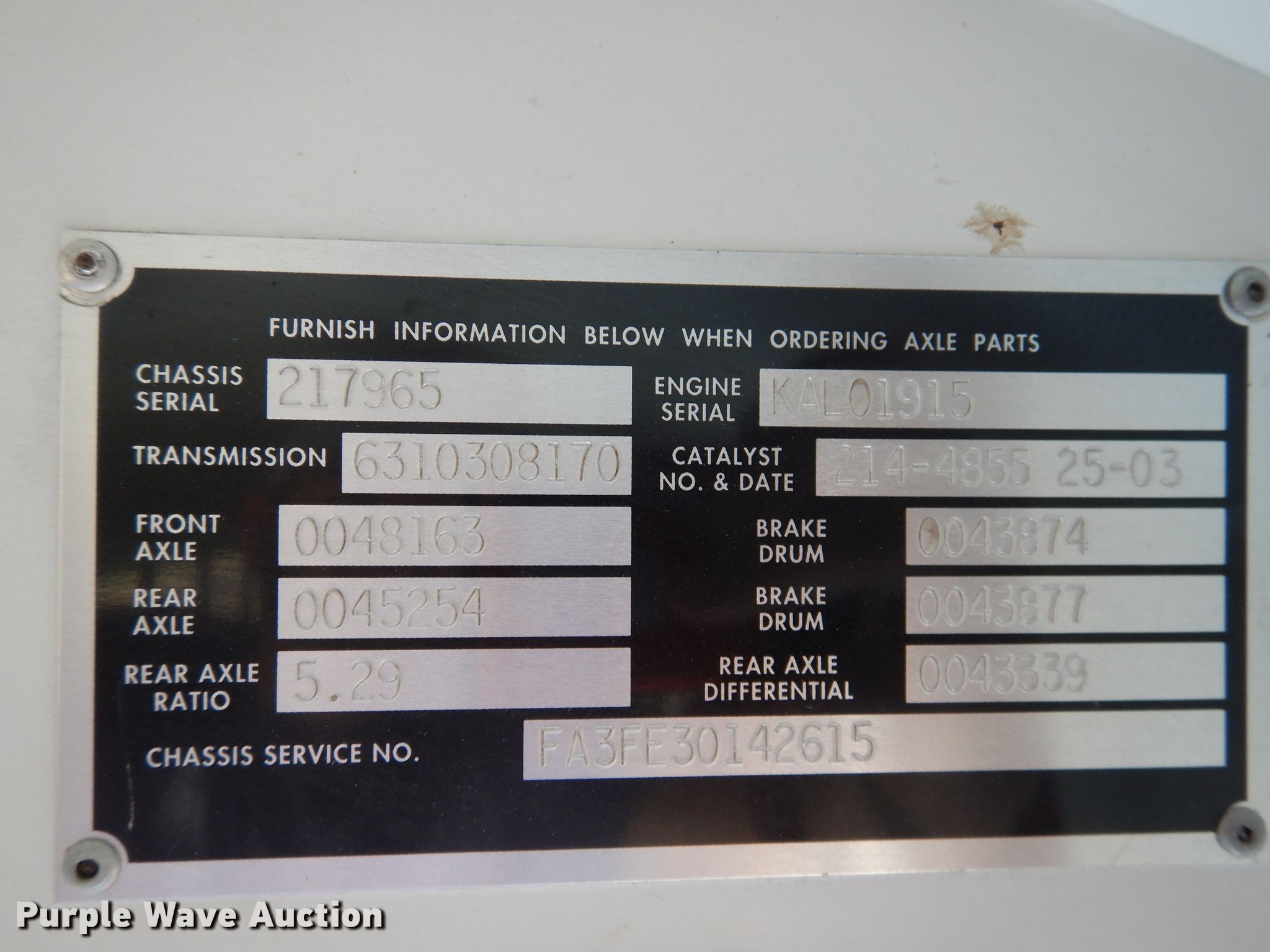 2004 Blue Bird All American FE school bus. 39,886 miles on odometer. Engine Caterpillar C7 Acert, Displacement: 7.2L, Cylinders: 6, Fuel type: Diesel. Transmission Automatic. Chassis Axles: Single, Suspension: Spring, Brakes: Air, GVWR: 30,000 lbs. Interior Heat, Passengers: 72, Seats Child safety seats: 8, Adult seats: 46. Tires Size: 11R22.5. Notes Odometer replaced at 180,000 miles. Kansas title. Title distribution may be delayed up to 14 days from verification of funds. 1BABKCKA84F217965. USD 457. 4665 E Highway 50. Garden City, KS 67846