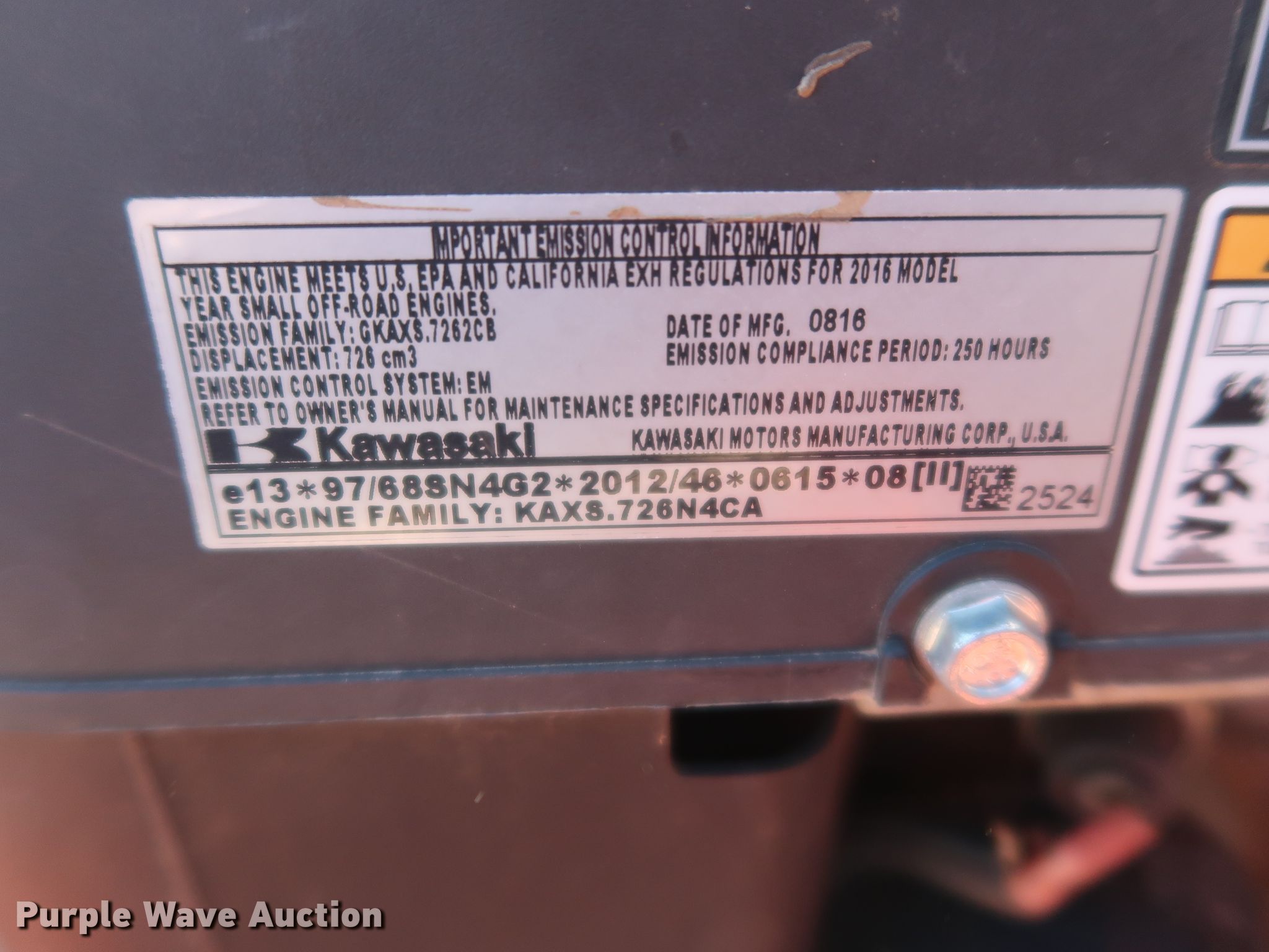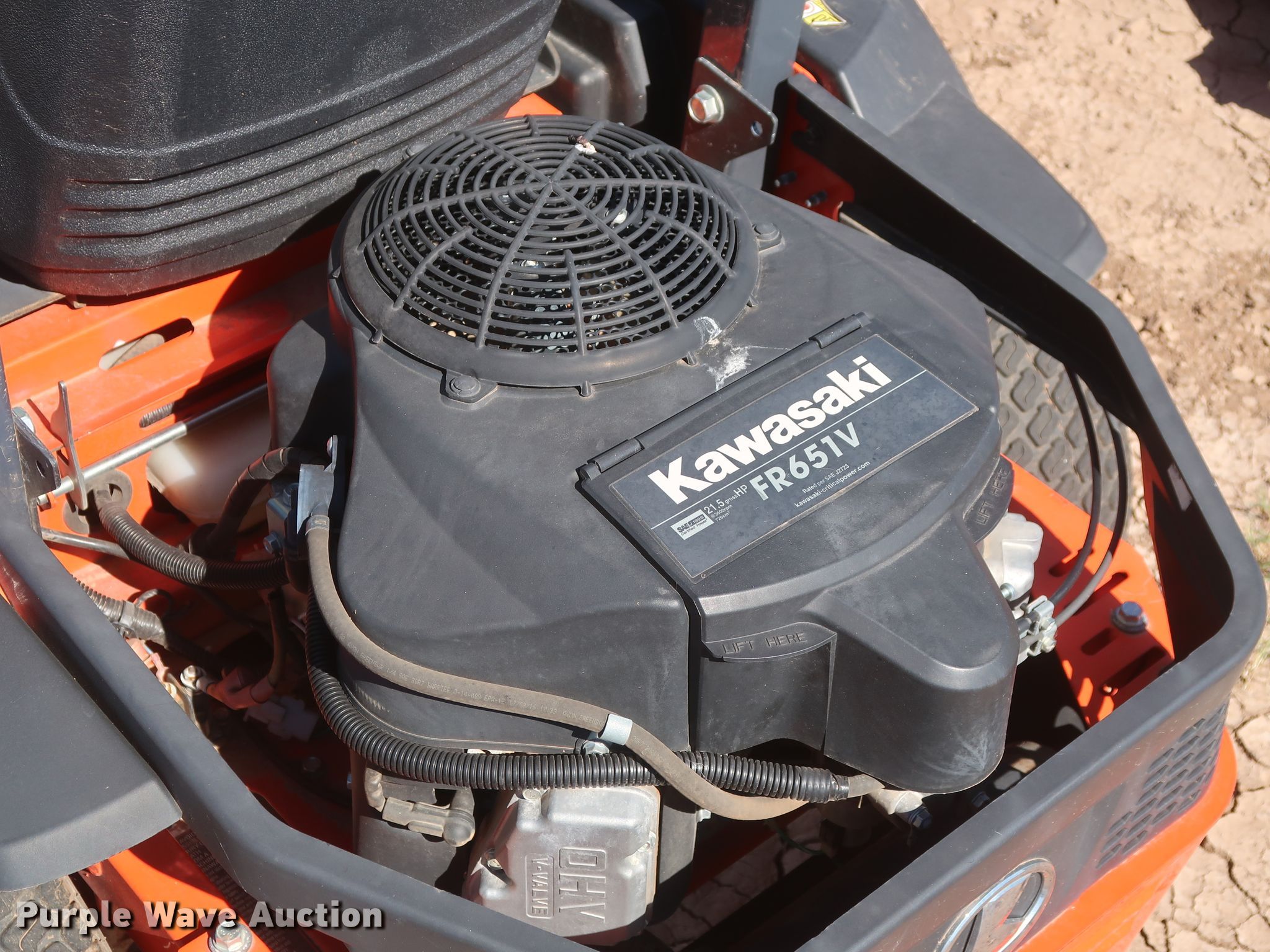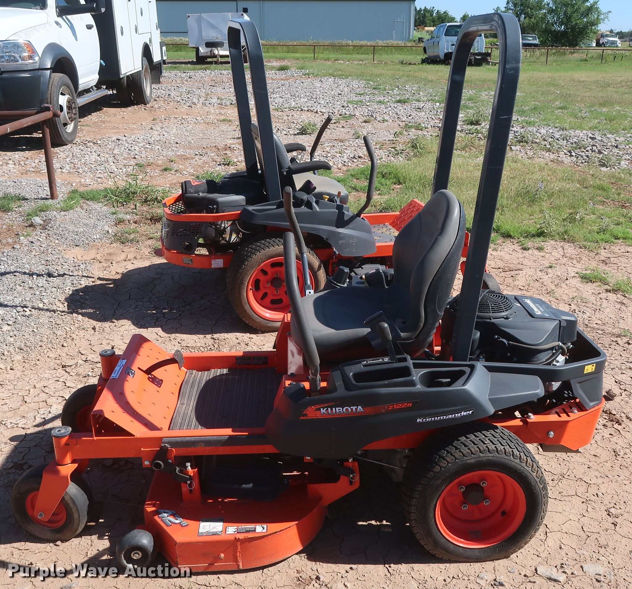 Purple Wave is selling a used Lawn Mower in Oklahoma. This item is a 2016 Kubota Z122RKW ZTR lawn mower with the following: 52 hours on meter, 42" cutting width, Kawasaki FR651V 726cc two cylinder gas engine, 21.5 HP, Serial FR651VD17881, Hydrostatic transmission, PTO, Kubota RCK42P-122Z mower deck, Serial 23593, 11x4.00-5 front tires, 18x7.5-10 rear tires, Unknown operating condition, Serial 22505