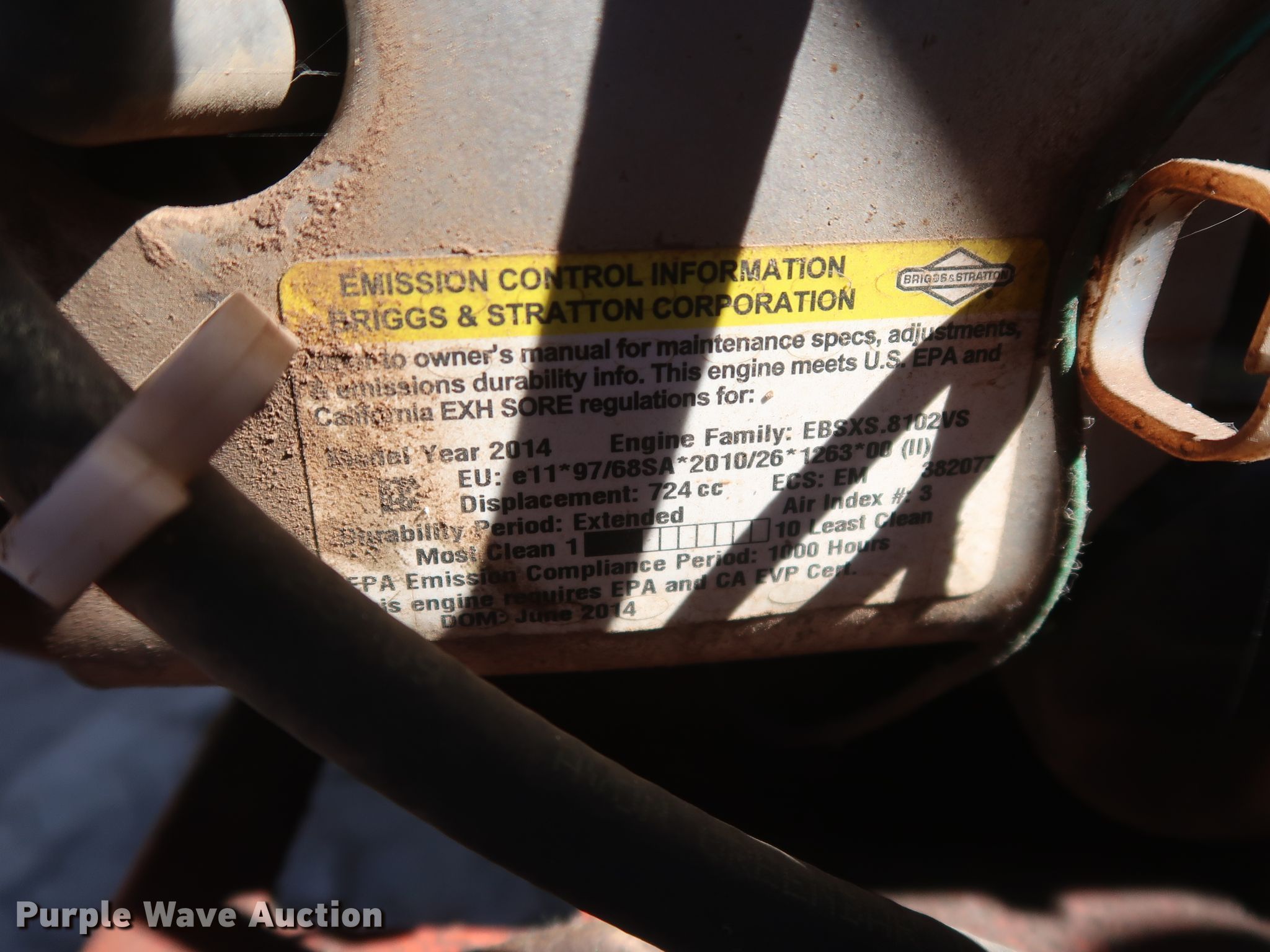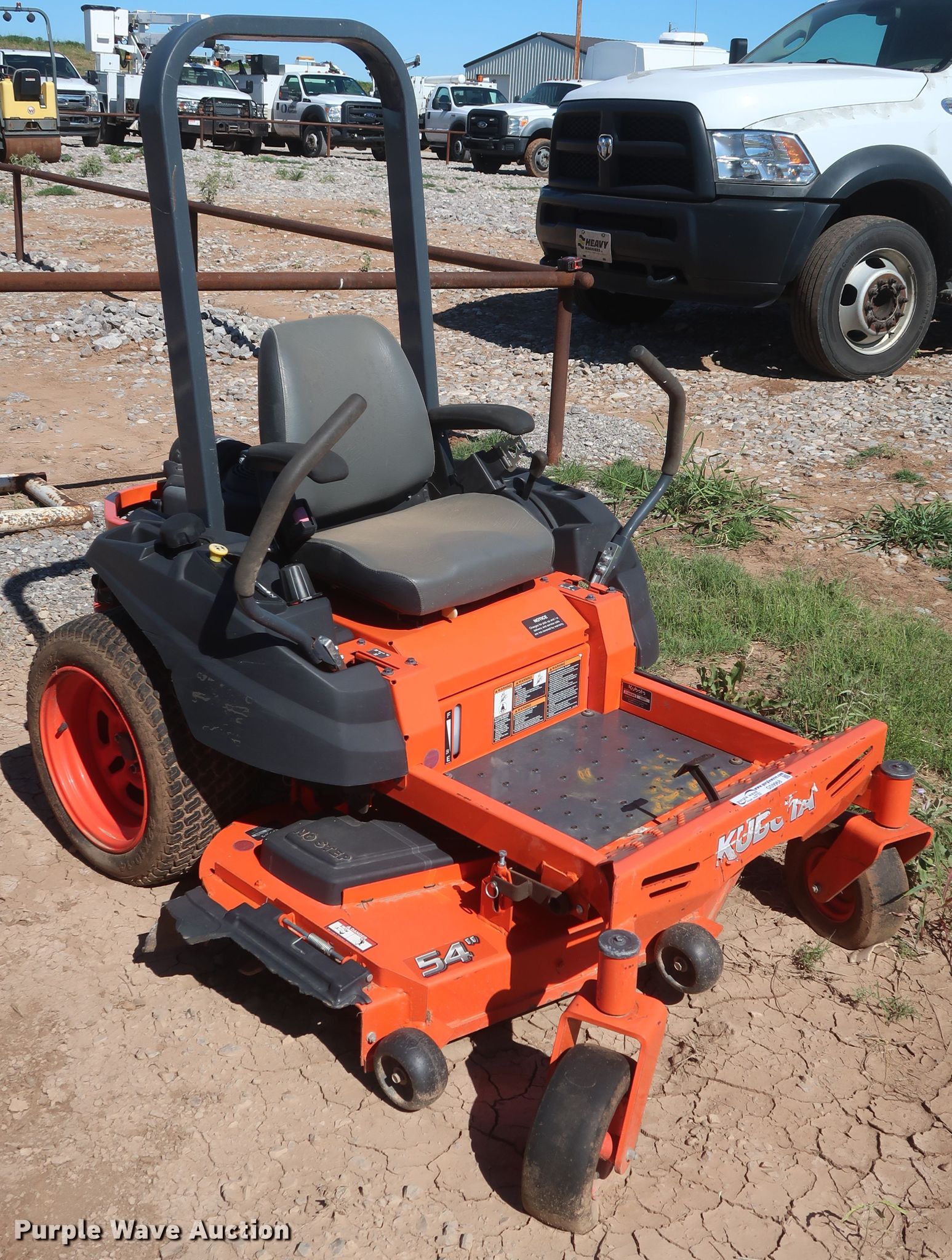 Purple Wave is selling a used Commercial Turf Mower in Oklahoma. This item is a 2014 Kubota Z125EBR ZTR lawn mower with the following: 215 hours on meter, 54" cutting width, Briggs & Stratton 724cc two cylinder gas engine, 25 HP, Serial 140605YG01447, Hydrostatic transmission, PTO, Kubota RCK54P-127ZA mower deck, Serial 17204, 11x4.00-5 front tires, 22x10-14 rear tires, Unknown operating condition, Serial 12271