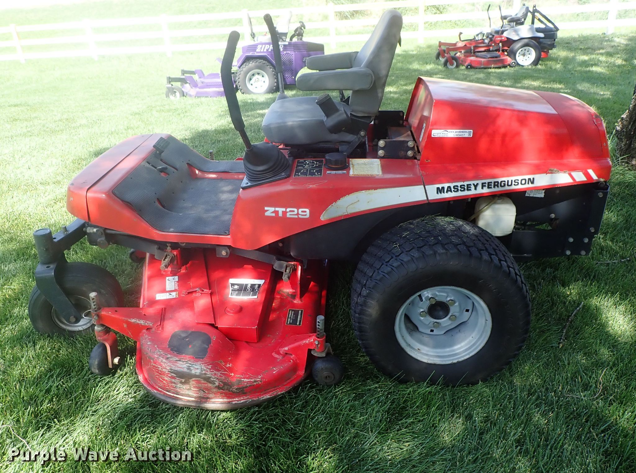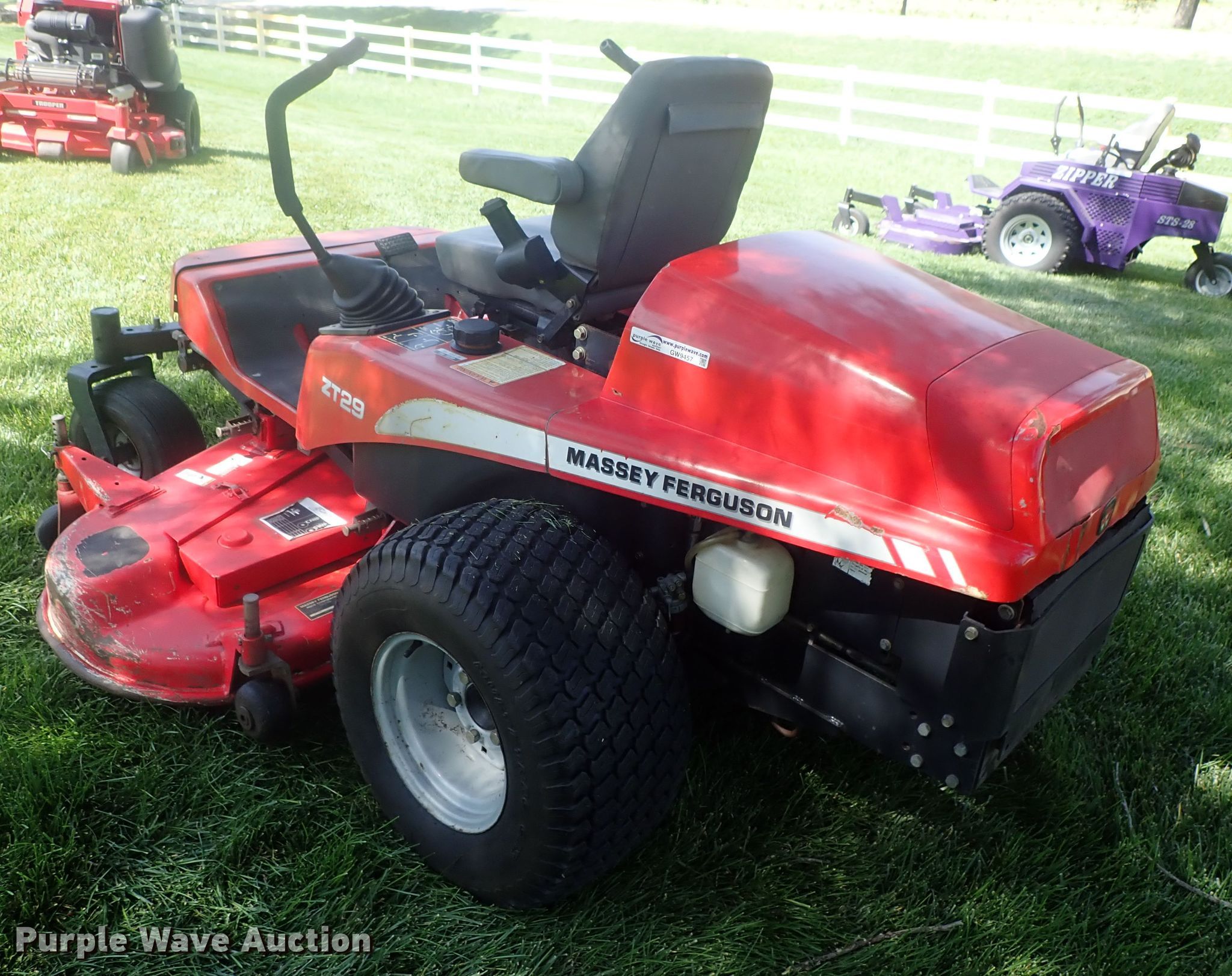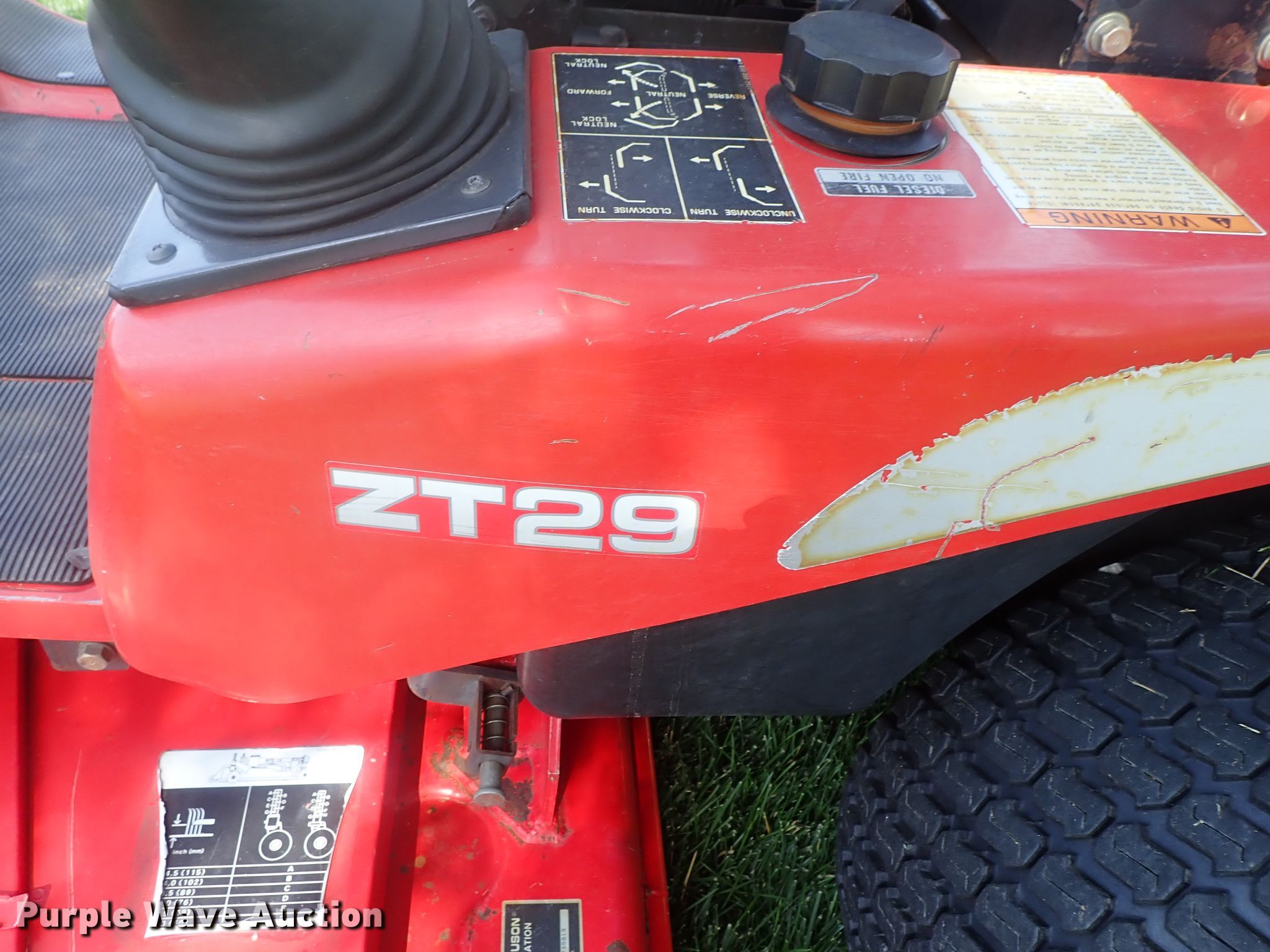 Purple Wave is selling a used Commercial Turf Mower in Kansas. This item is a Massey Ferguson ZT29 ZTR lawn mower with the following: 1,368 hours on meter, 60"W cutting width, Three cylinder diesel engine, Hydrostatic transmission, 15x8.00-6 front tires, 26x12.00-12 rear tires