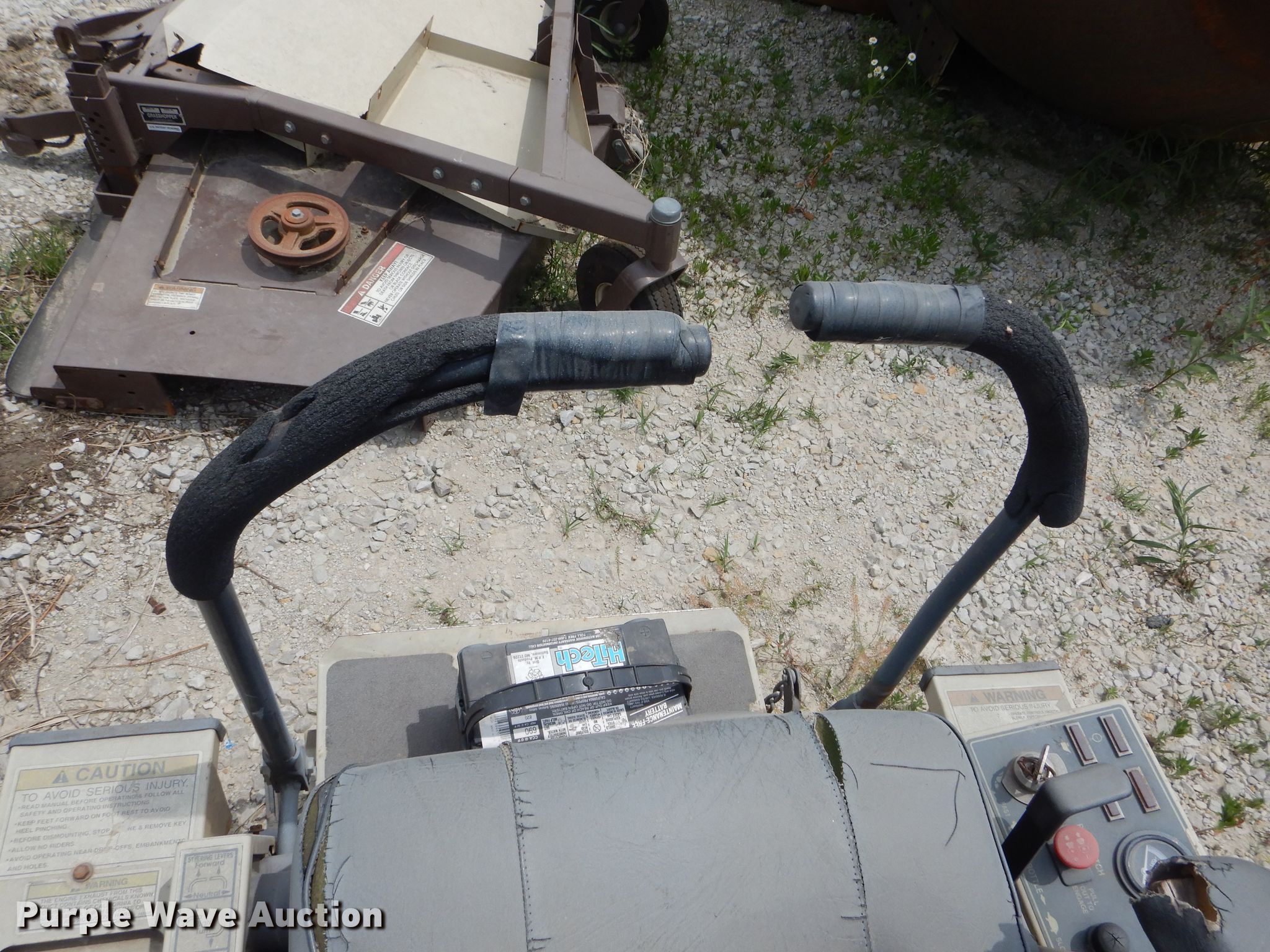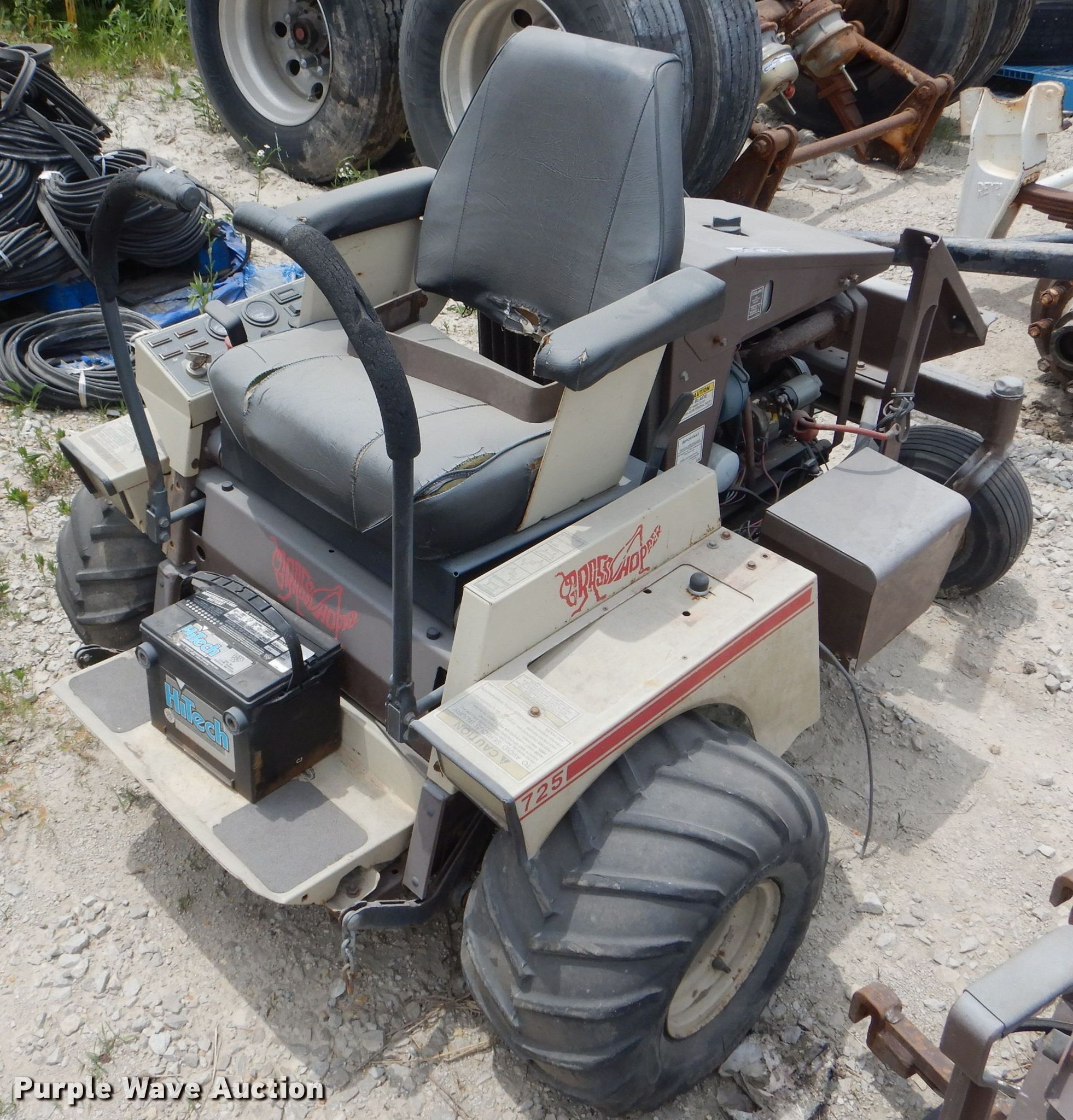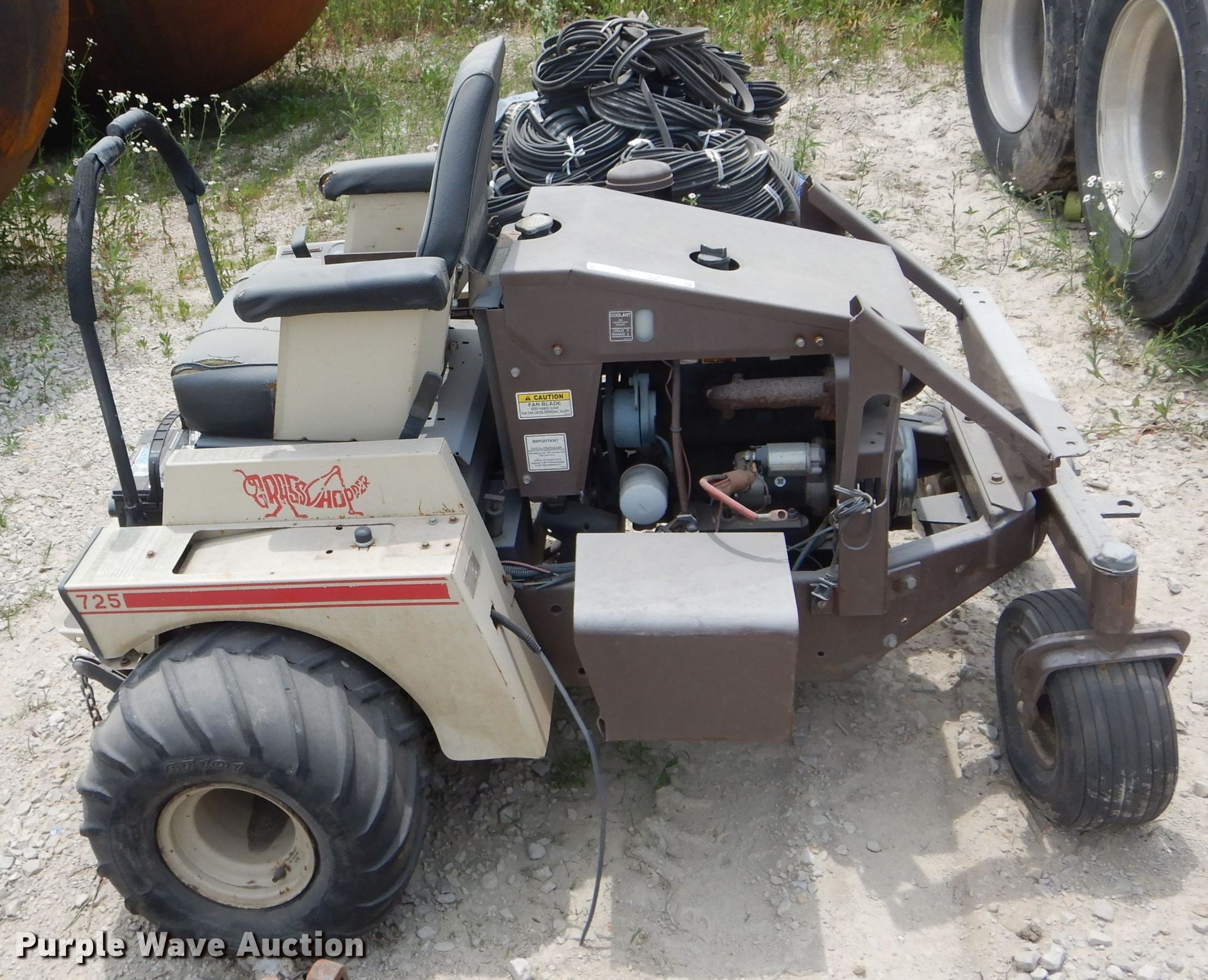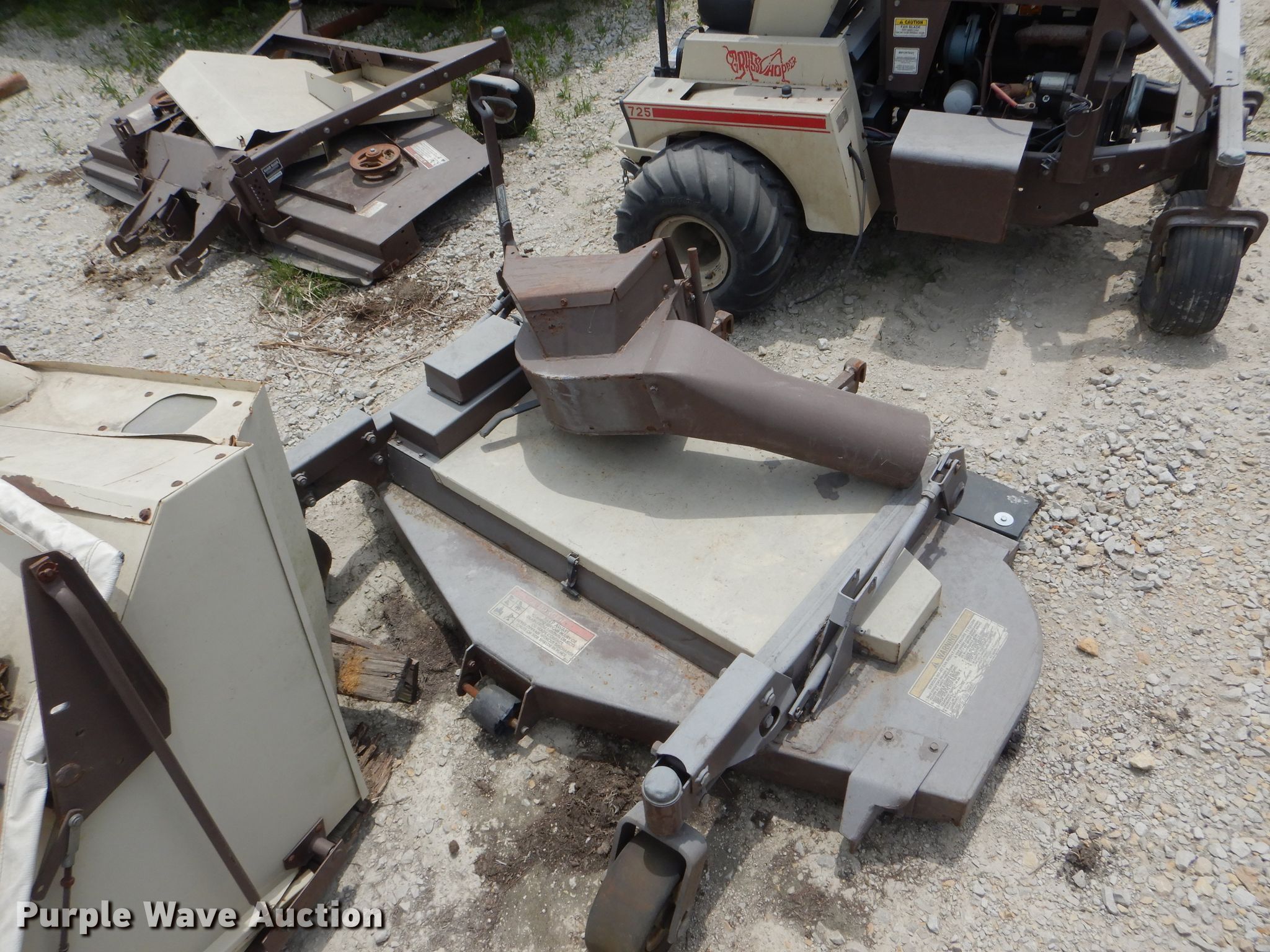 Purple Wave is selling a used Commercial Turf Mower in Iowa. This item is a Grasshopper 725 ZTR lawn mower with the following: 72"W mower deck, Three cylinder gas engine, Hydrostatic transmission, PTO, Grasshopper 9572 mower deck, Additional 62"W mower deck, 21x11.00-8 front tires, 11x600-6 rear tires